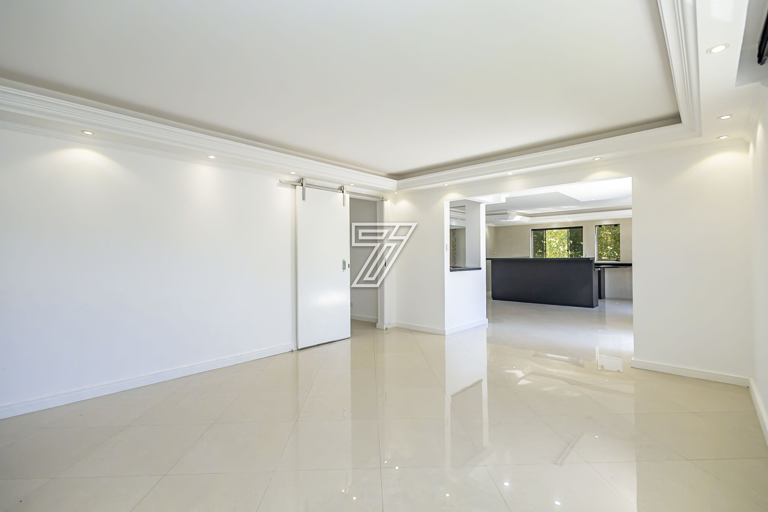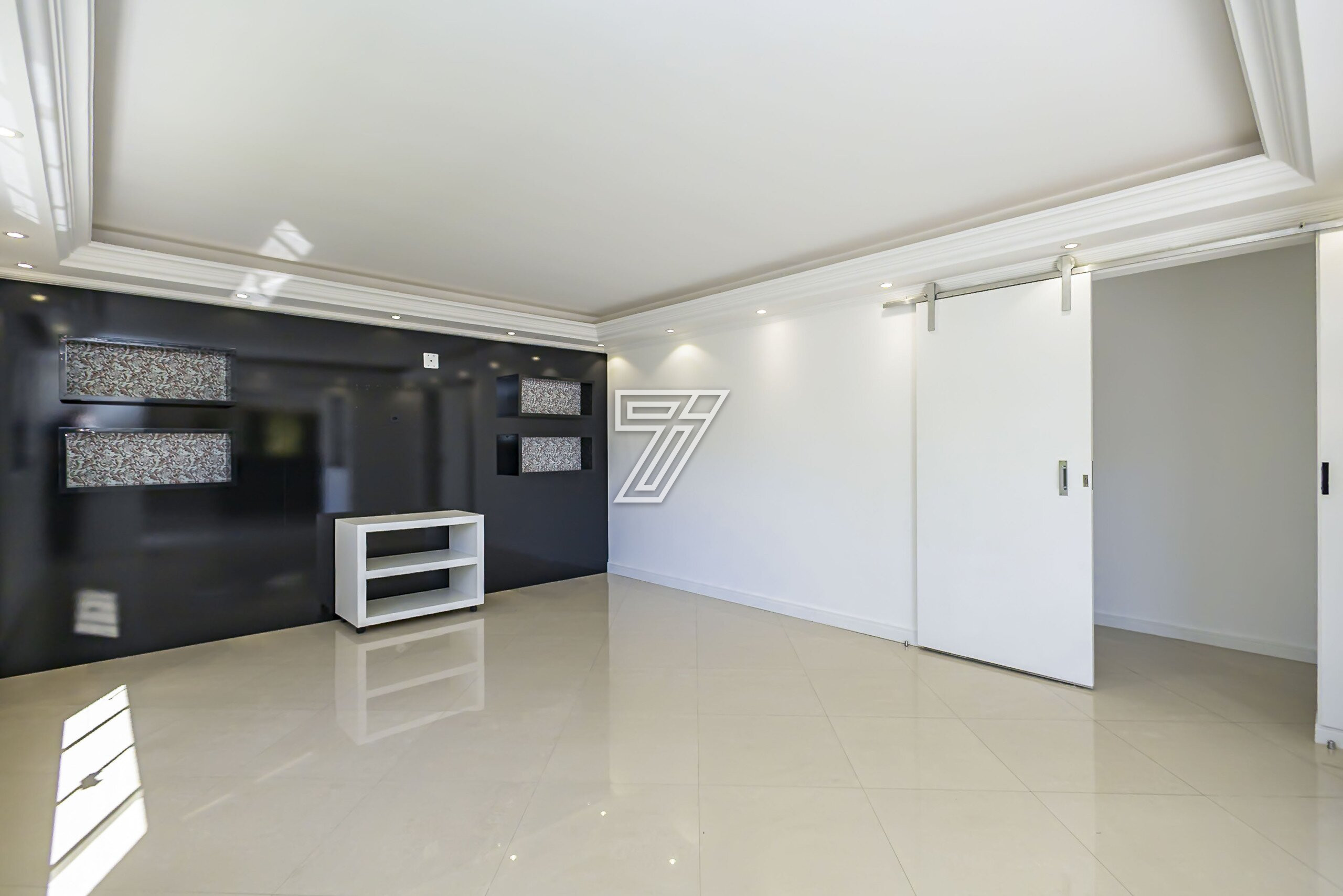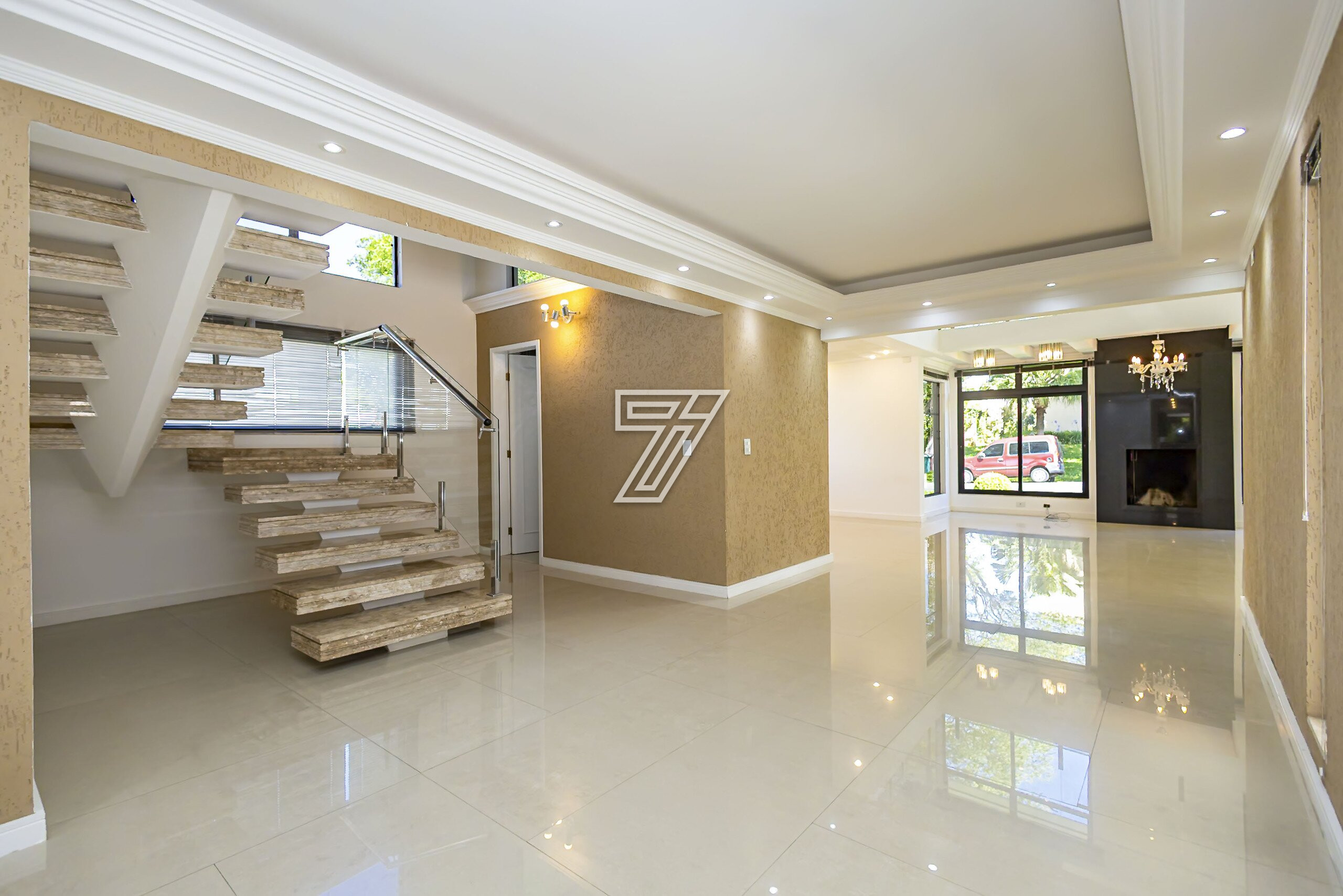 O living, distribuído em três ambientes, apresenta um espaço amplo e imponente, com pé-direito duplo, lustre decorativo, lareira e sancas em gesso com iluminação embutida, criando um ambiente acolhedor e perfeito para receber.