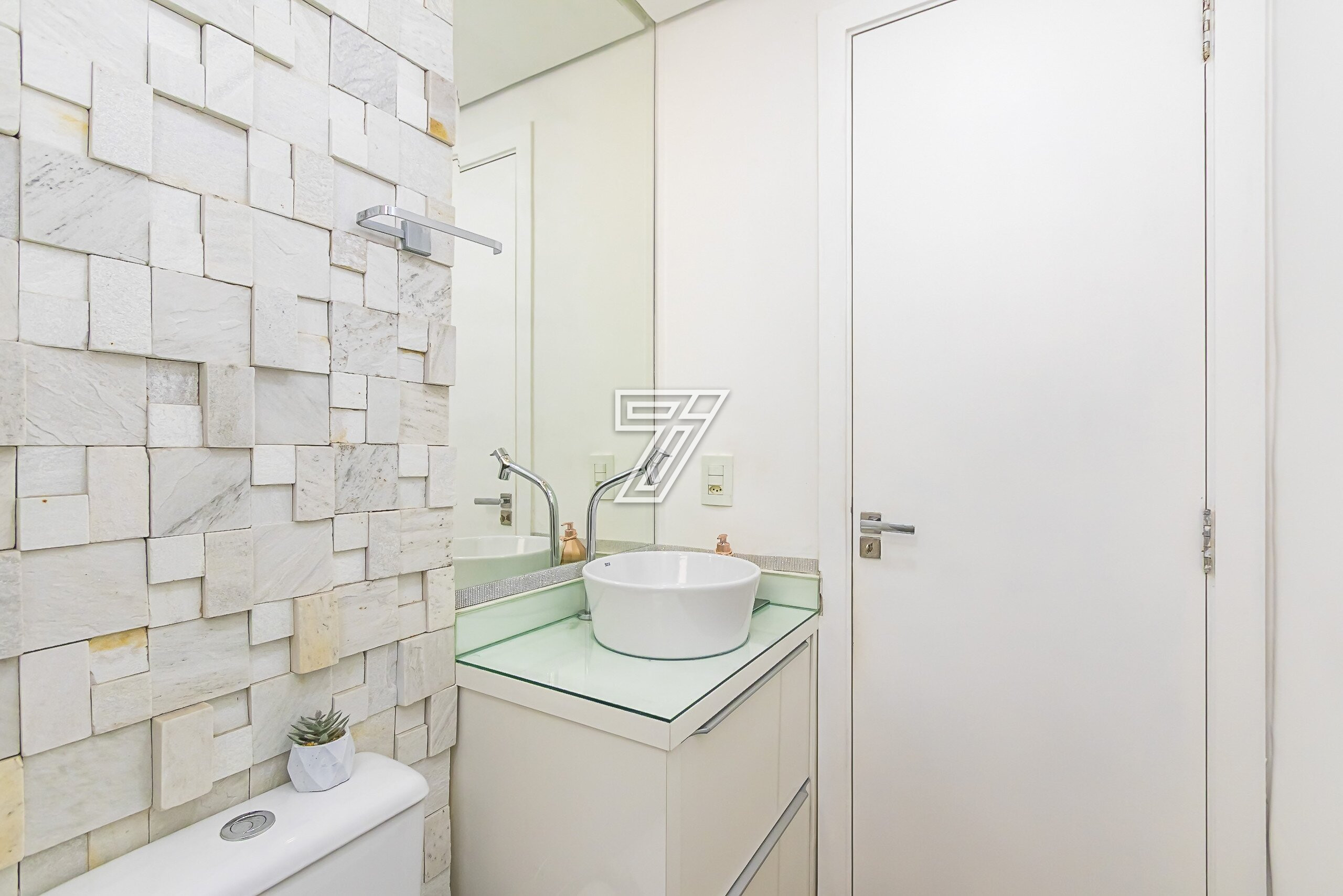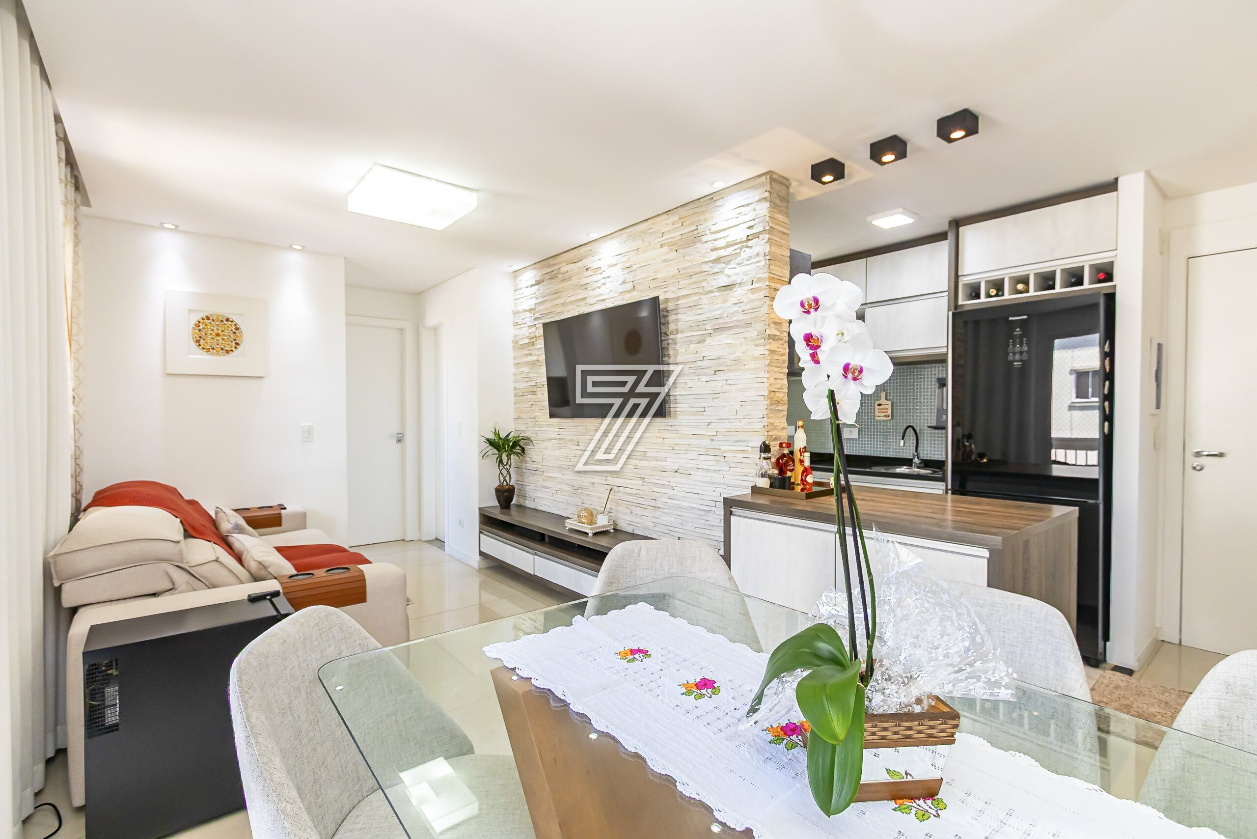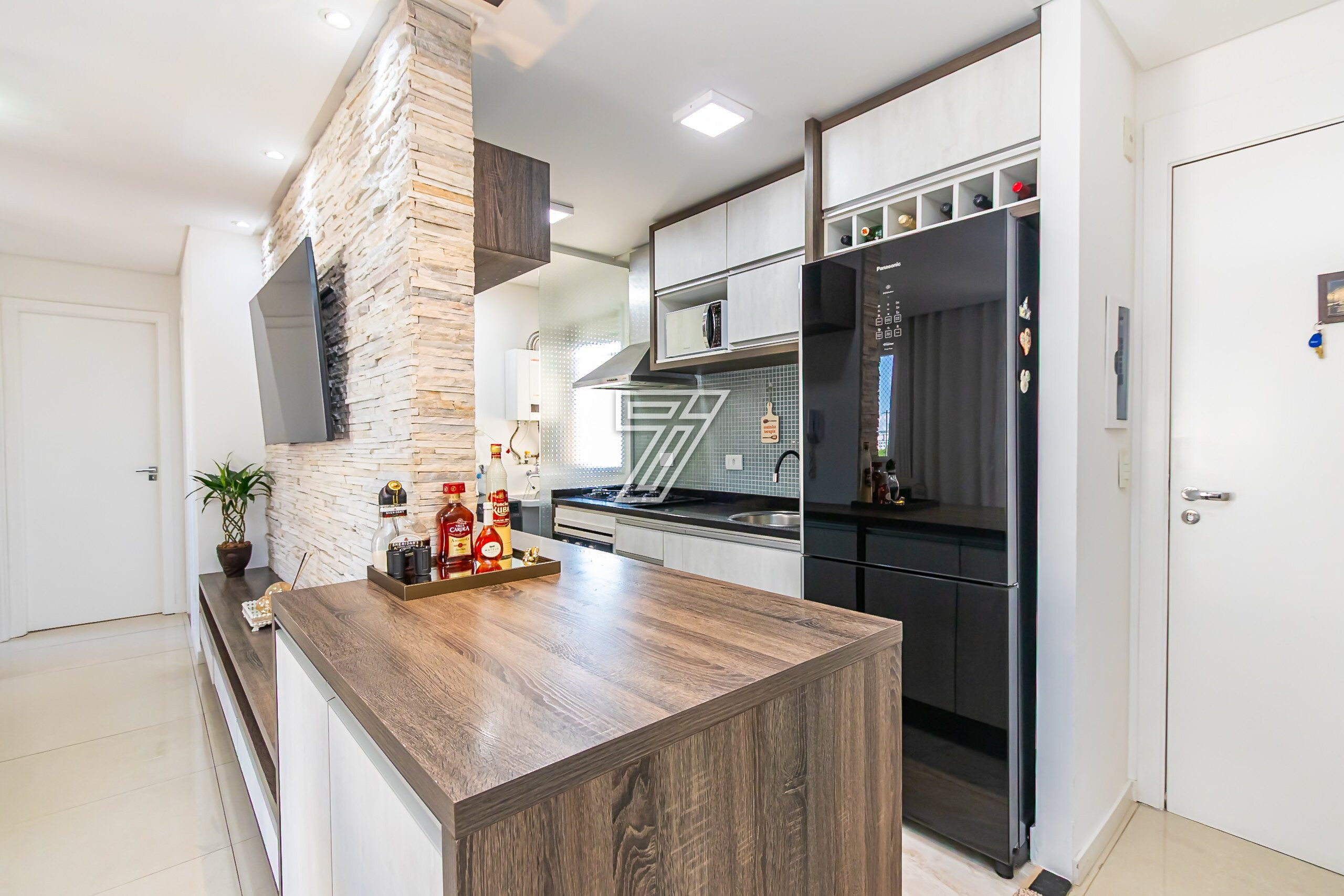 Apartamento semi mobiliado, andar alto, com excelente padrão de acabamento com 2 quartos com 57,33 de área privativa, ambientes integrados cozinha mobiliada estilo americano, piso em porcelanato, sala com painel parede revestida com pedra São Tomé filete, hall de entrada com pedra São Tomé 10 x 10 e espelho, teto rebaixando em gesso, com iluminação com uma sacada ampla com churrasqueira a carvão com sistema reiki, e armário planejado, quartos com ármarios planejados e piso laminado, quarto do casal completo cama embutida, banheiro com ventilação natural e sistema a gás, com pedra revestida São Tomé, entrar e morar