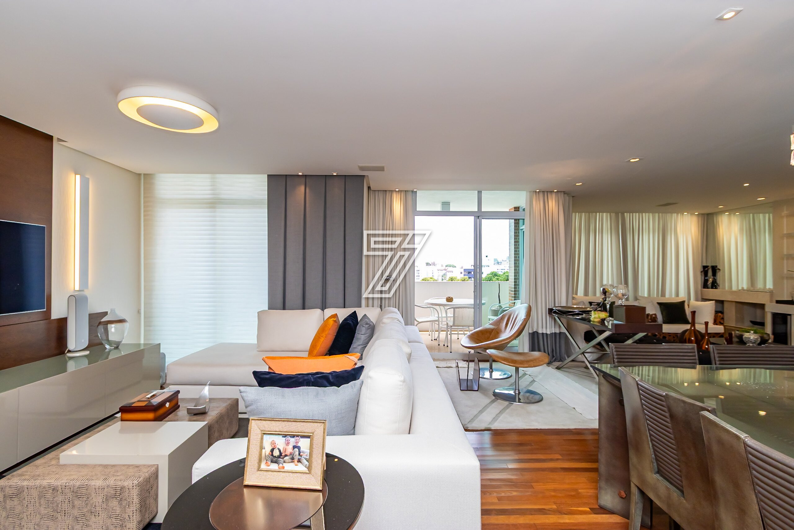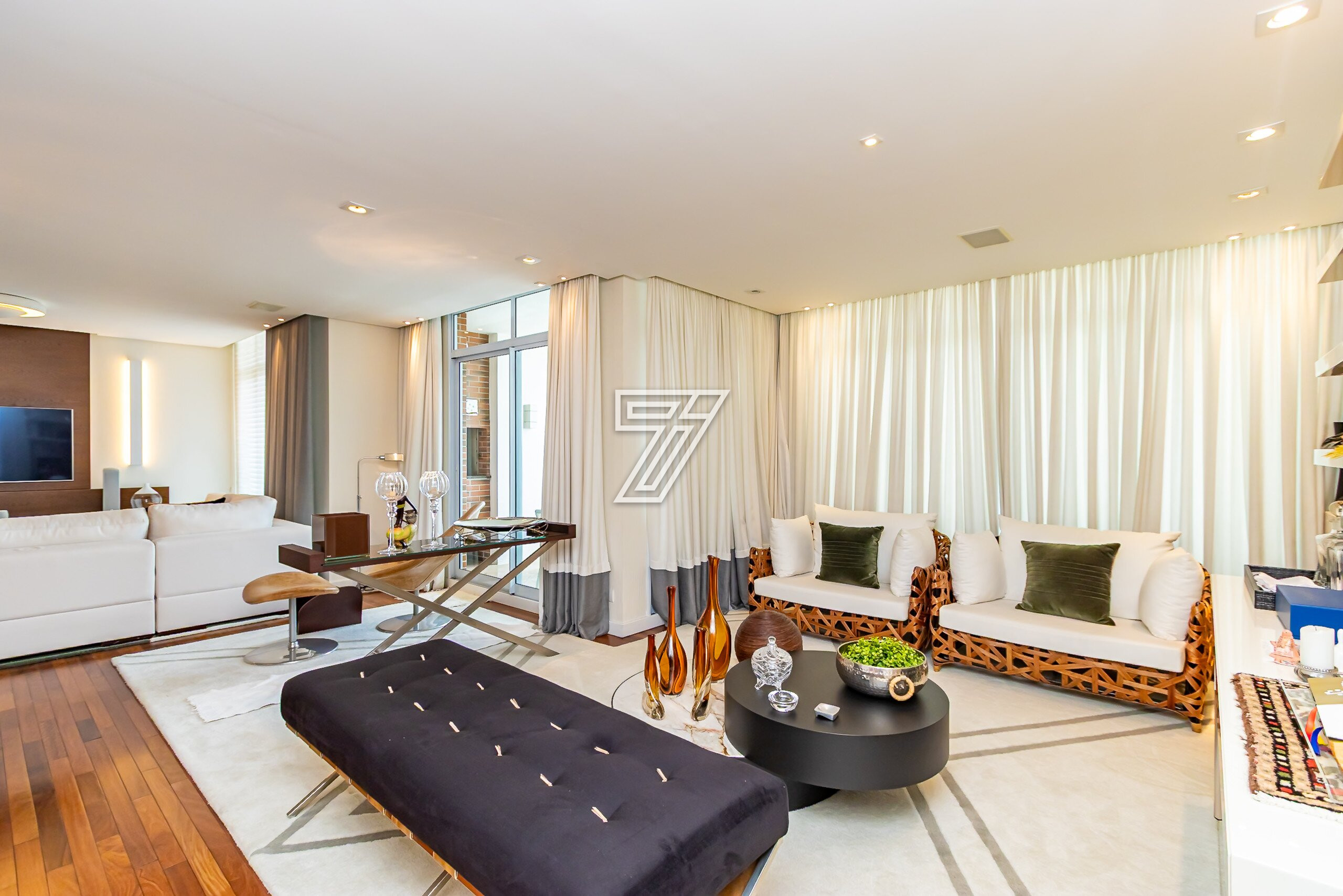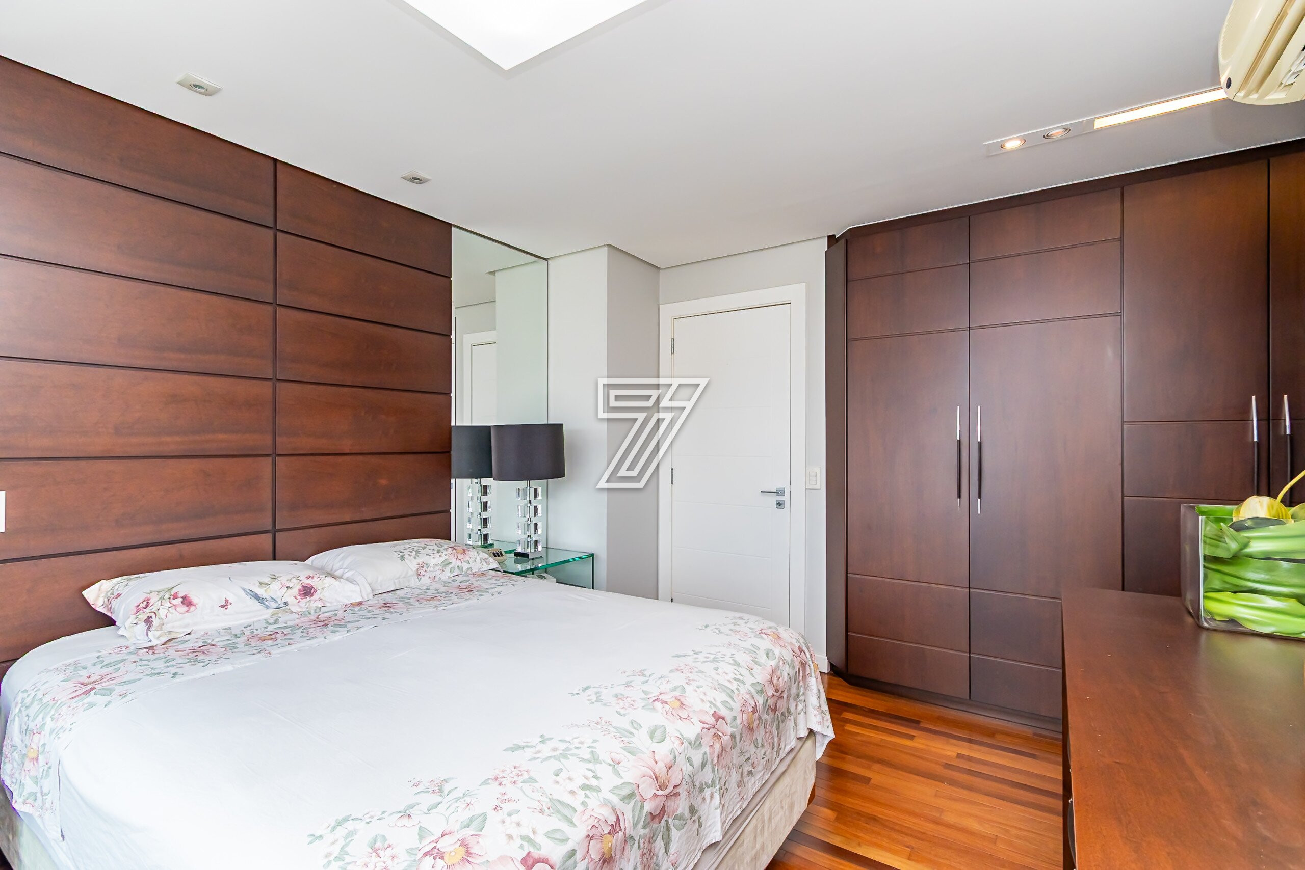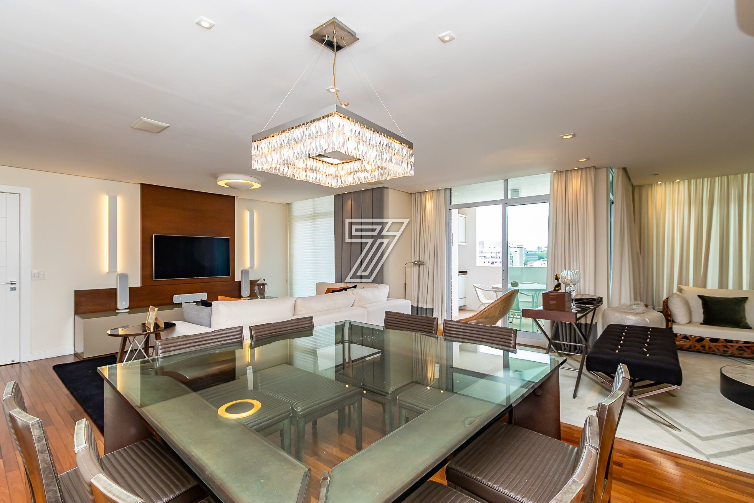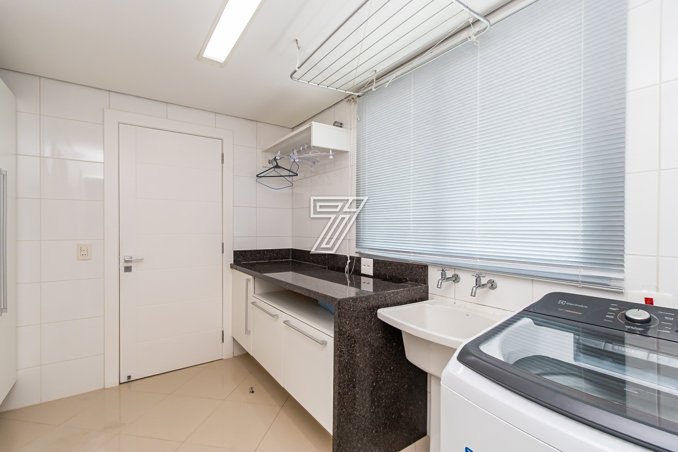 Com 3 dormitórios (3suítes), a suíte master com hidromassagem, 174m² privativos, uma ampla sala para 2 ambientes com uma sacada integrada (com churrasqueira à carvão), cozinha com móveis planejados, área de serviço completa (com dependência de empregada e água quente e fria no tanque), lavabo, banheiro social e duas vagas na garagem. Com móveis planejados de excelente padrão, na cozinha, dormitórios, ar condicionado, cortinas, venezianas e persianas, eletrodomésticos importados (fogão Lofra, máquina de lavar com apenas 6 meses de uso, geladeira side by side, ar condicionado em todos os ambientes). Com 2 vagas amplas e um depósito exclusivo na garagem.