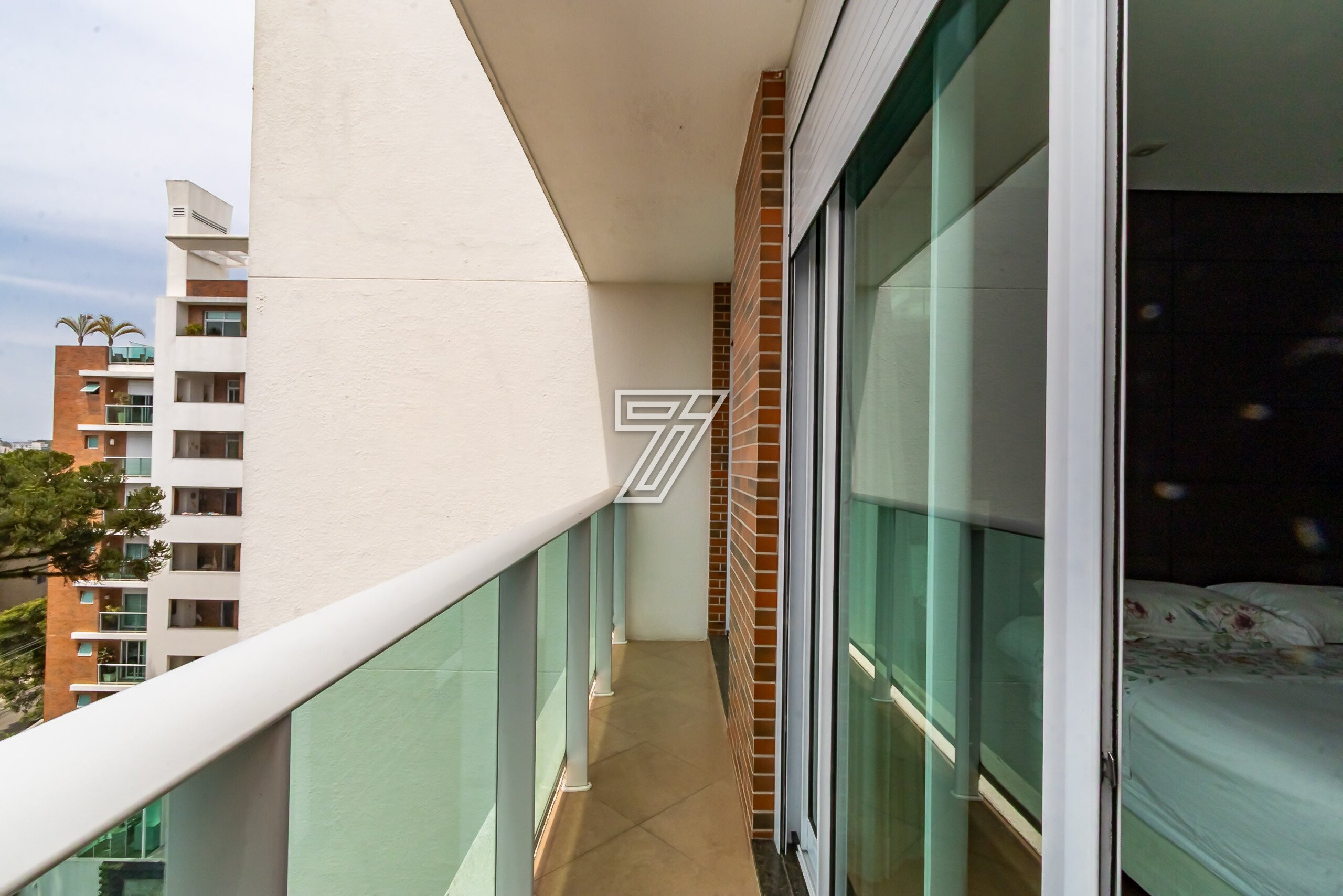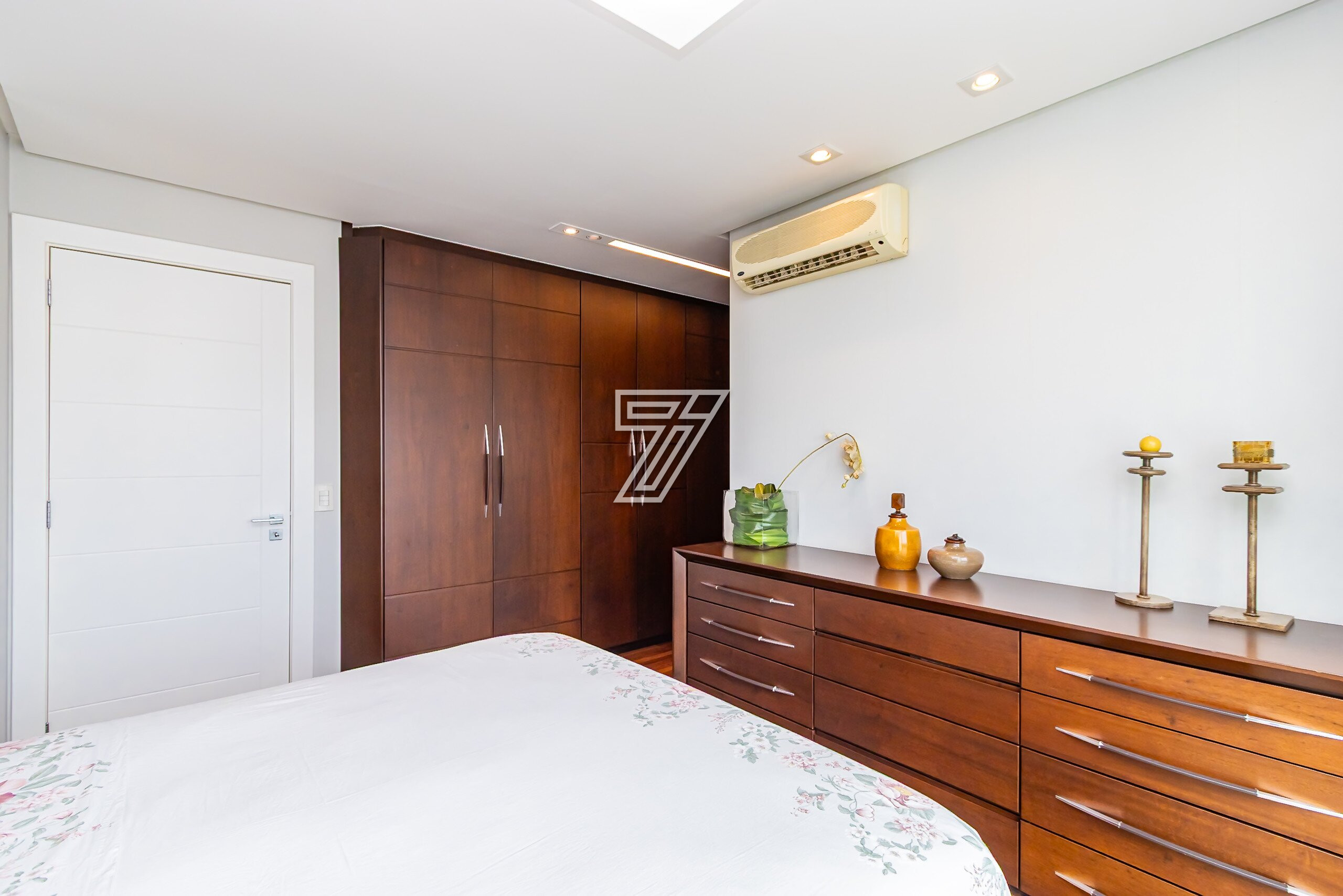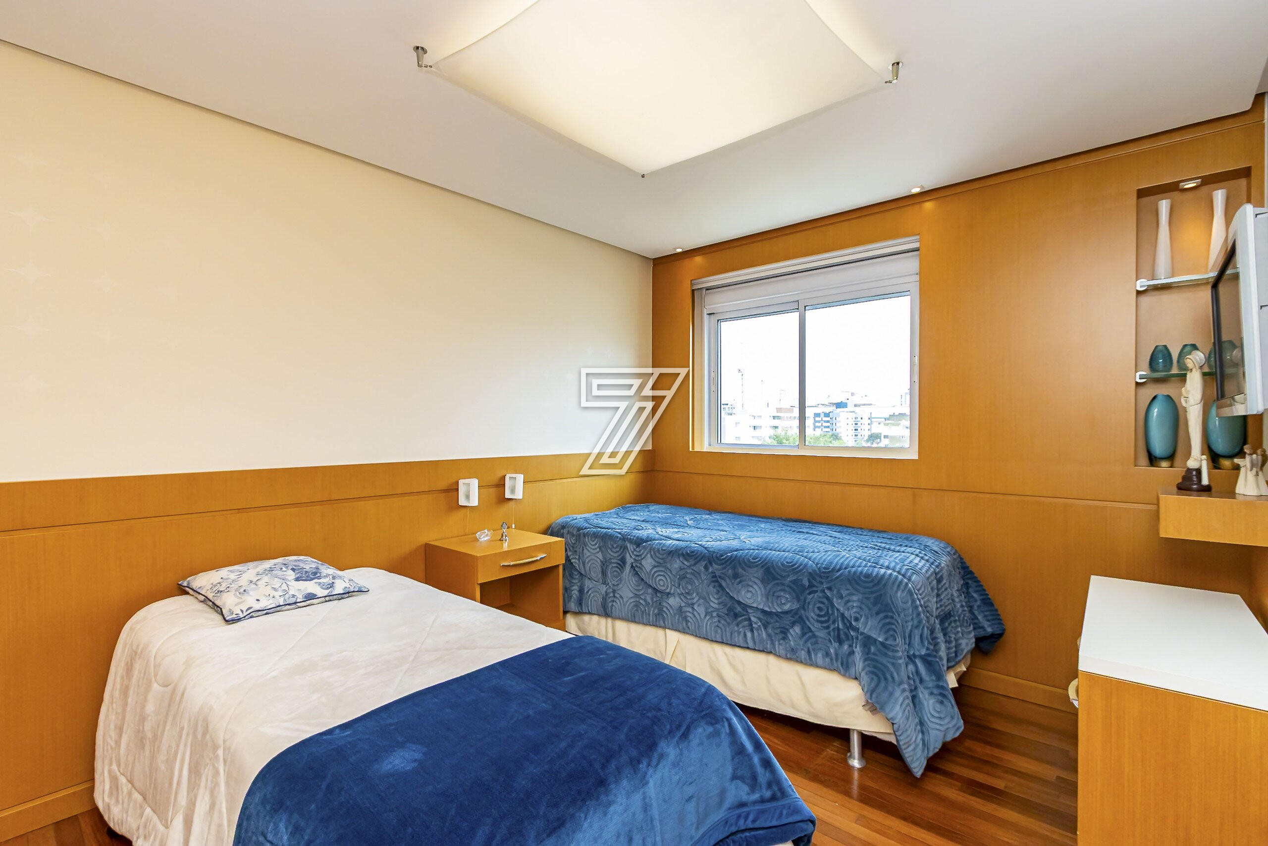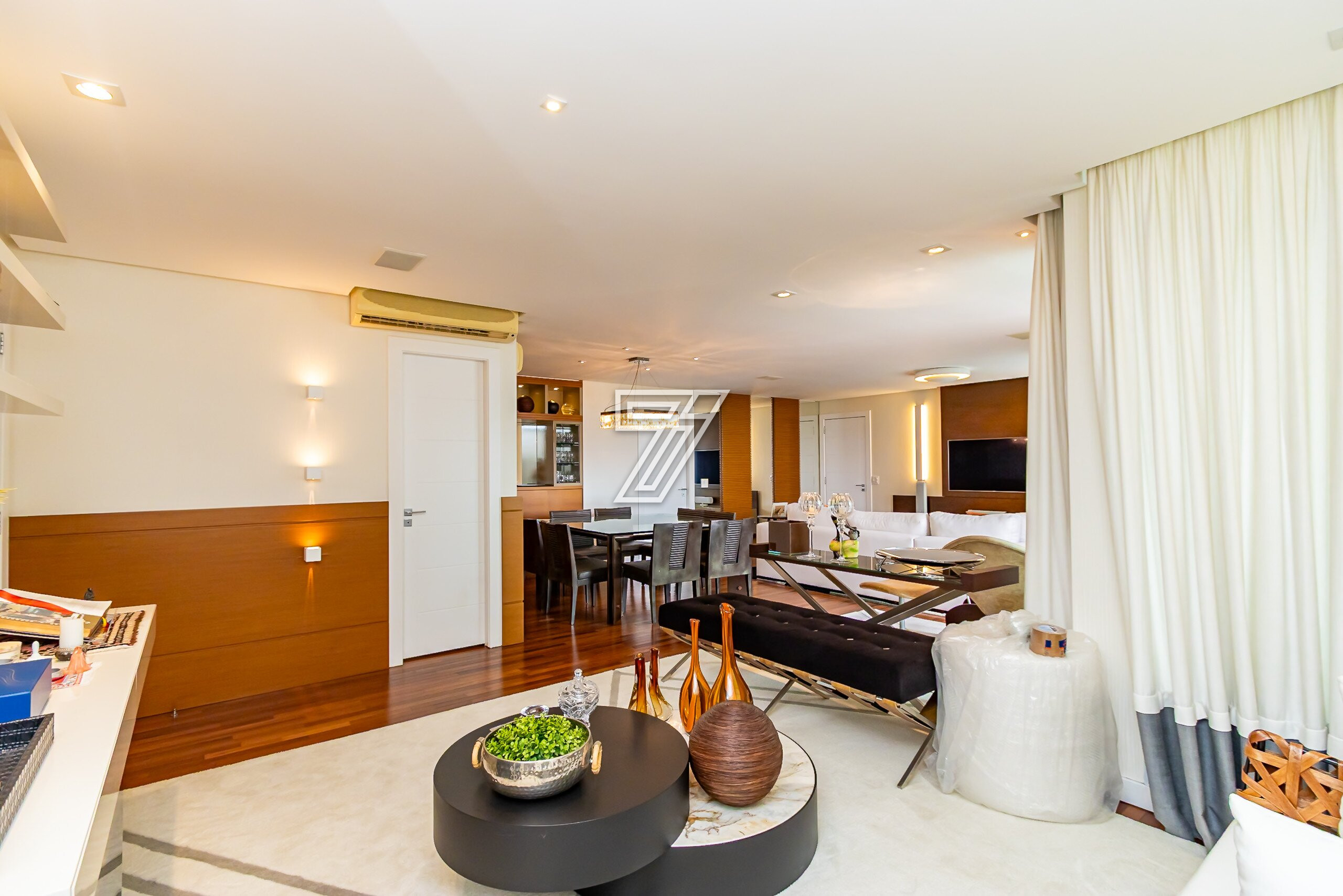 Com 3 dormitórios (3suítes), a suíte master com hidromassagem, 174m² privativos, uma ampla sala para 2 ambientes com uma sacada integrada (com churrasqueira à carvão), cozinha com móveis planejados, área de serviço completa (com dependência de empregada e água quente e fria no tanque), lavabo, banheiro social e duas vagas na garagem. Com móveis planejados de excelente padrão, na cozinha, dormitórios, ar condicionado, cortinas, venezianas e persianas, eletrodomésticos importados (fogão Lofra, máquina de lavar com apenas 6 meses de uso, geladeira side by side, ar condicionado em todos os ambientes). Com 2 vagas amplas e um depósito exclusivo na garagem.