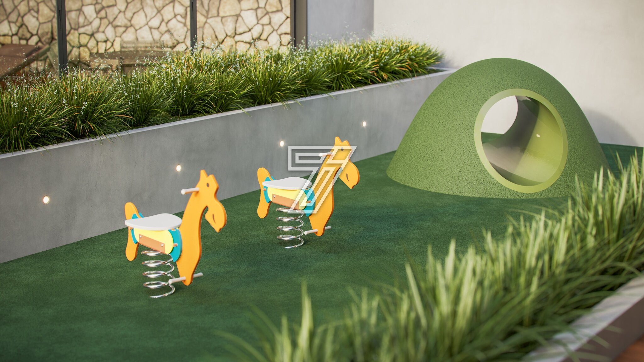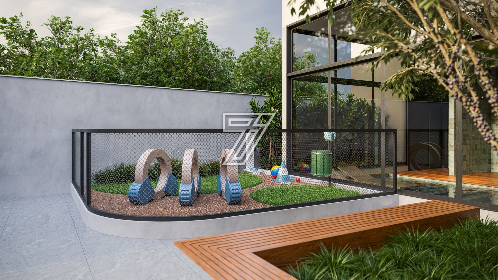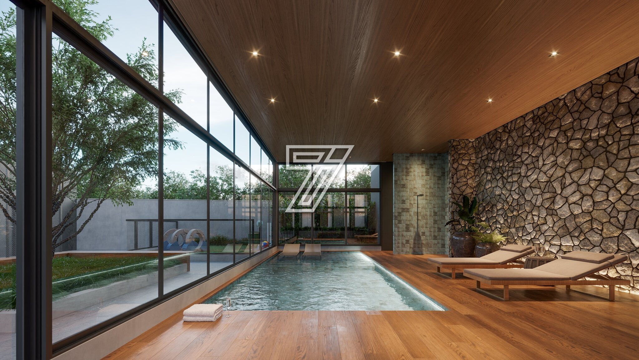 Port-cochère, Hall de entrada, Central de entregas e delivery, Praça central, Sala de reuniões, Espaço relax, Brinquedoteca, Academia, Salão de festas, Lounge externo, Playground, Espaço pet, Quadra de beach, Piscina coberta, Bicicletário com oficina, Gerador de emergência, Sistema de segurança entregue instalado, Eclusa de pedestres, serviço e veículos, Vestiário e copa para funcionários, Carregador para carro elétrico, Vagas para visitantes.