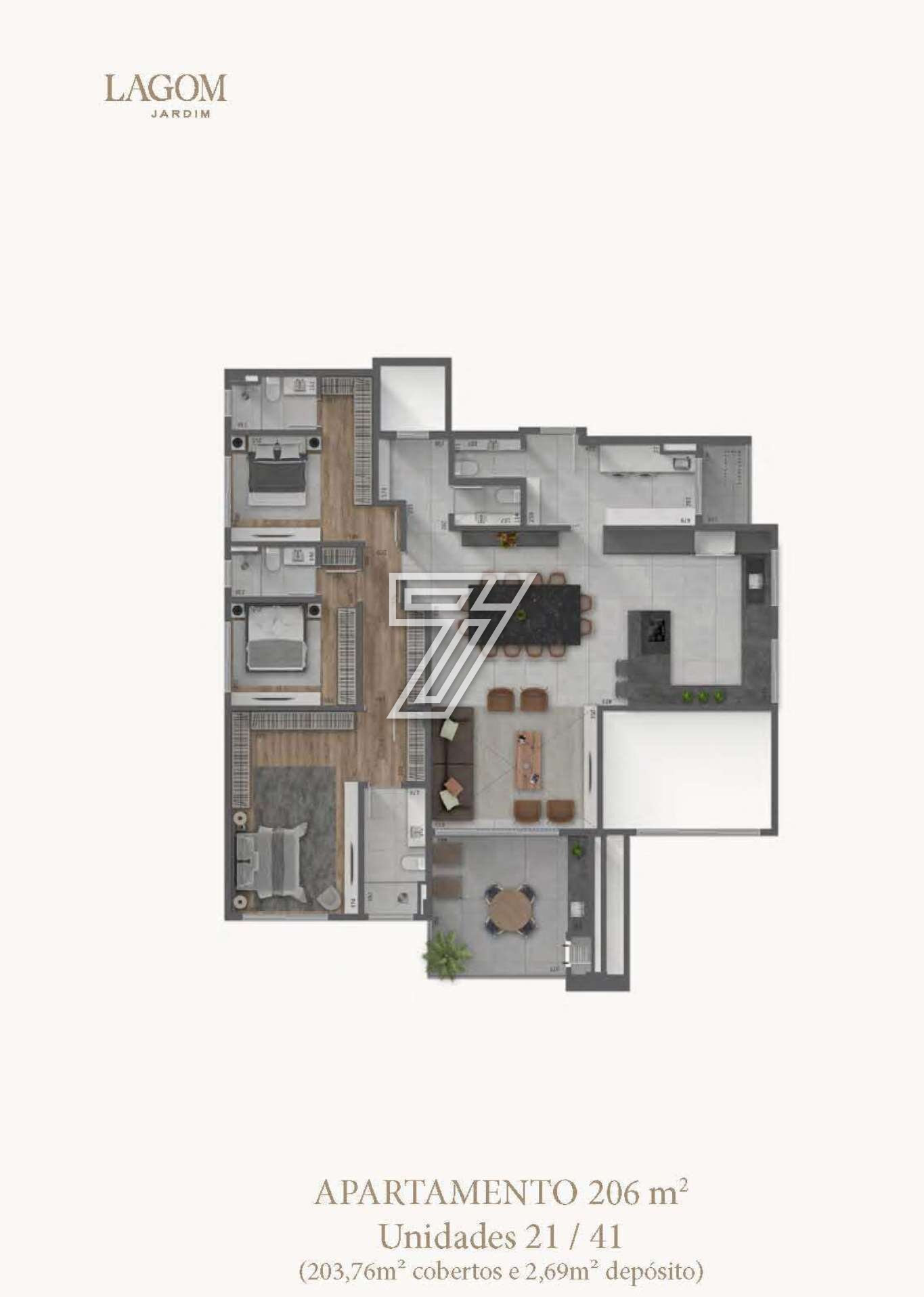 248m² de apartamento + 86m² de jardim externo + 7,30m² de depósito = 342m² privativos