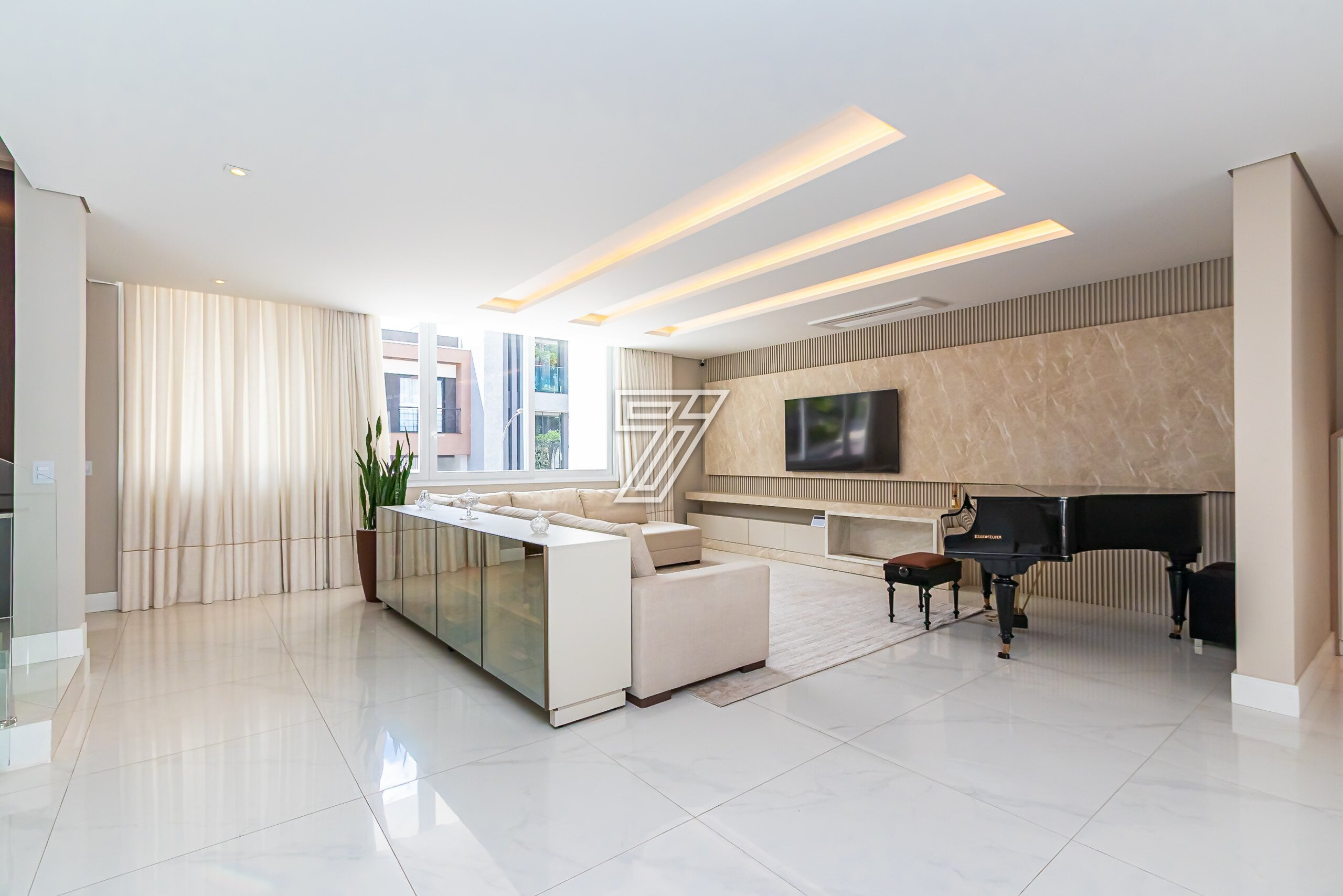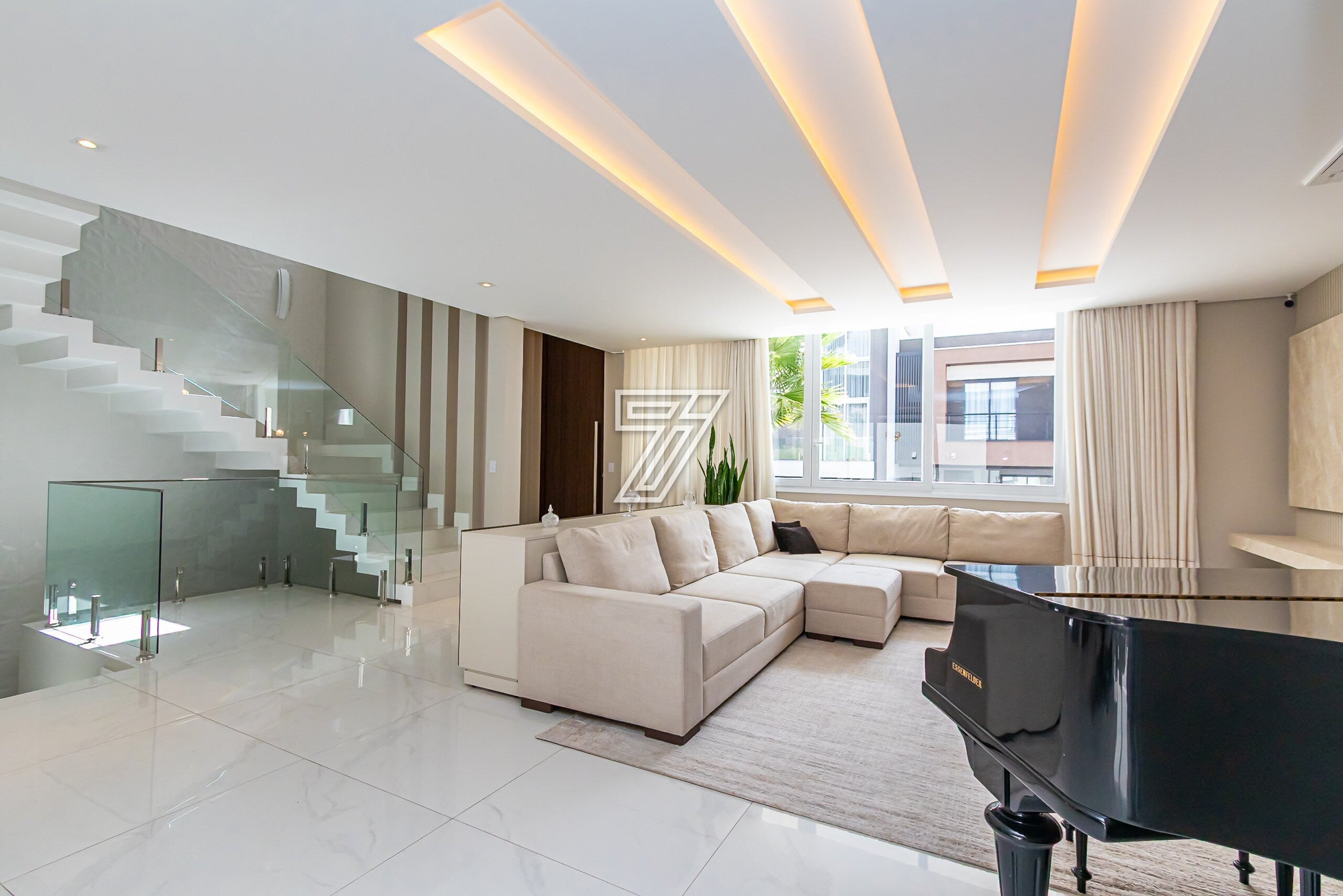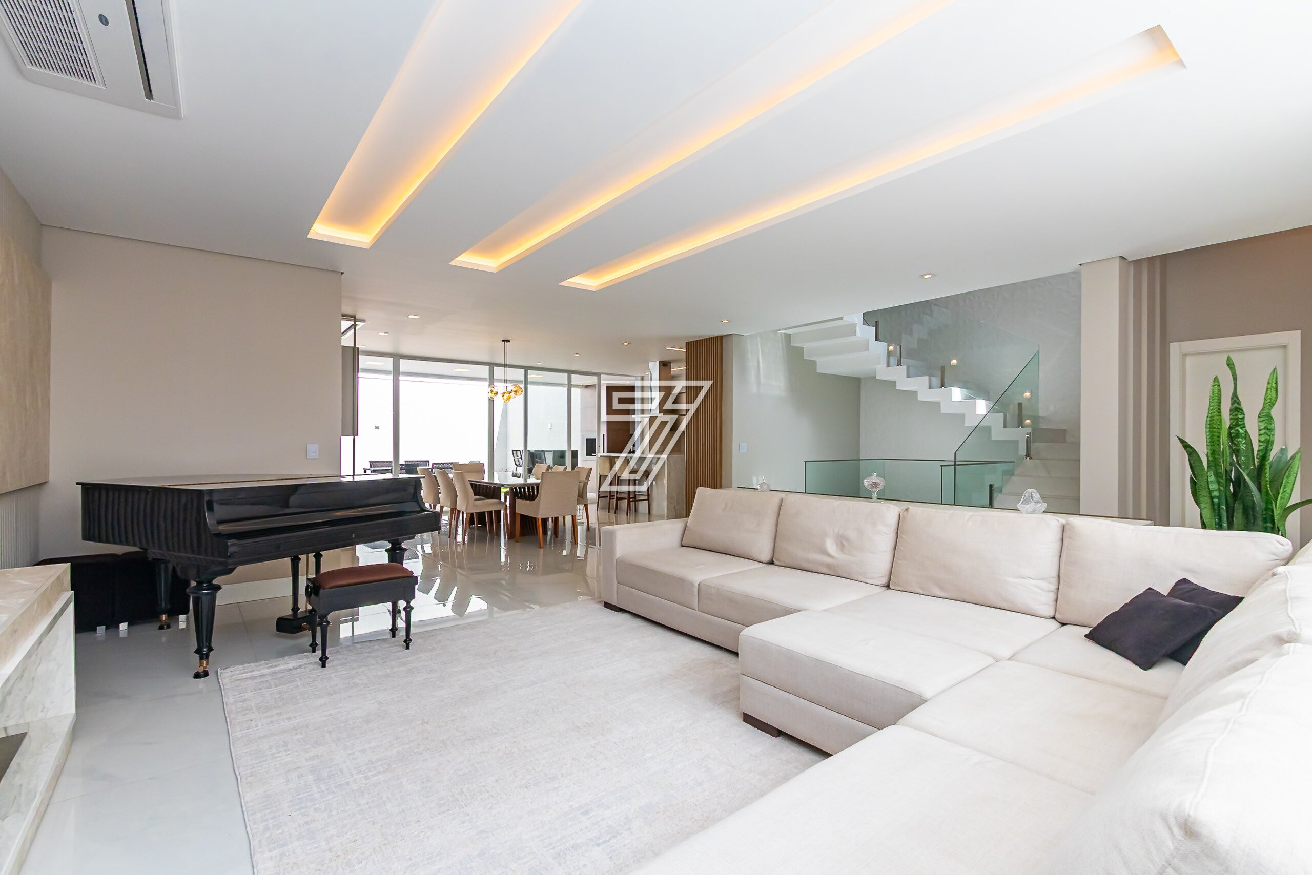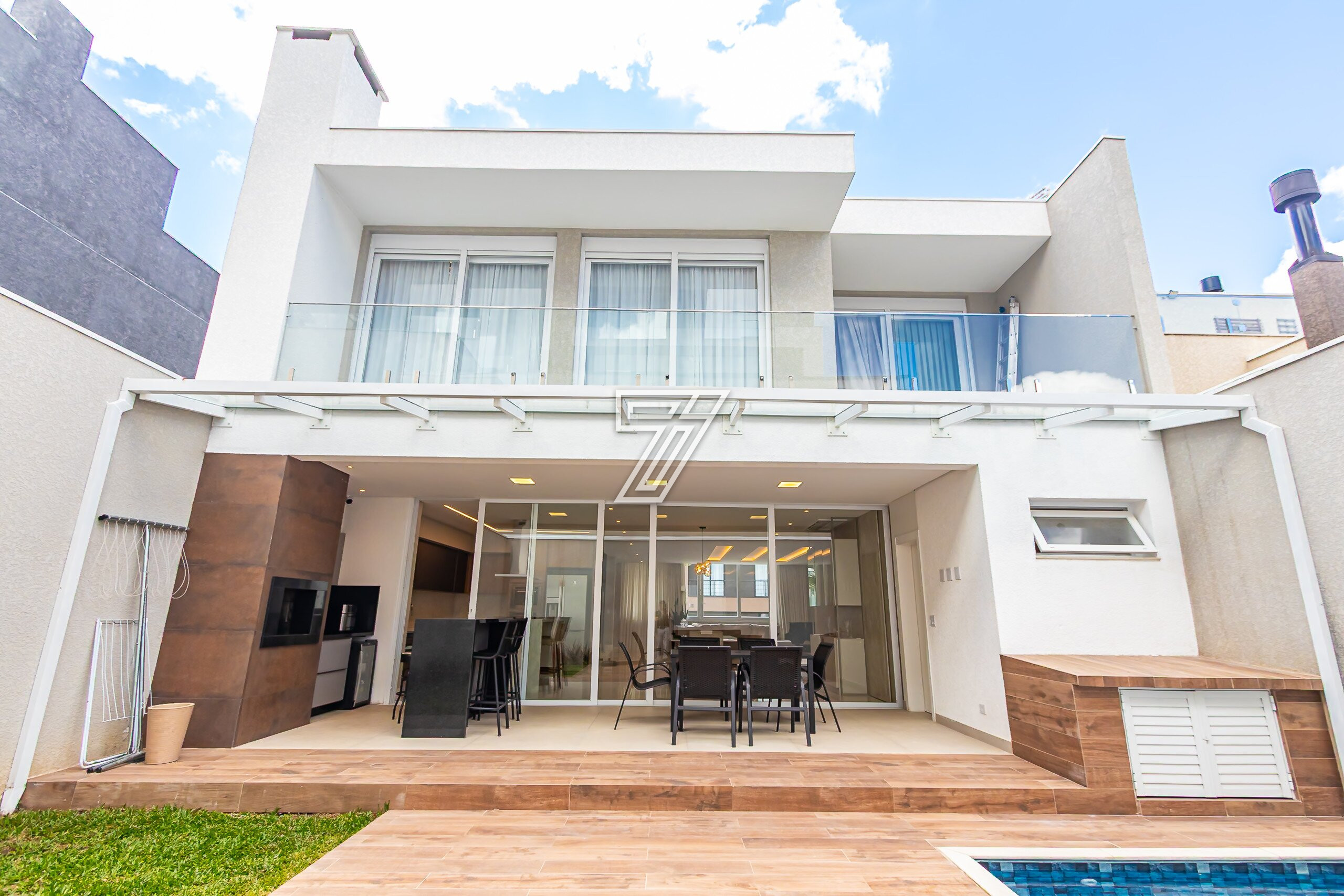 Residência no Condomínio Park Boulevard, com 345 m² de área construída, em condomínio fechado nas proximidades do Parque Barigüi, distribuída em três pavimentos.