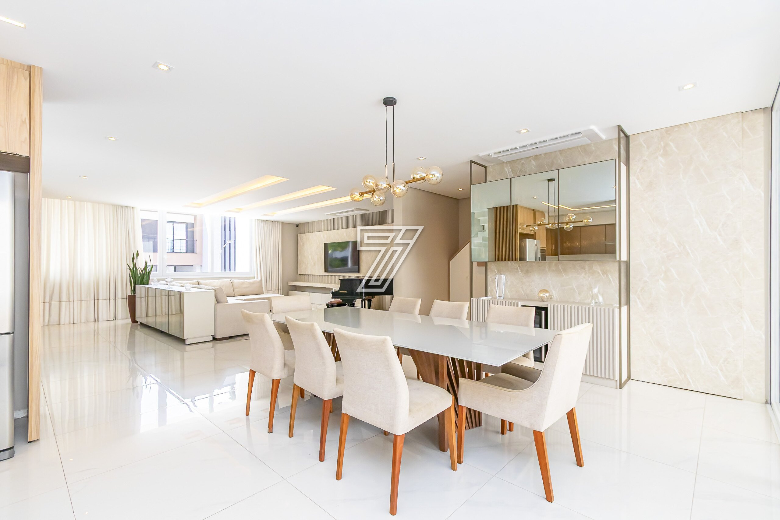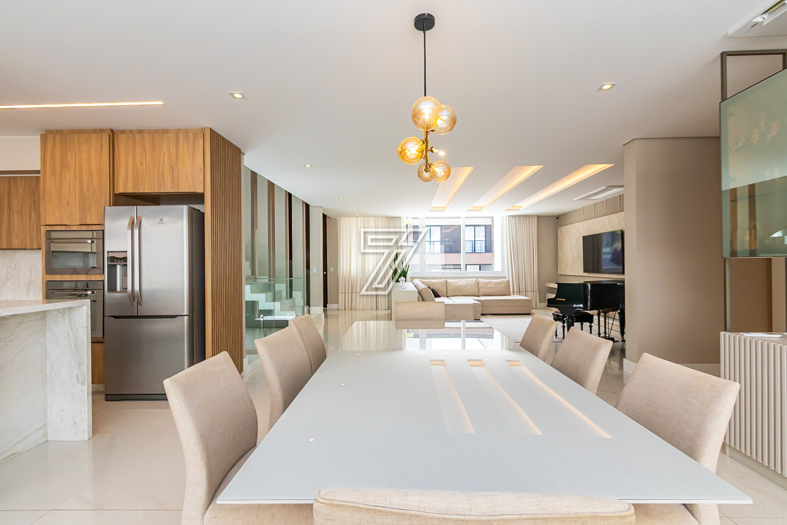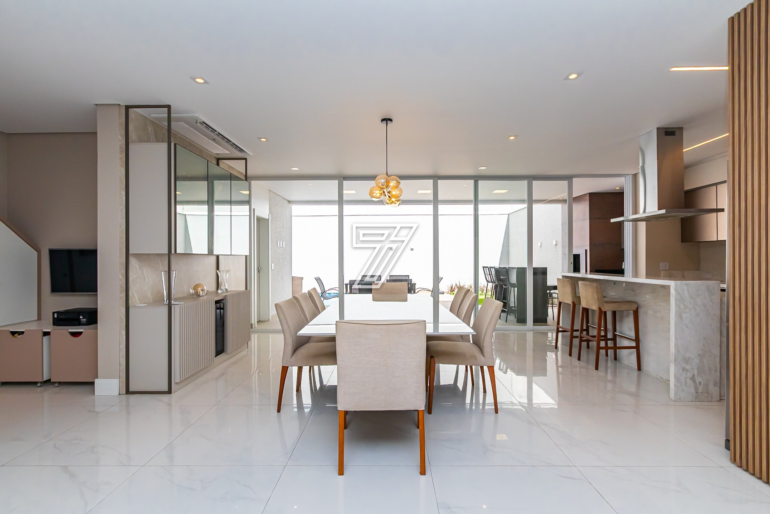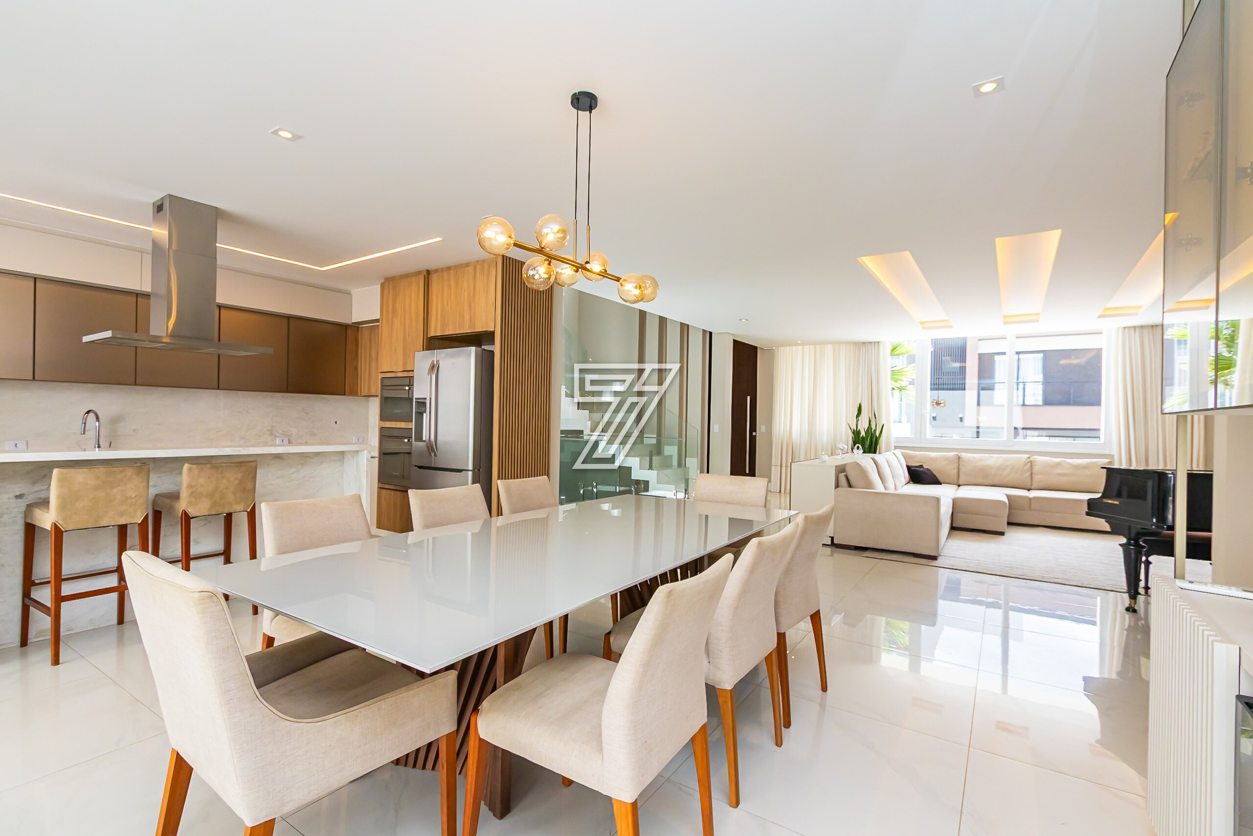 No térreo, ambientes integrados: lavabo, sala de estar e sala de jantar para 8 lugares climatizado com ar-condicionado embutido.