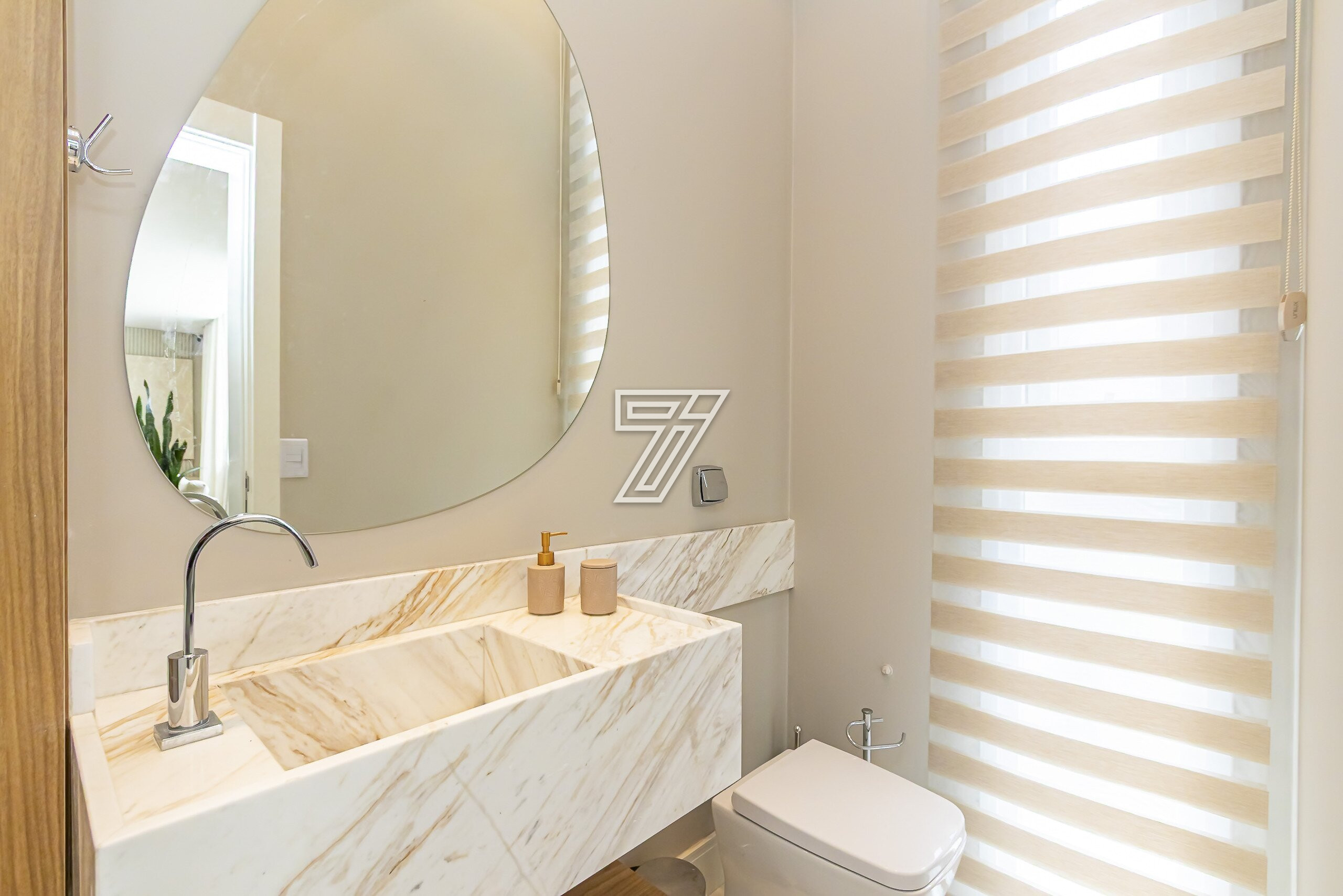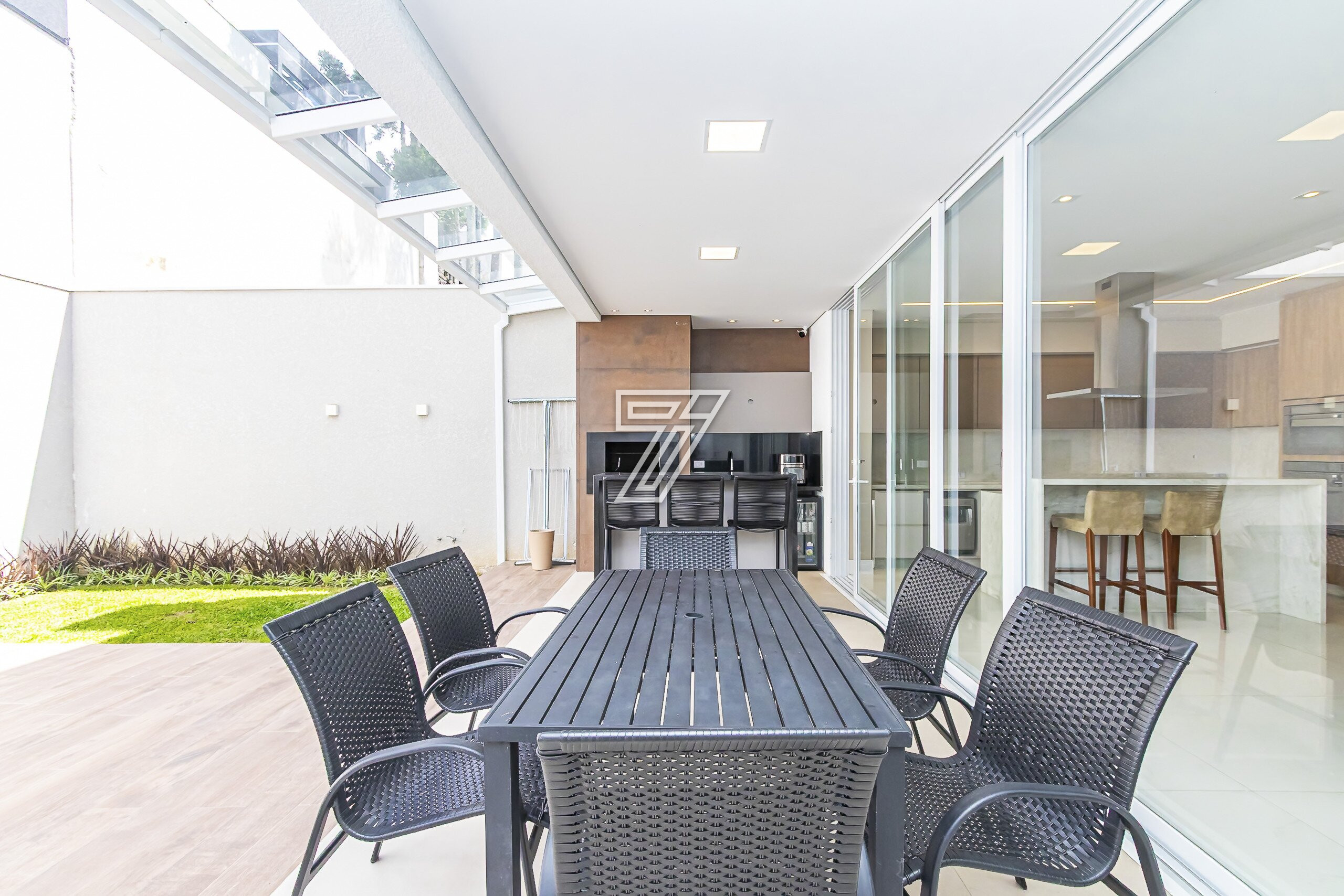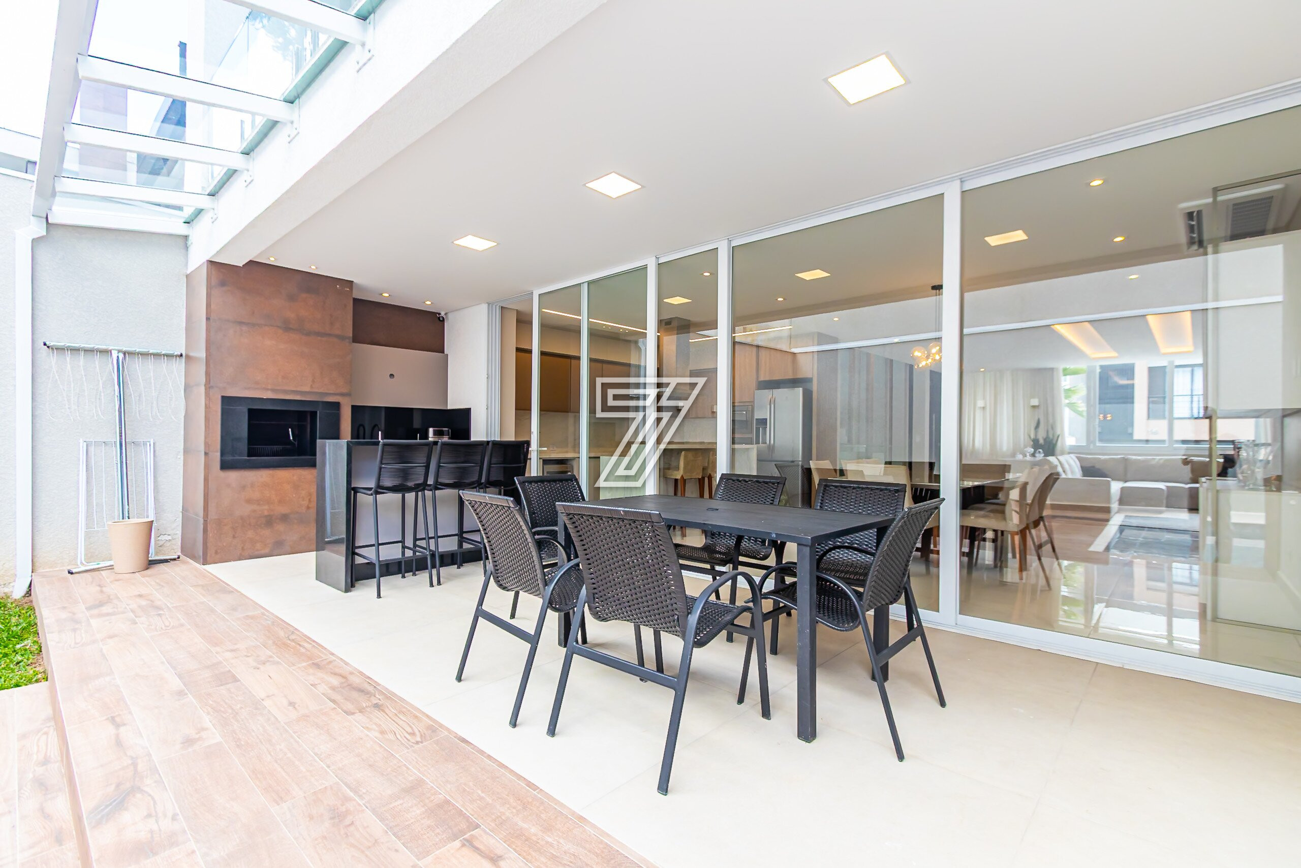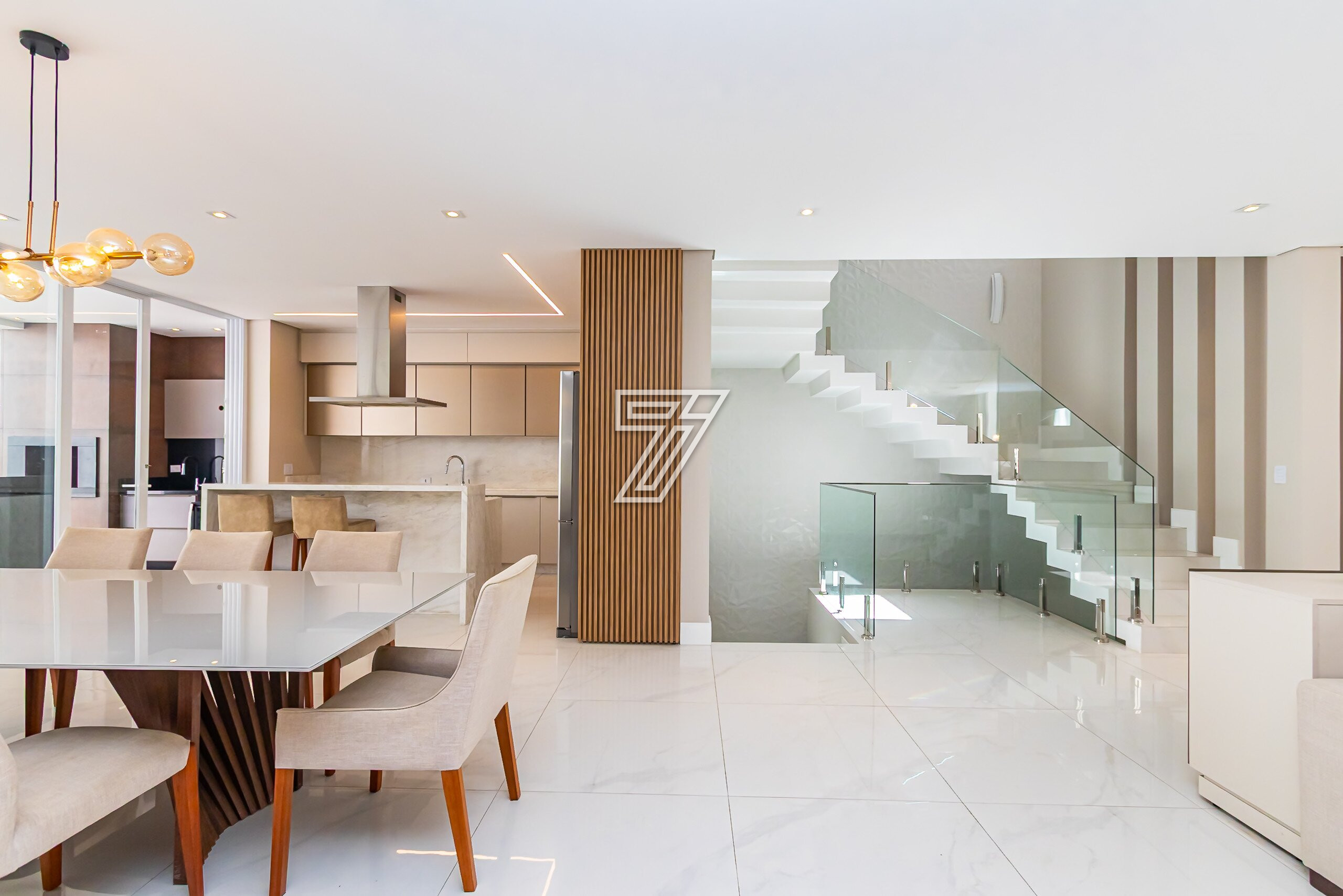 No térreo, ambientes integrados: lavabo, sala de estar e sala de jantar para 8 lugares climatizado com ar-condicionado embutido.