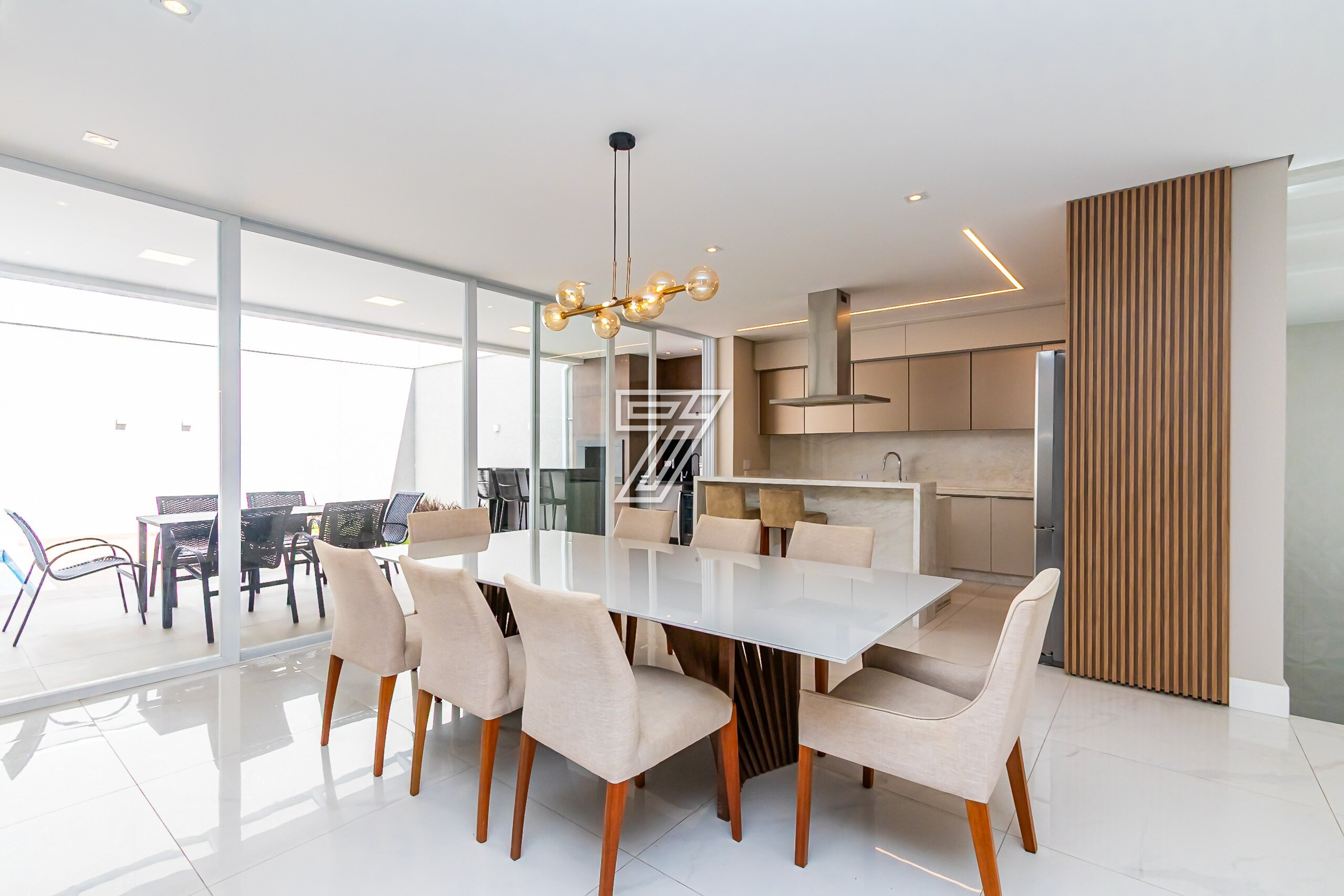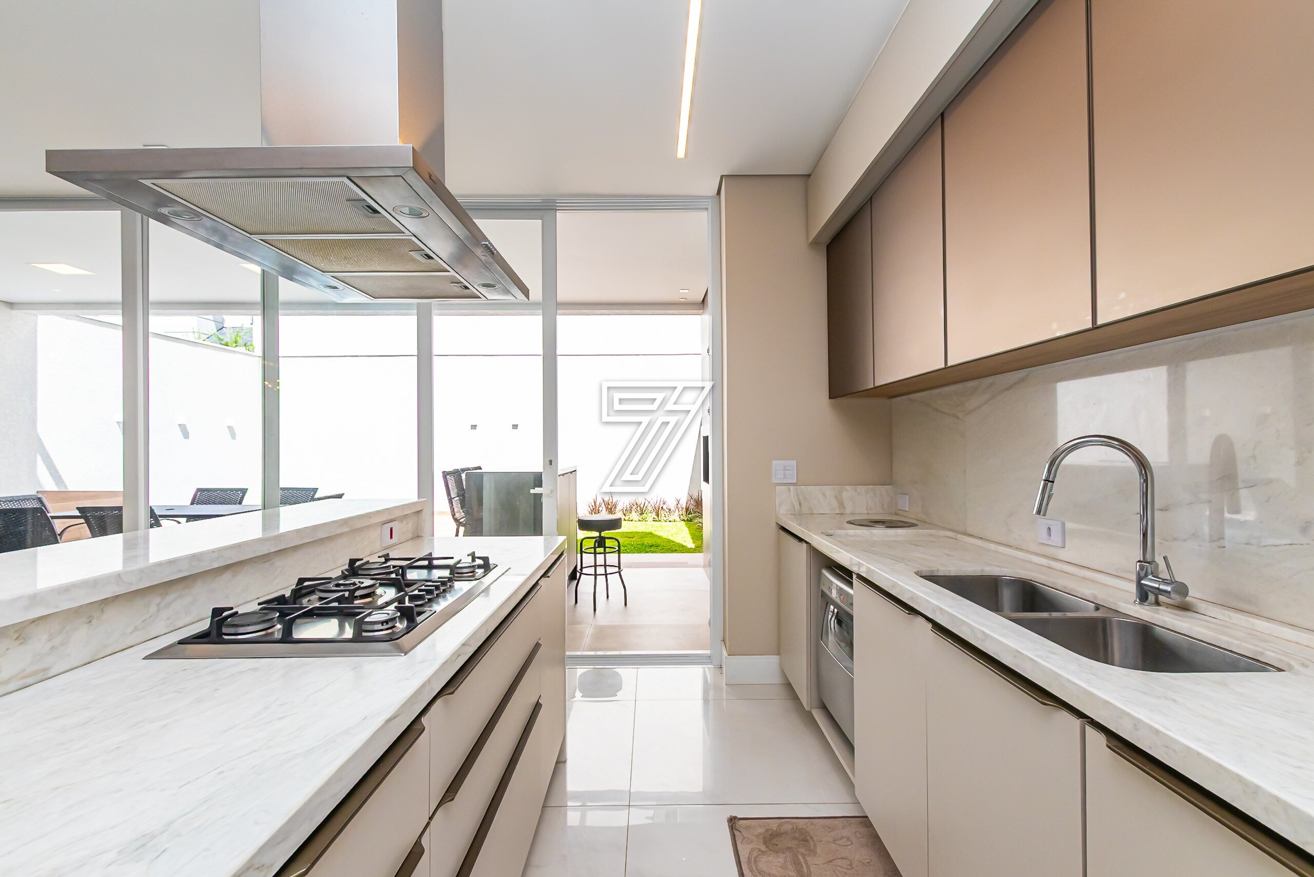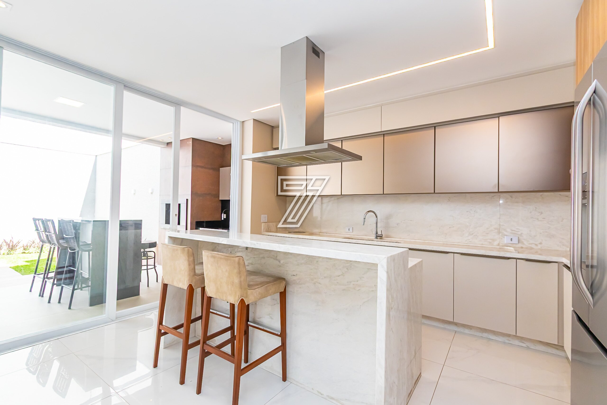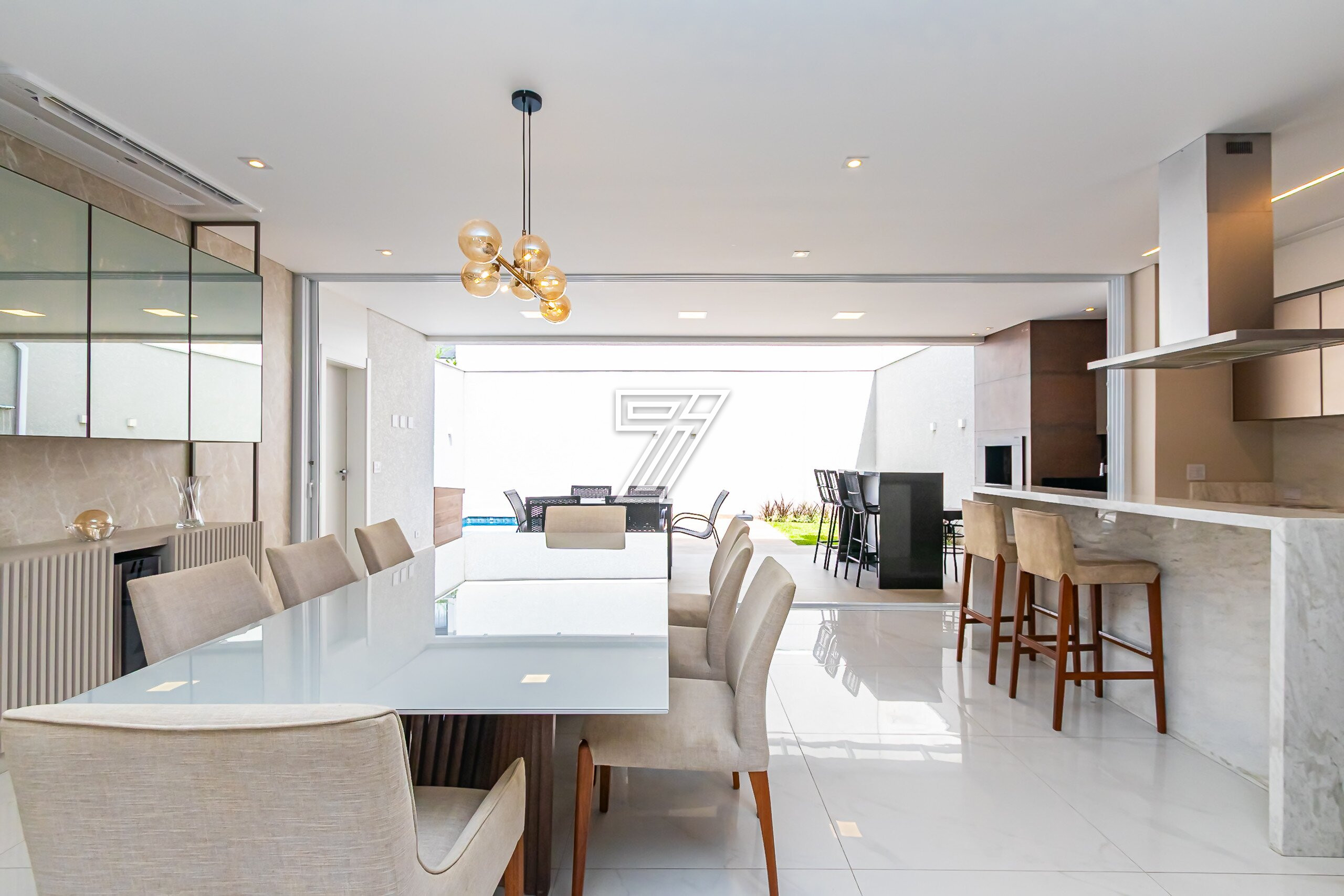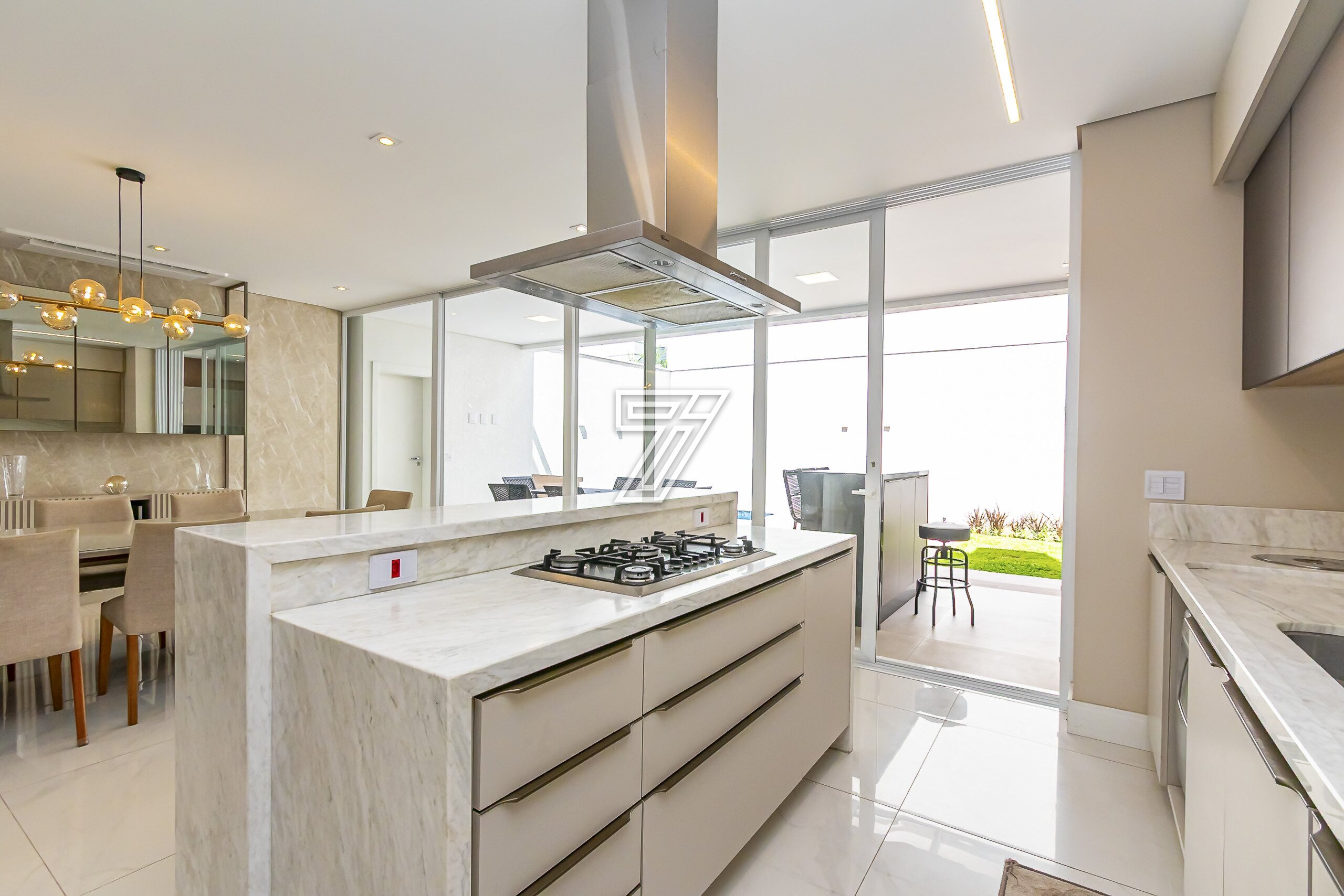 Cozinha em conceito aberto com bancadas em Mármore Branco Paraná. Conta com despensa e área externa com churrasqueira, bancada em granito preto, mesa para 6 lugares, piscina e banheiro completo.
