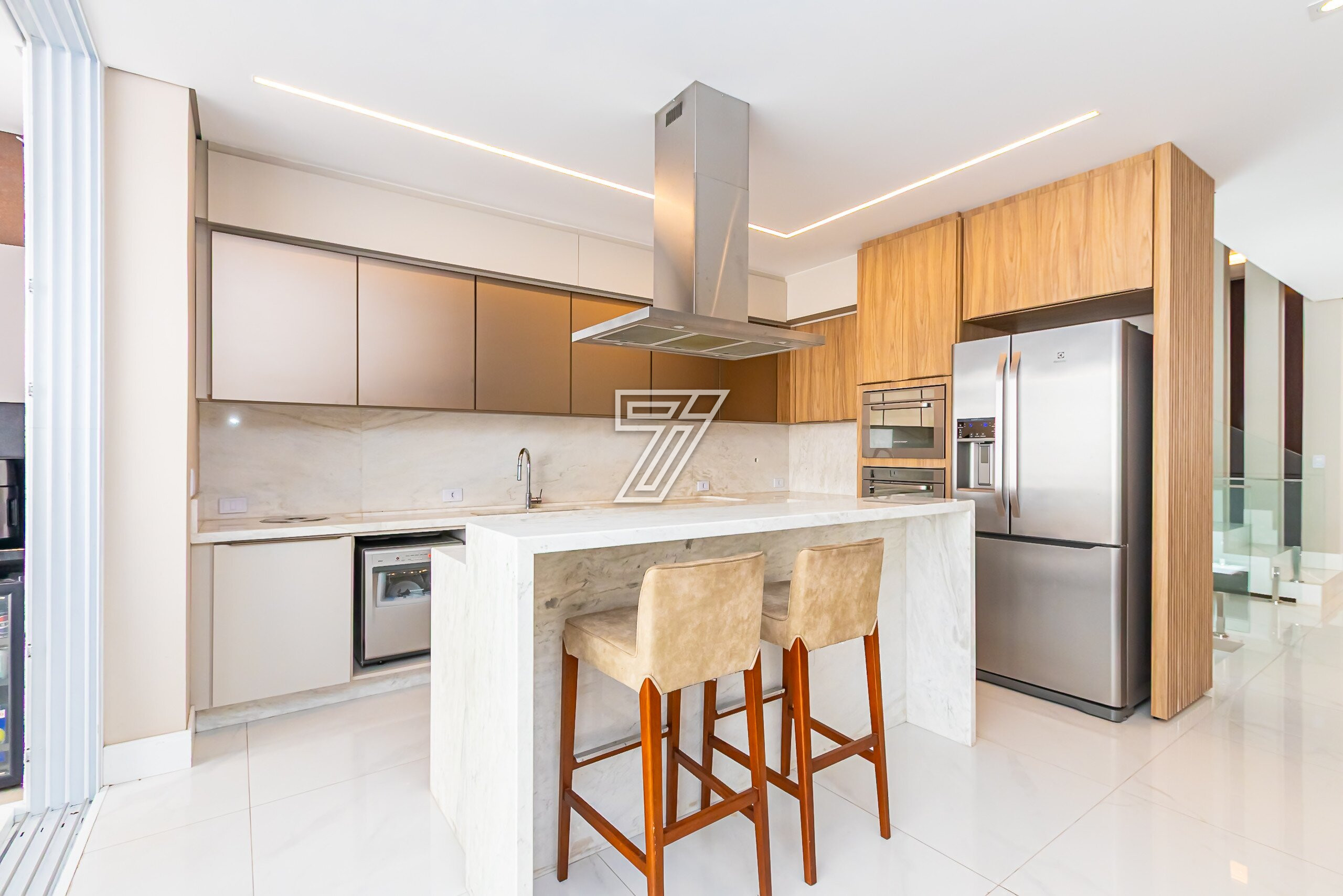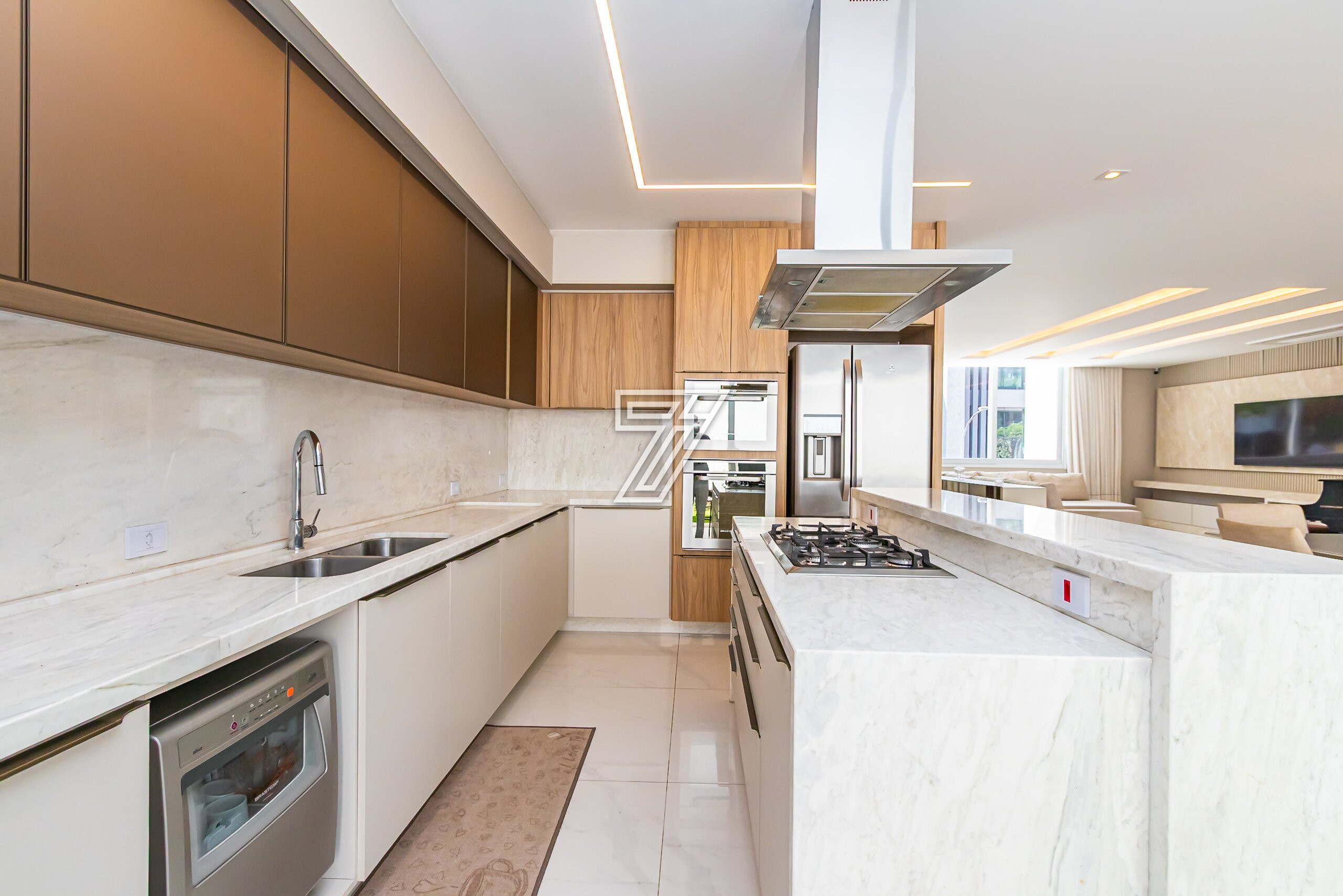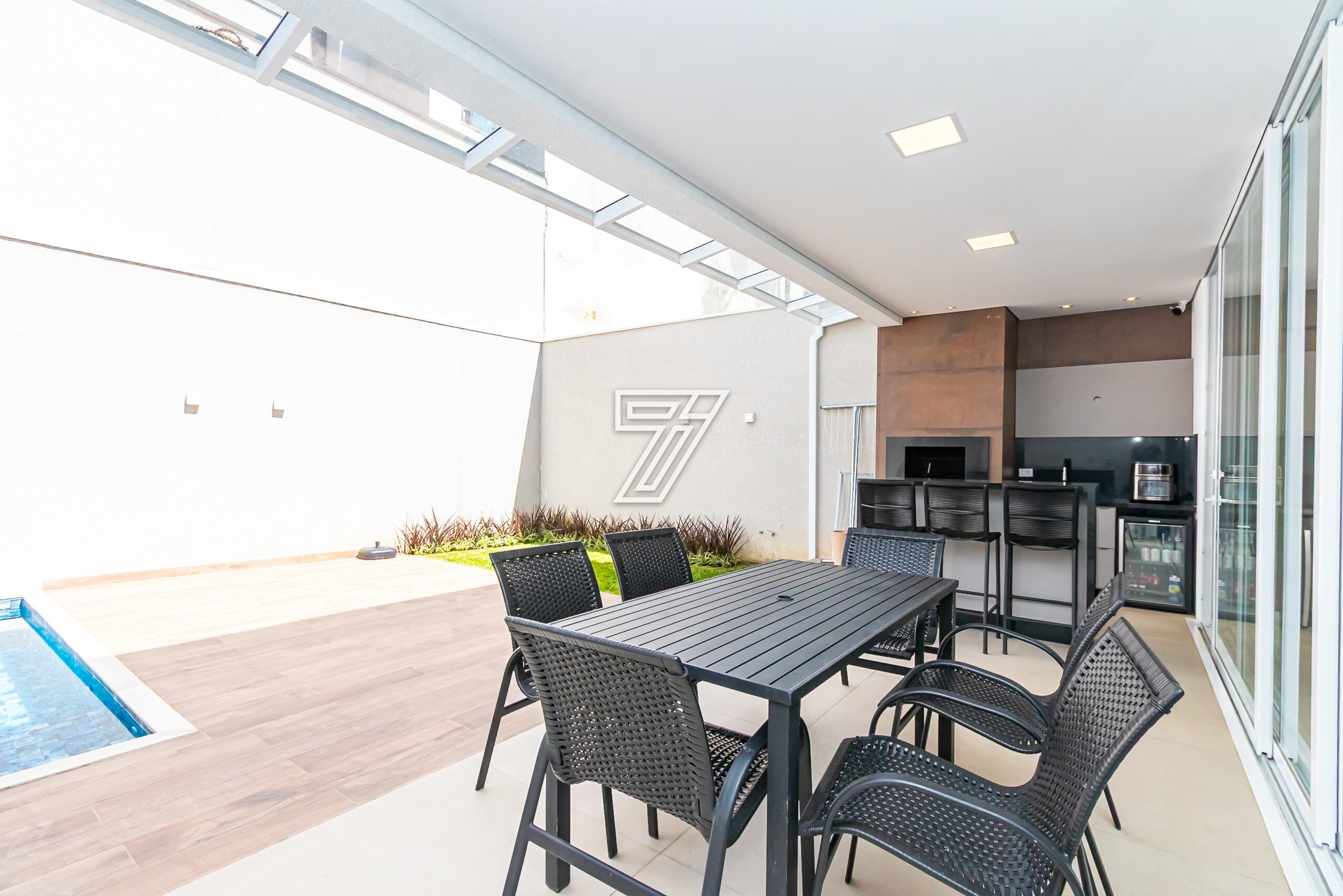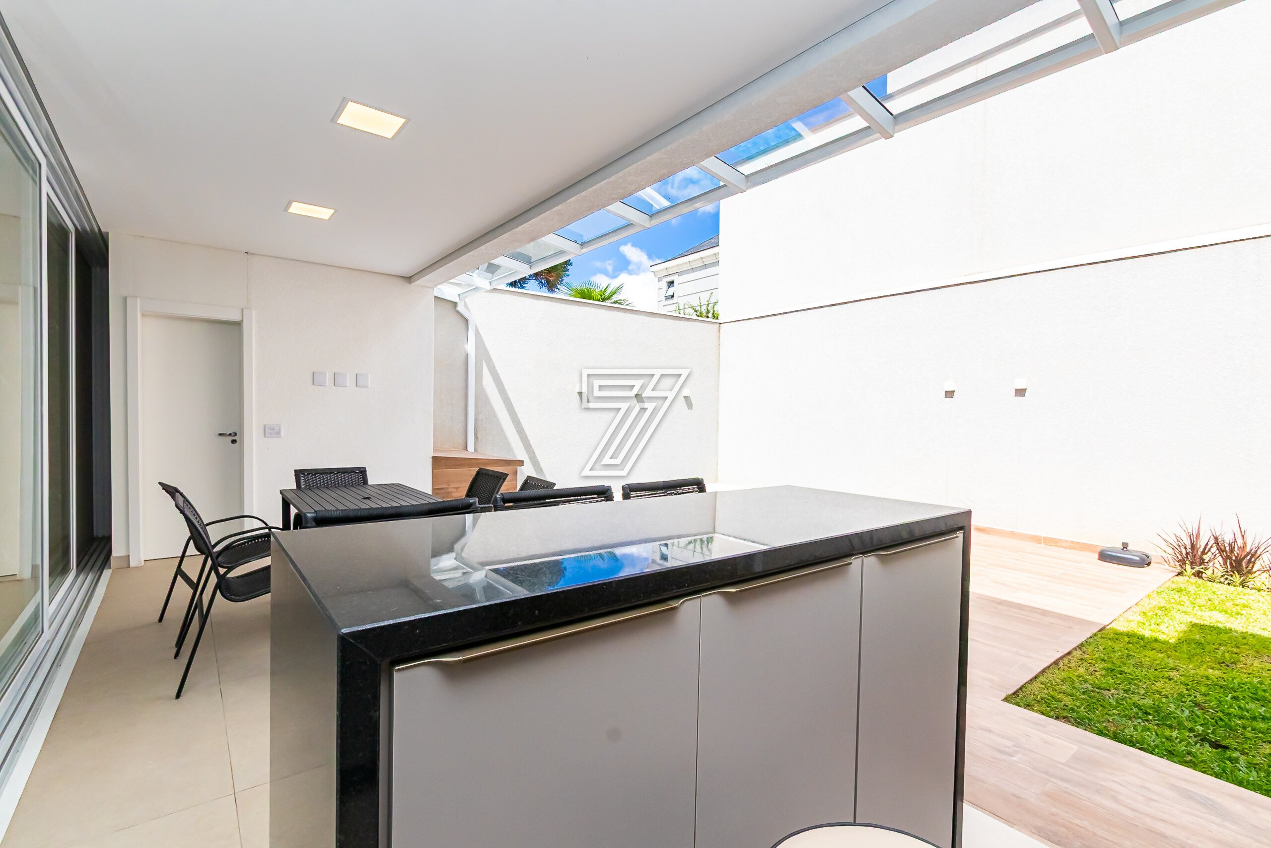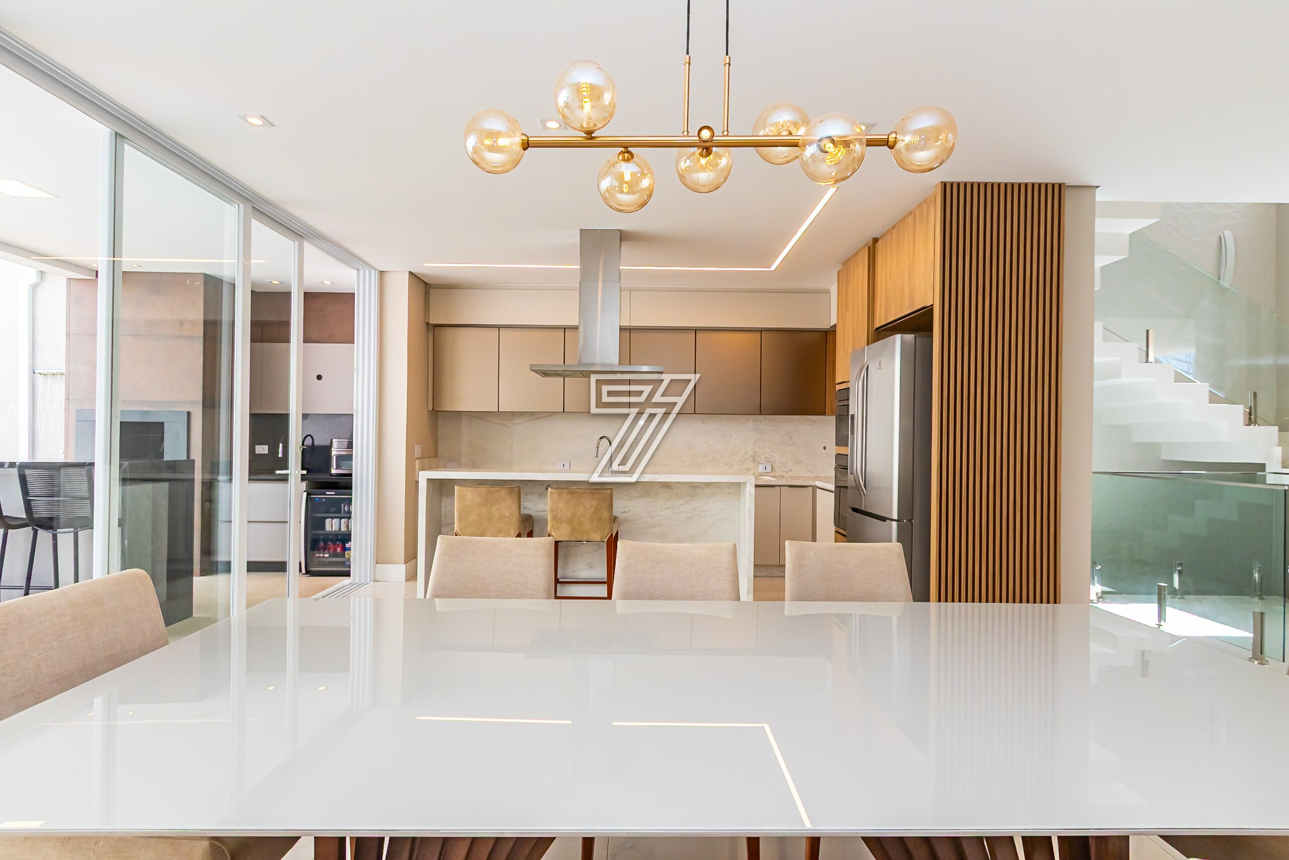 Cozinha em conceito aberto com bancadas em Mármore Branco Paraná. Conta com despensa e área externa com churrasqueira, bancada em granito preto, mesa para 6 lugares, piscina e banheiro completo.