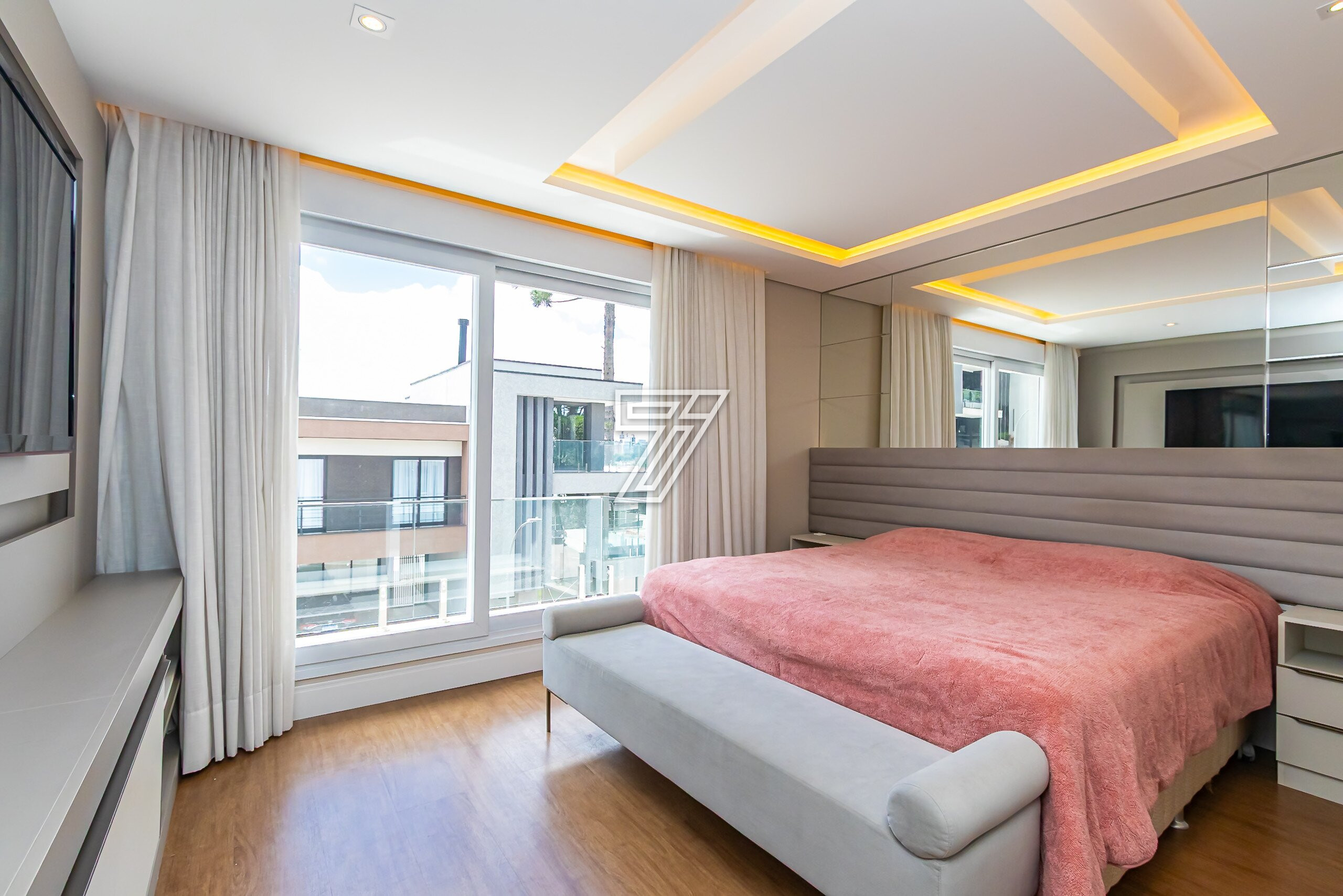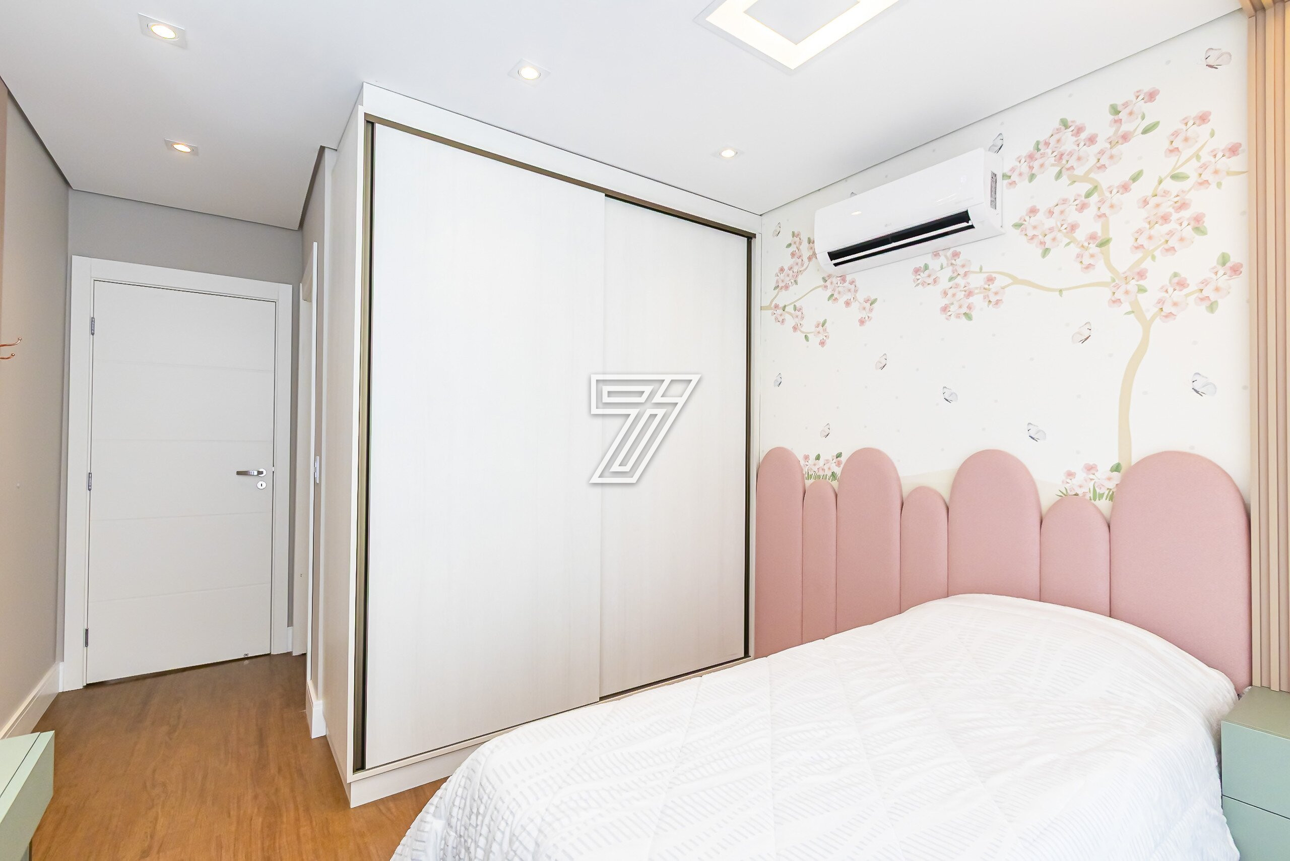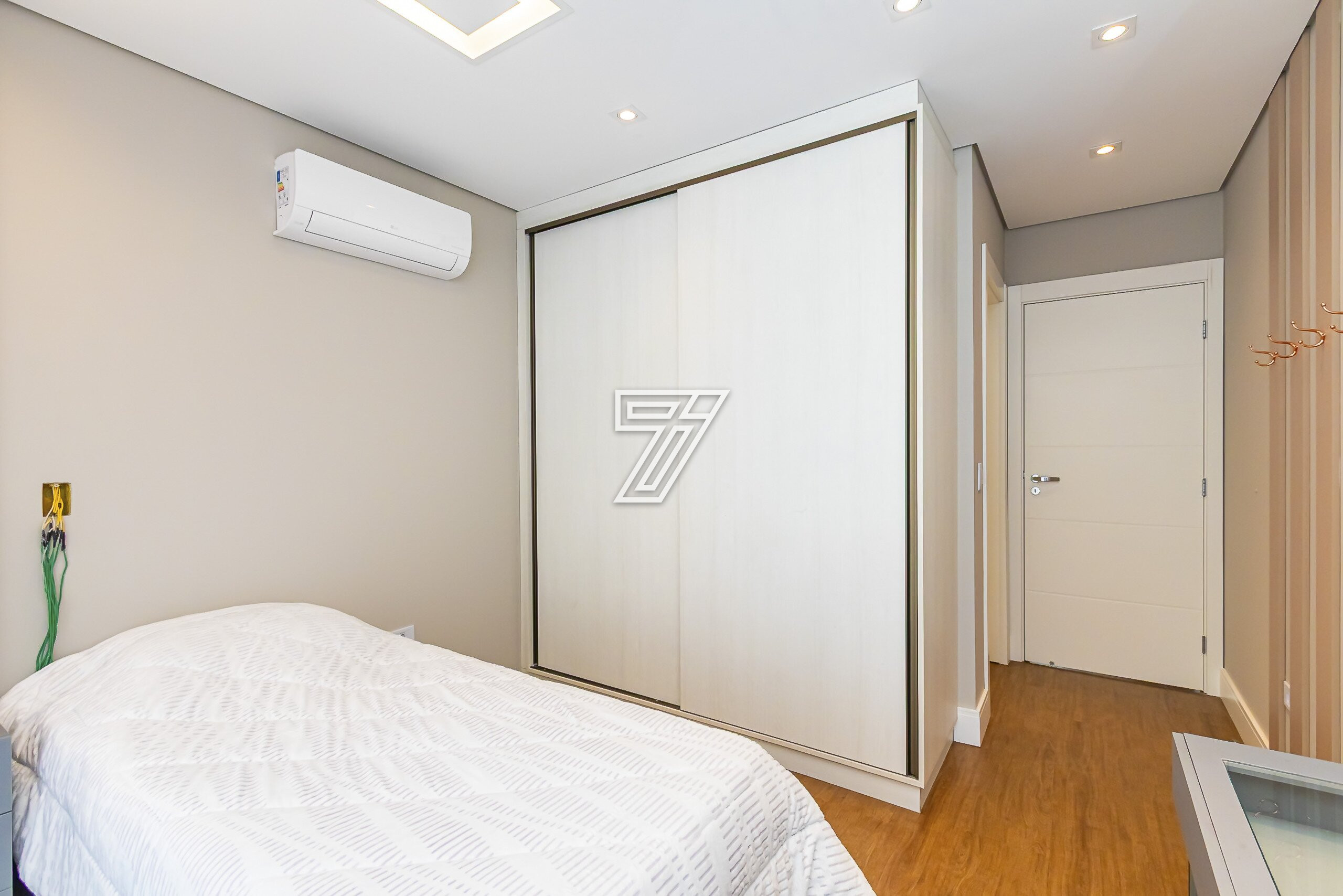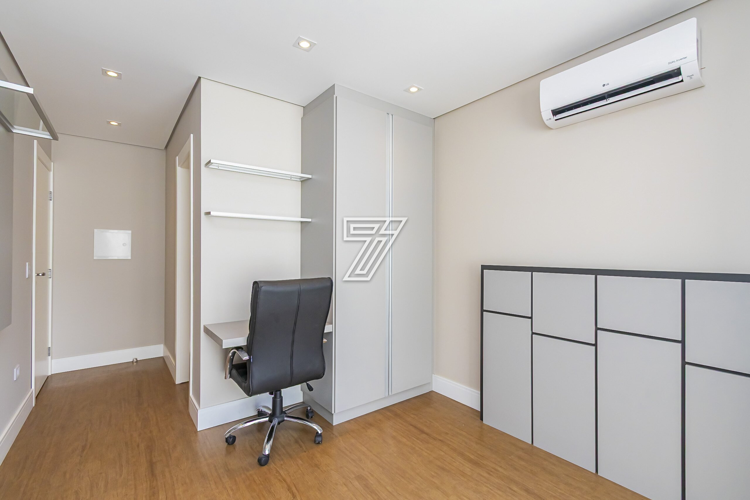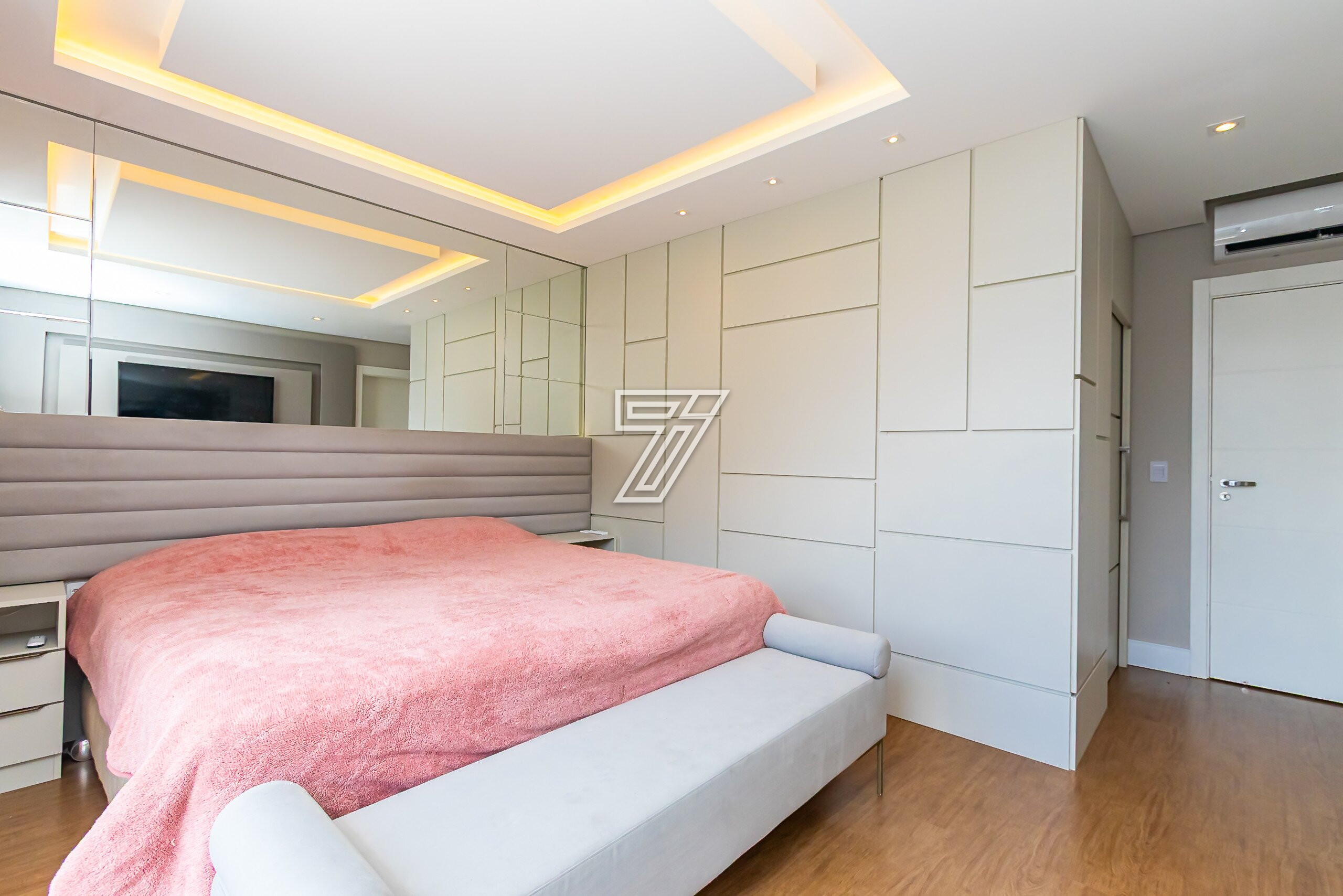 No piso superior, 4 suítes com móveis planejados e ar-condicionado.