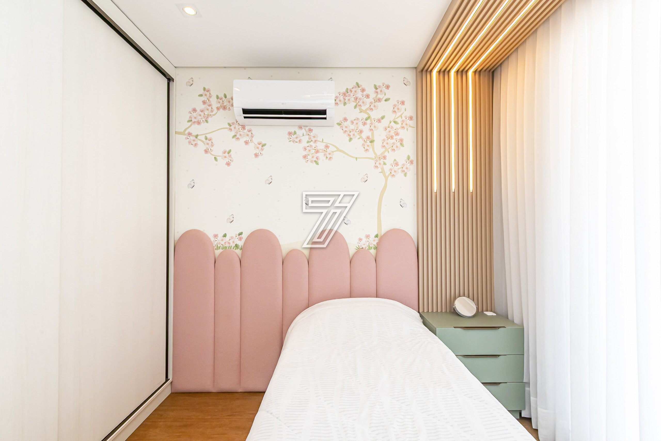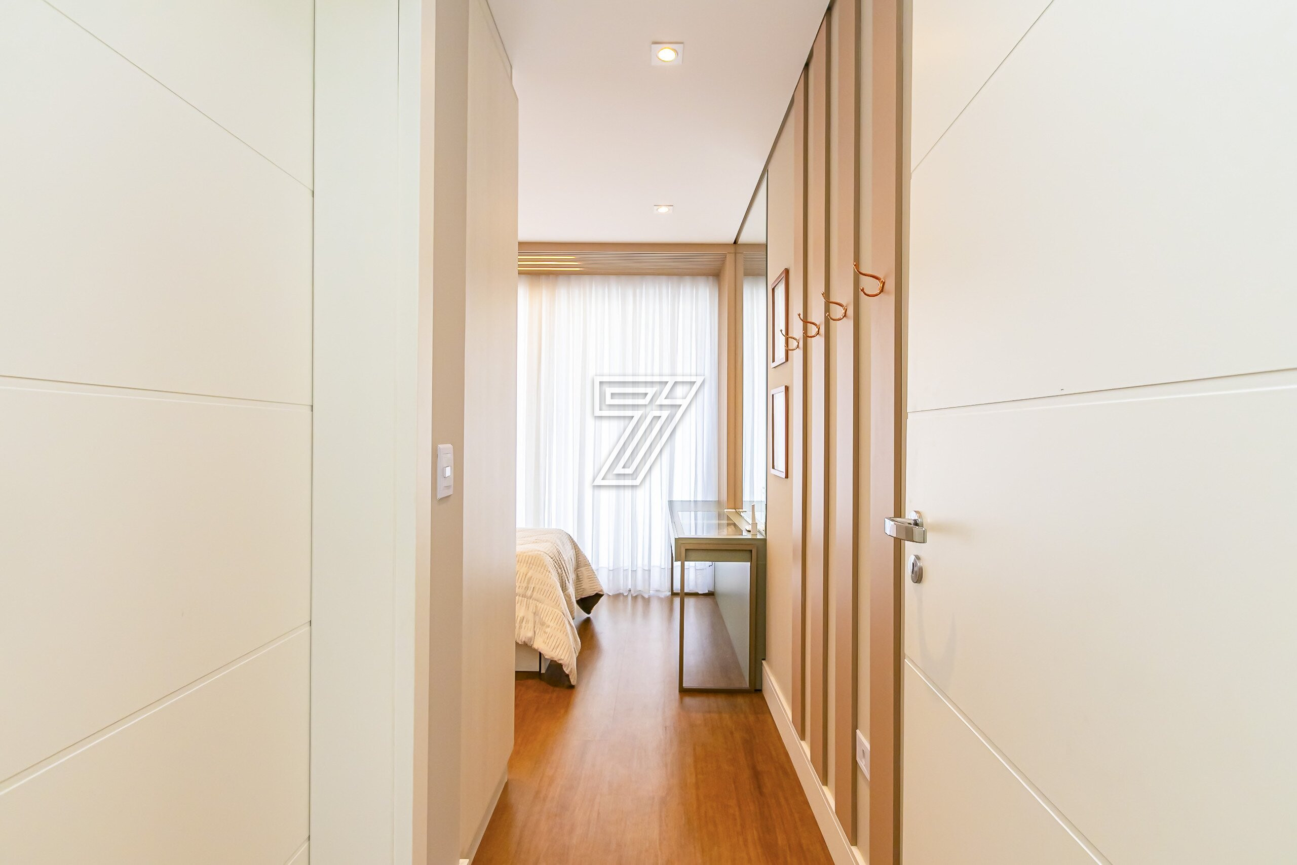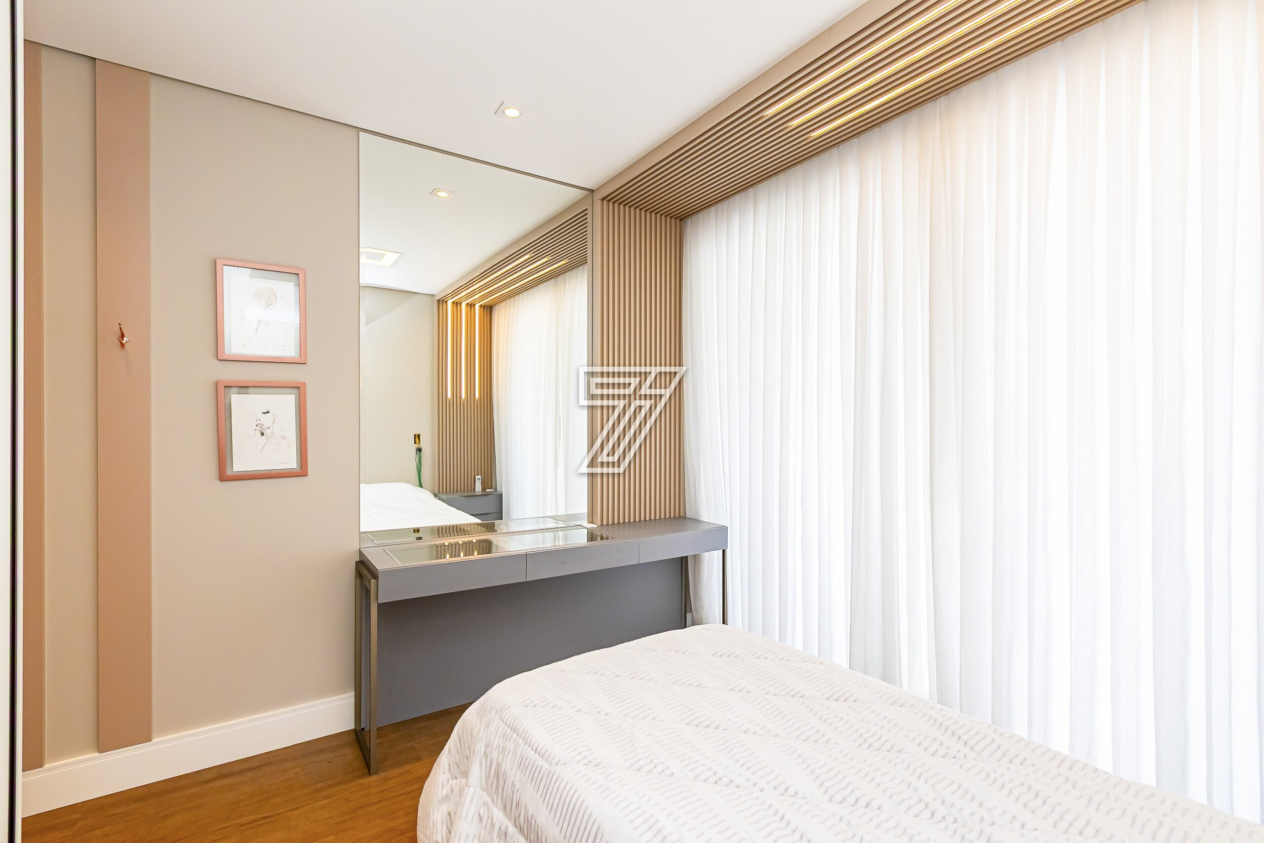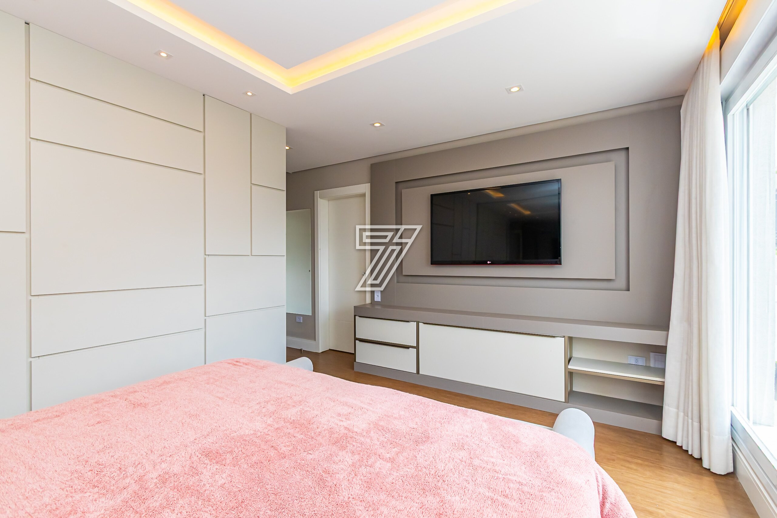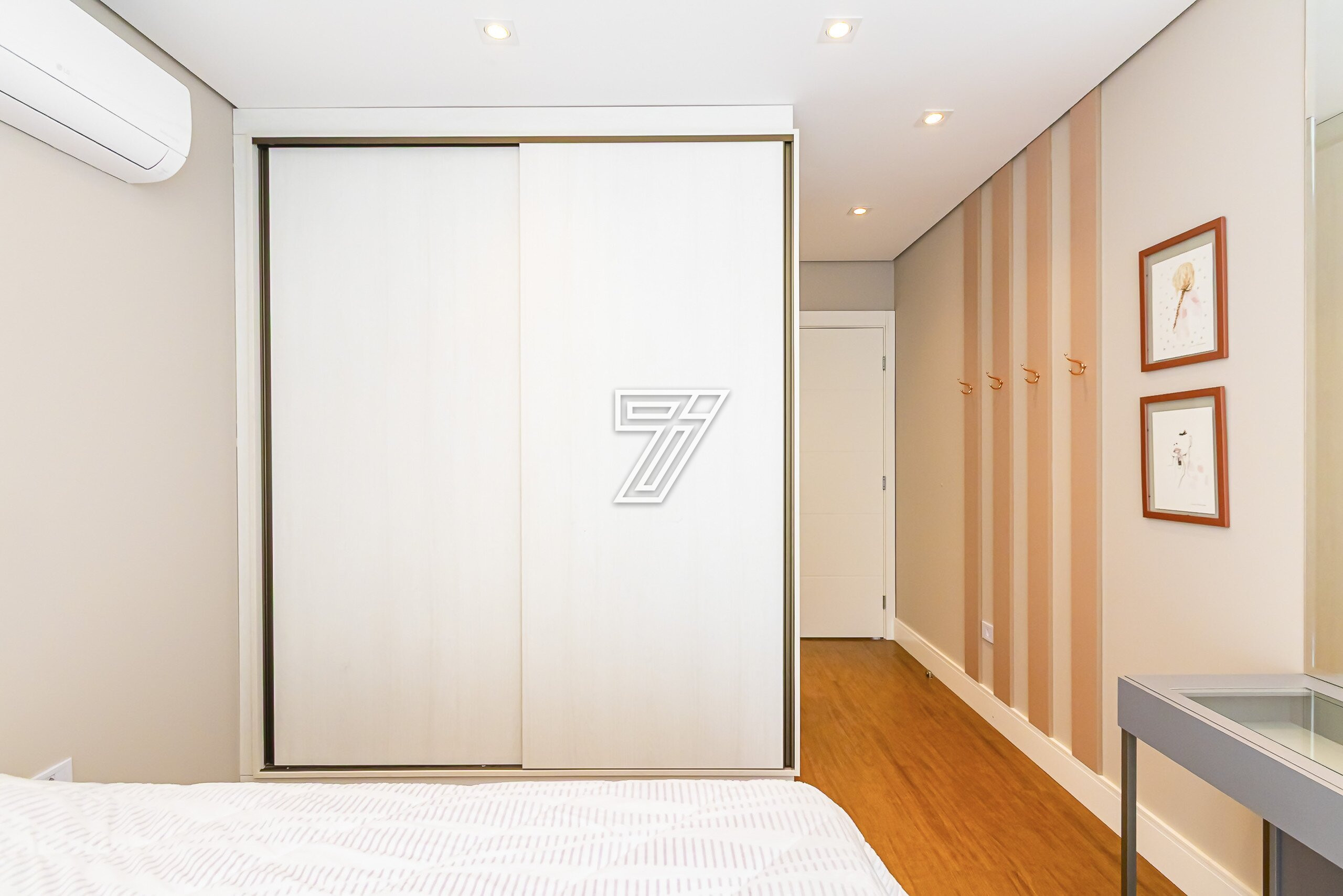 No piso superior, 4 suítes com móveis planejados e ar-condicionado.