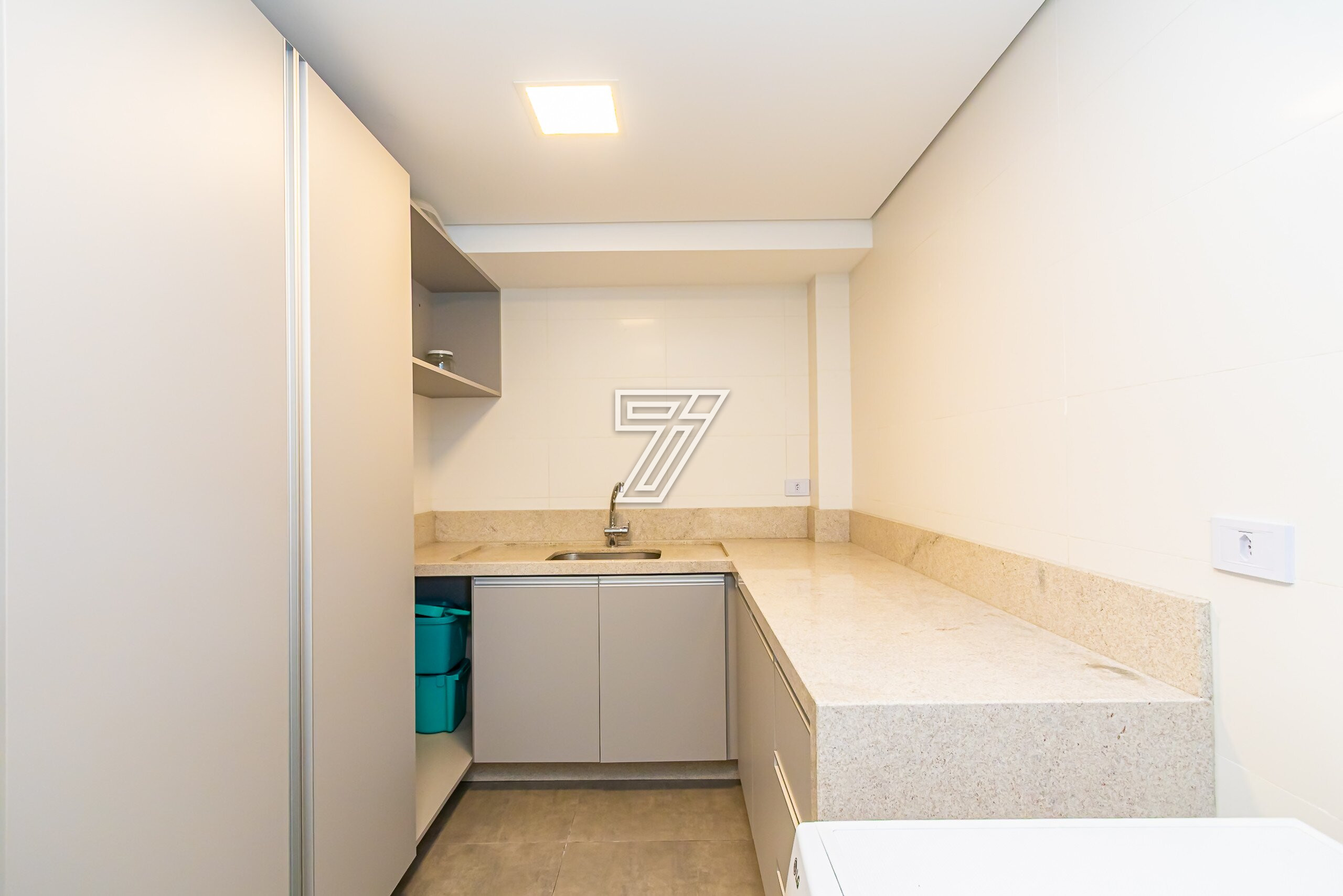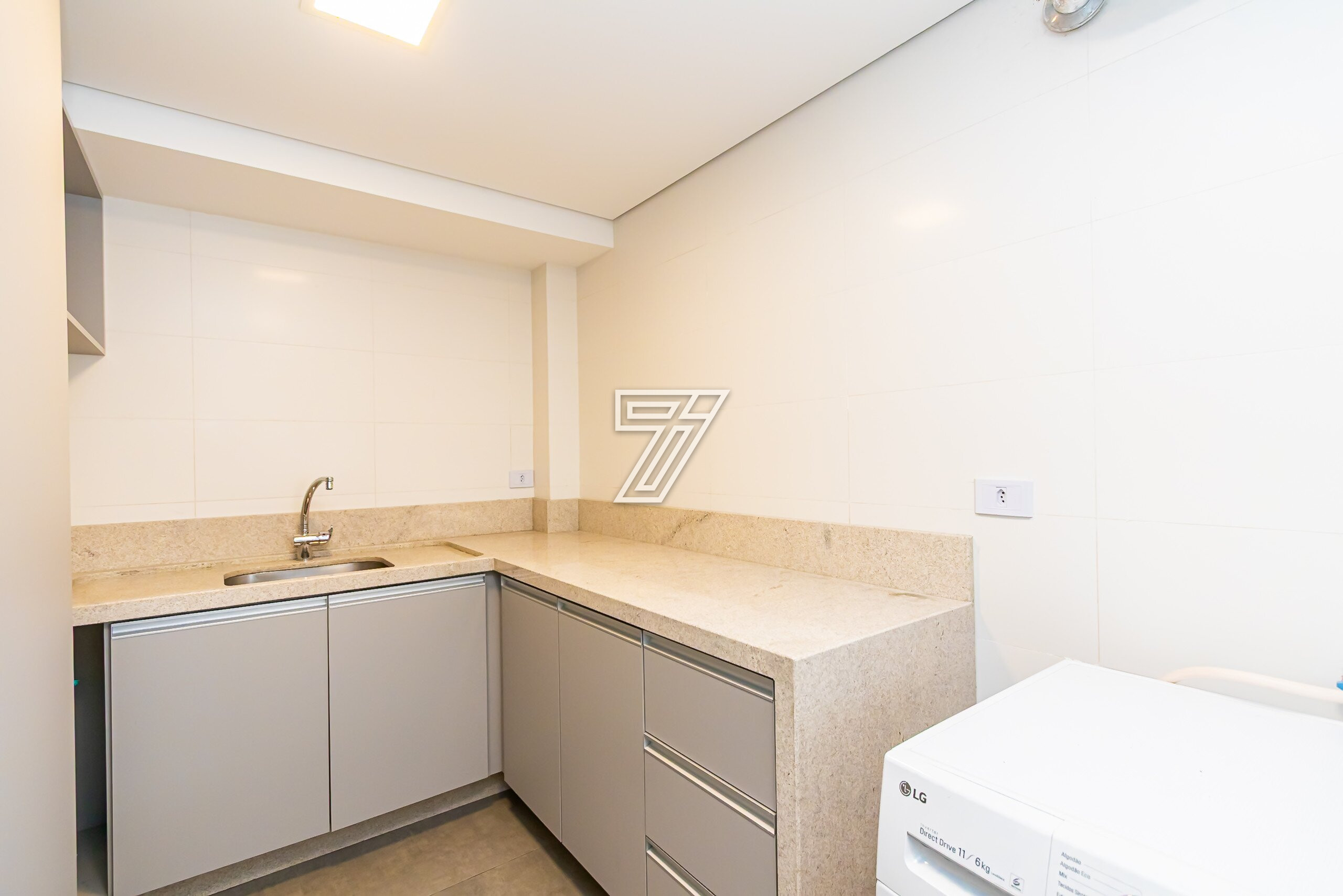 No subsolo, lavanderia com móveis planejados e bancada em granito, depósito e 4 vagas de garagem (2 cobertas e 2 descobertas).