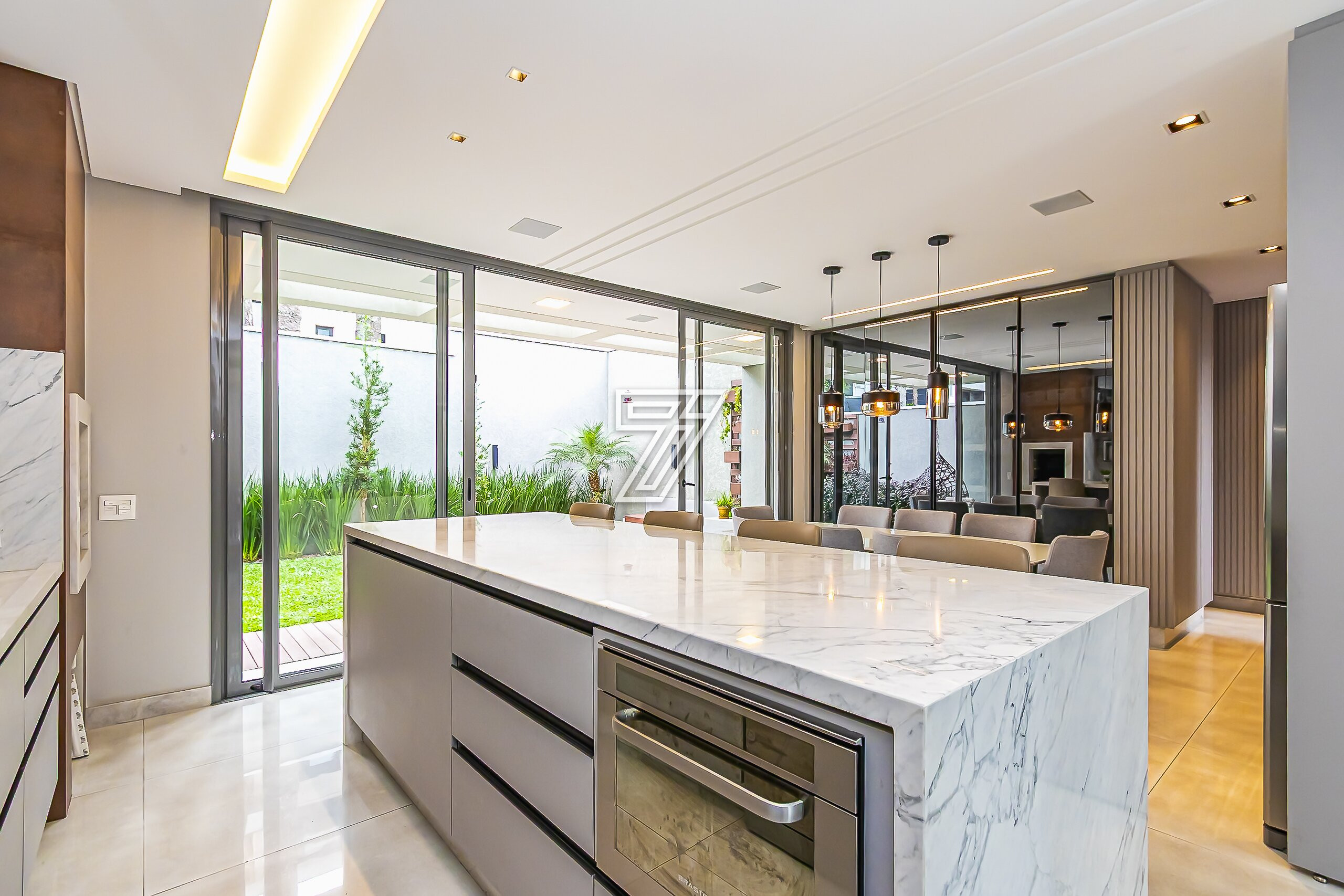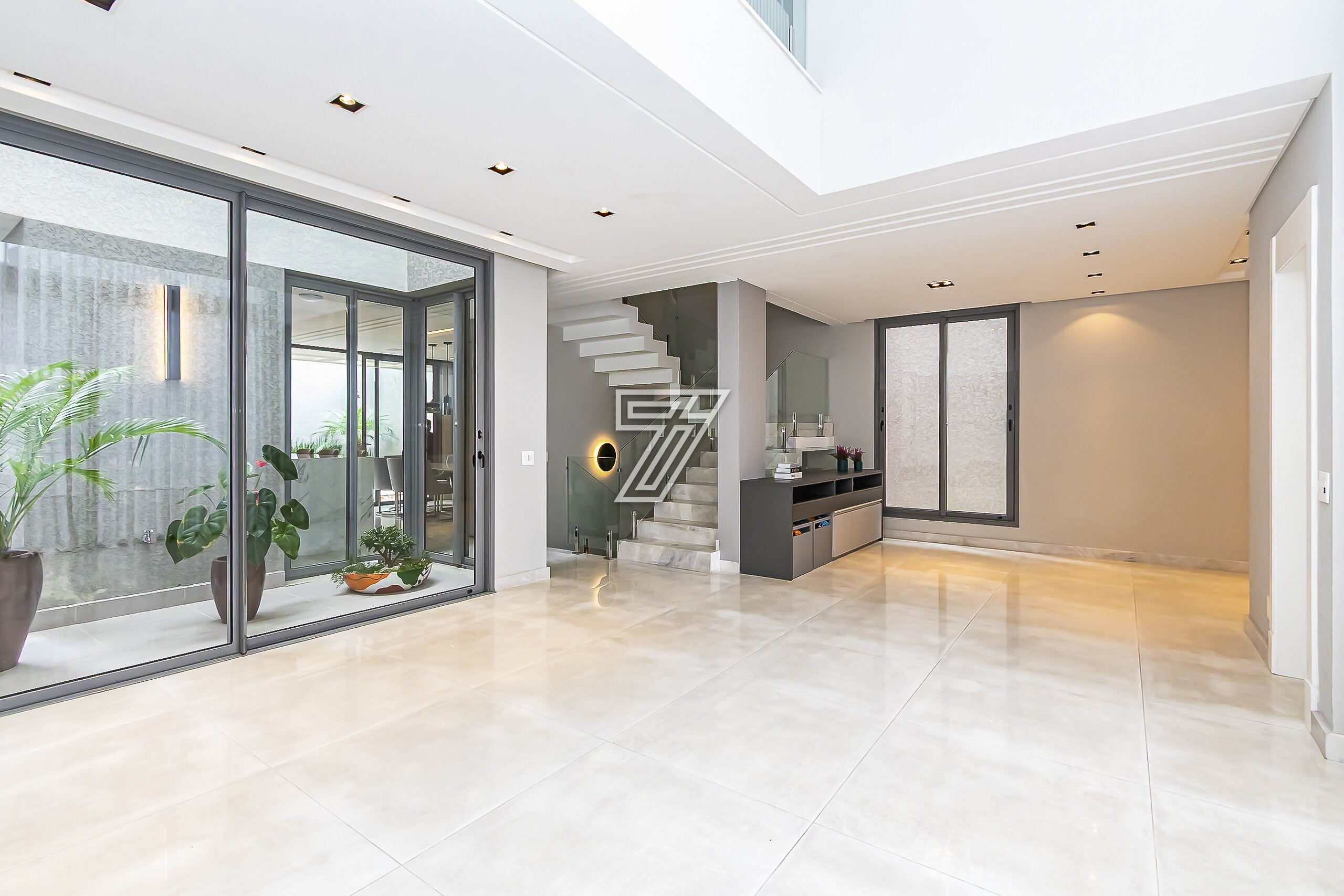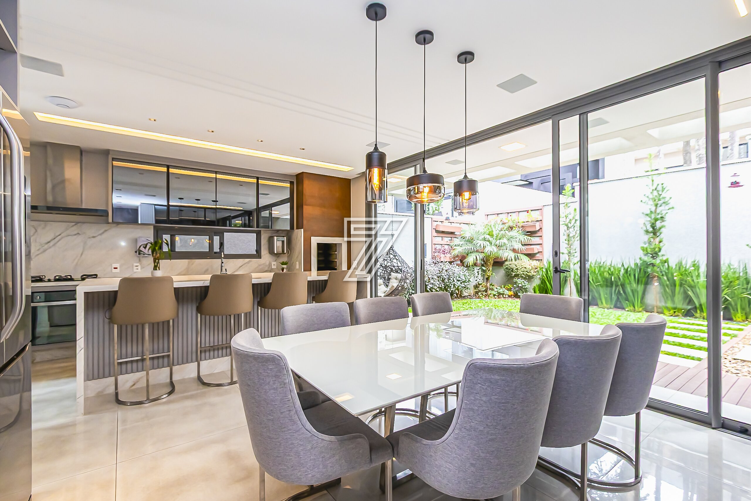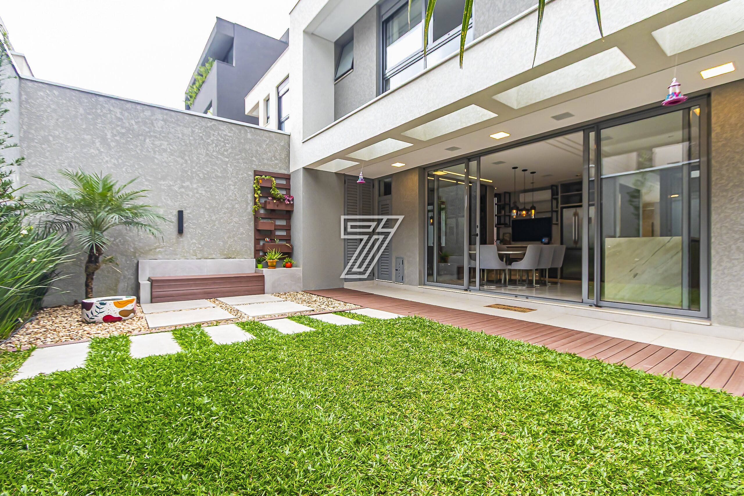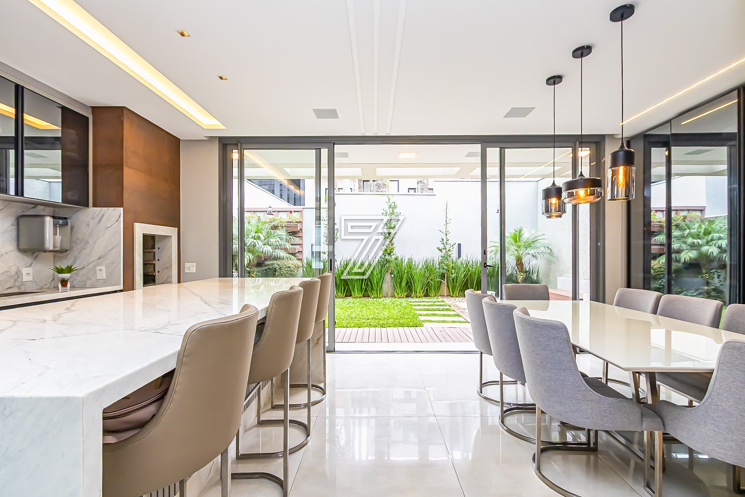 No térreo, ambientes integrados: lavabo e sala de estar, acesso a cozinha gourmet e churrasqueira à carvão com um incrível sistema de som. Nos dias mais ensolarados um terreno para a sua família aproveitar cada minuto.