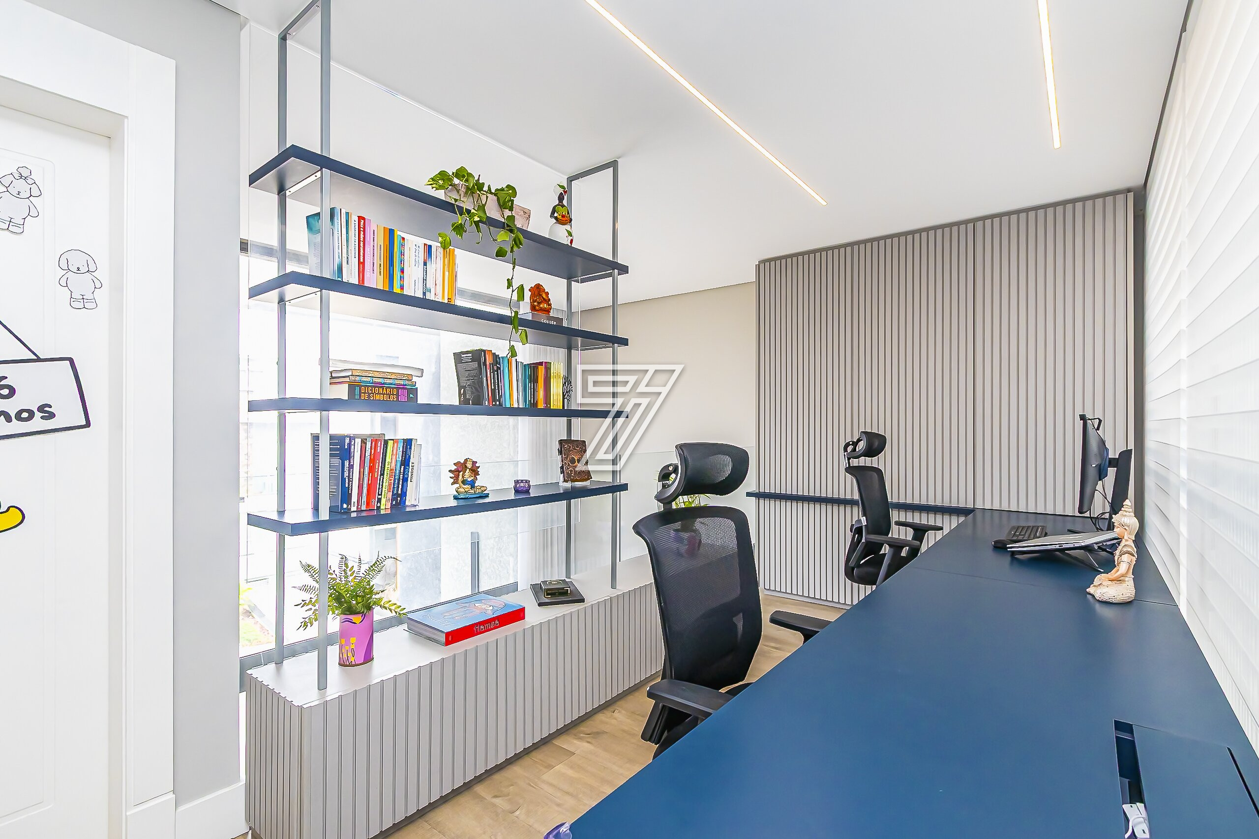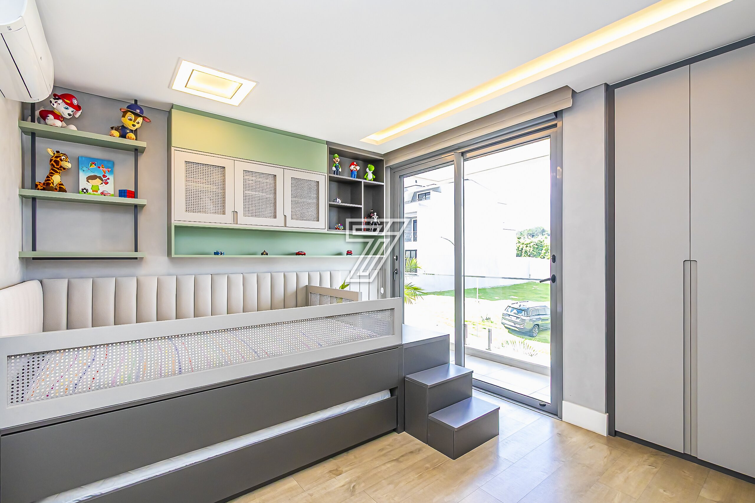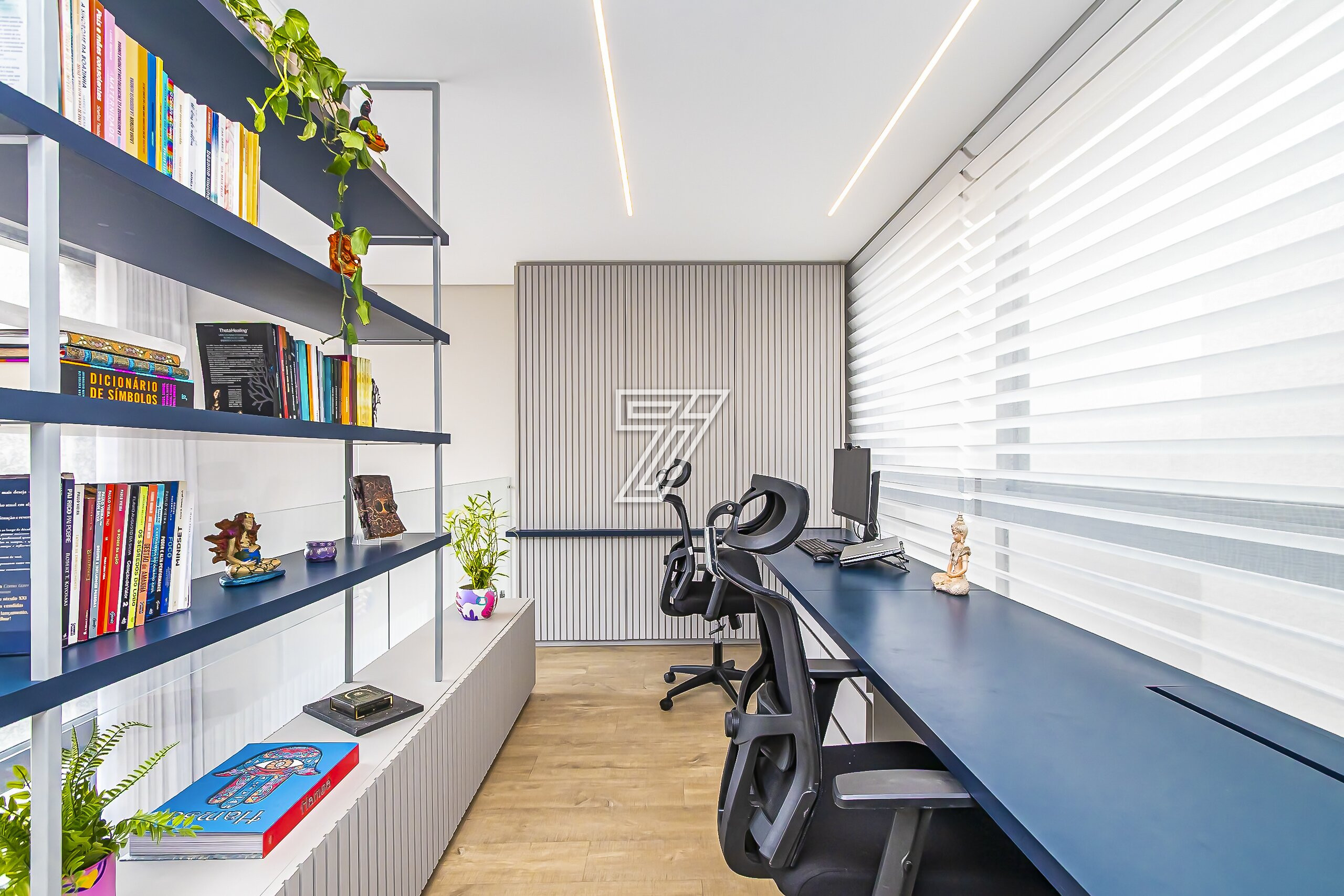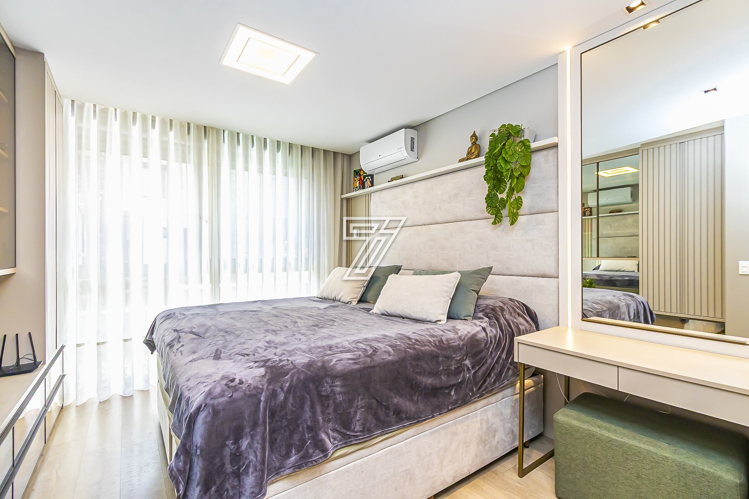 No piso superior, são três suítes com móveis planejados e ar-condicionado e um espaço super planejado para home office. A suíte master possui closet e banheiro com cuba e chuveiros duplos.