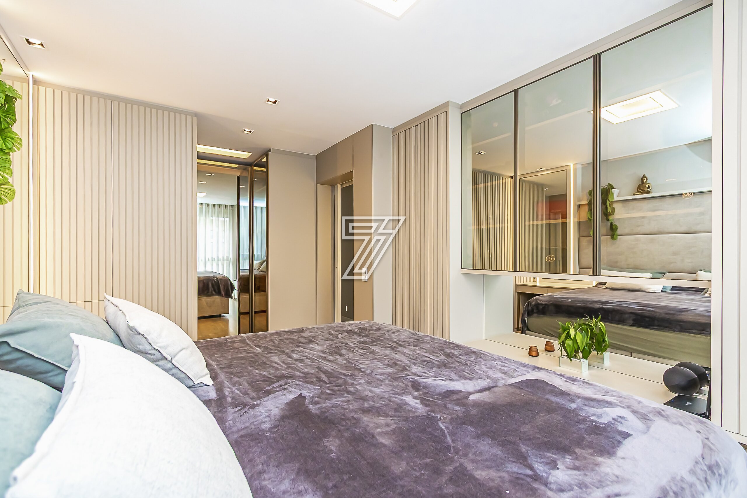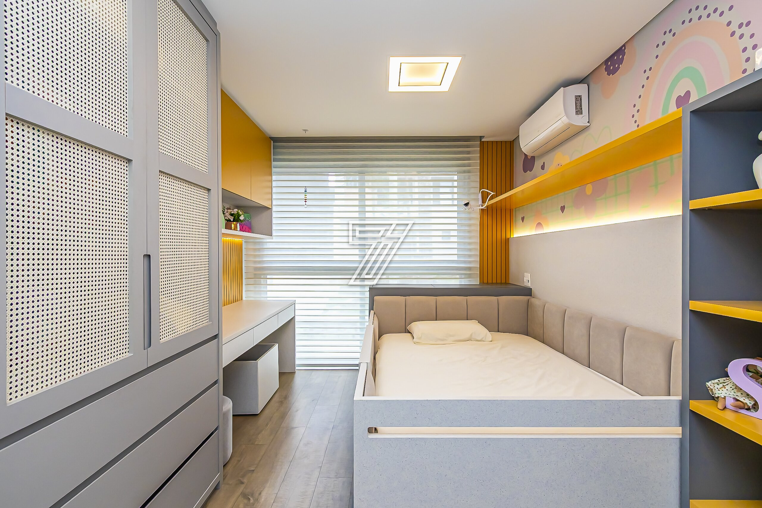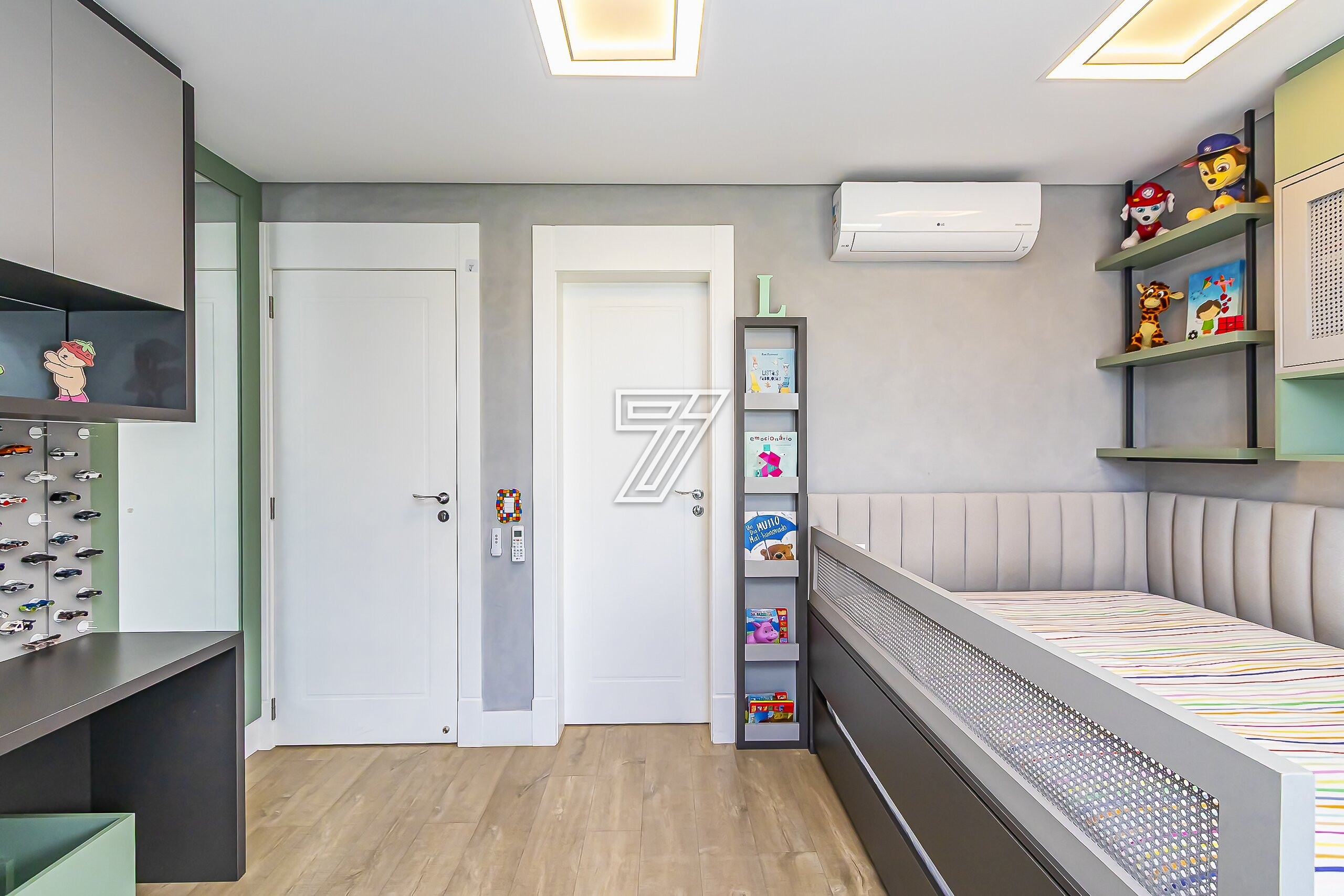 No piso superior, são três suítes com móveis planejados e ar-condicionado e um espaço super planejado para home office. A suíte master possui closet e banheiro com cuba e chuveiros duplos.