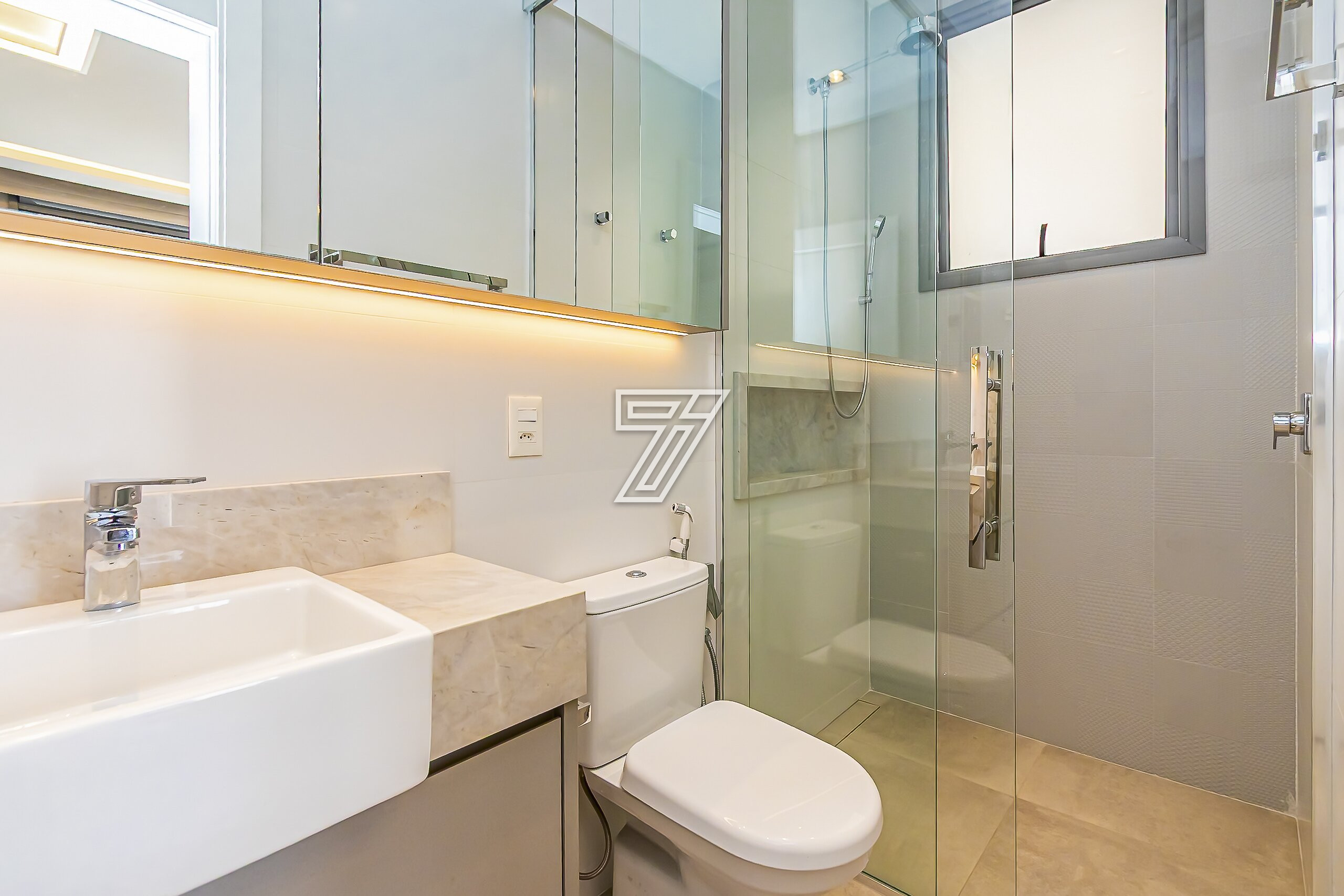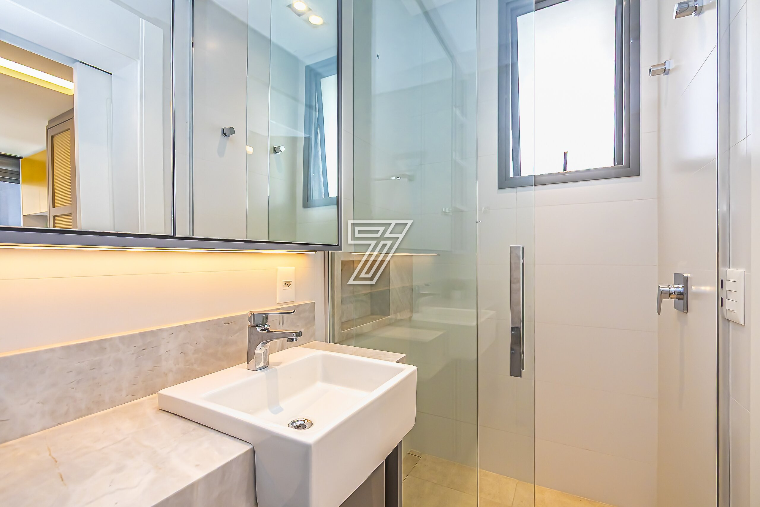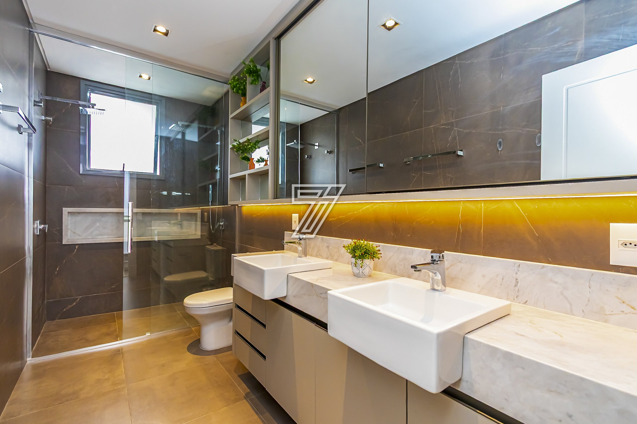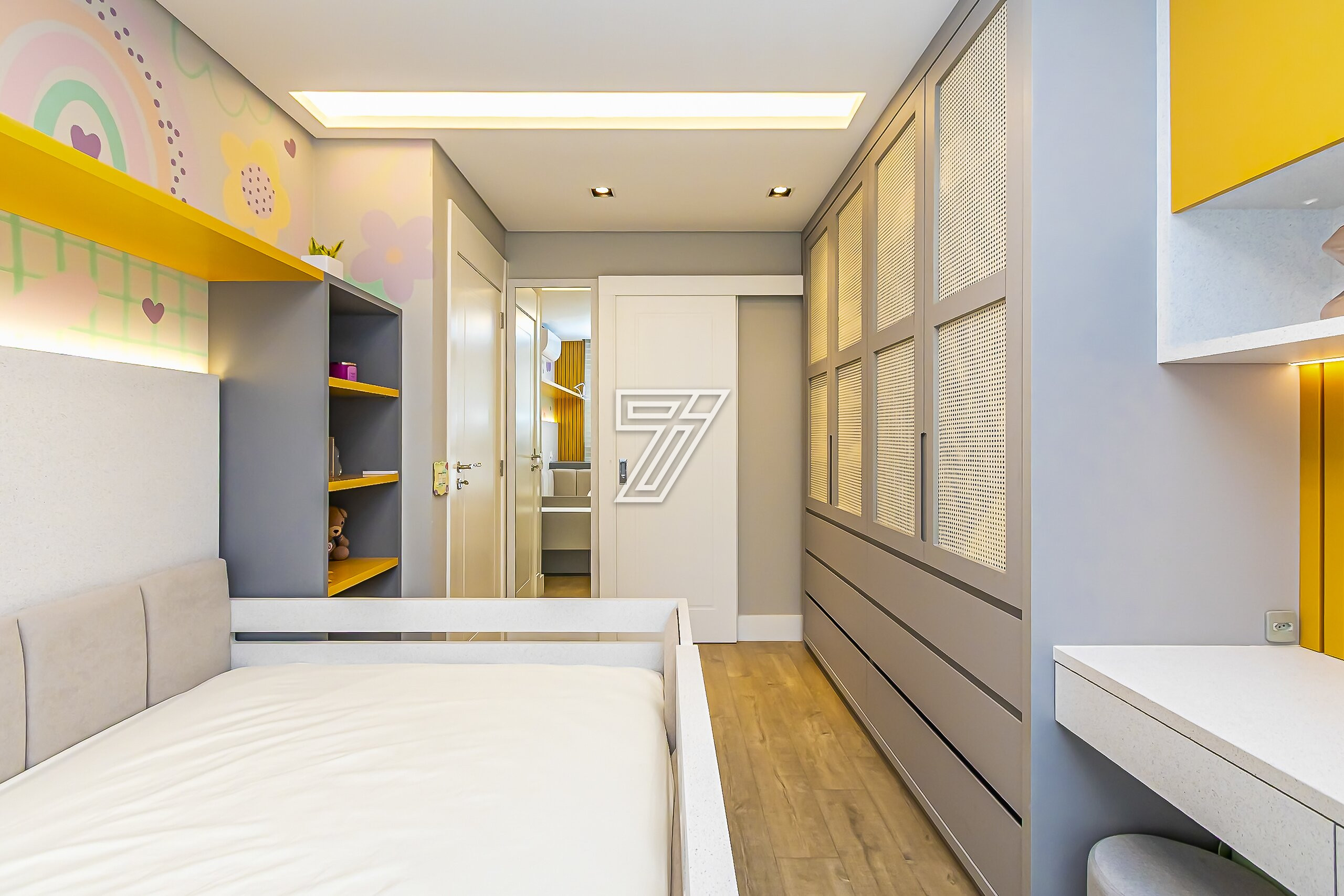 No piso superior, são três suítes com móveis planejados e ar-condicionado e um espaço super planejado para home office. A suíte master possui closet e banheiro com cuba e chuveiros duplos.