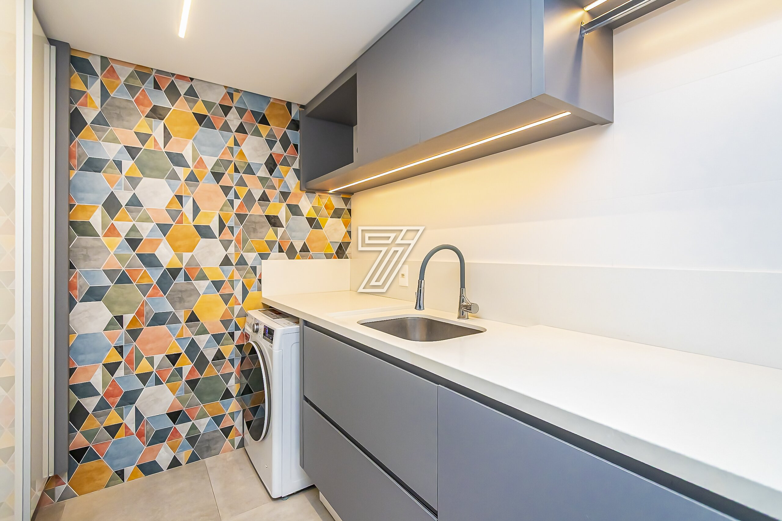 No subsolo, lavanderia com móveis planejados, depósito e 6 vagas de garagem (04 cobertas e 02 descobertas).