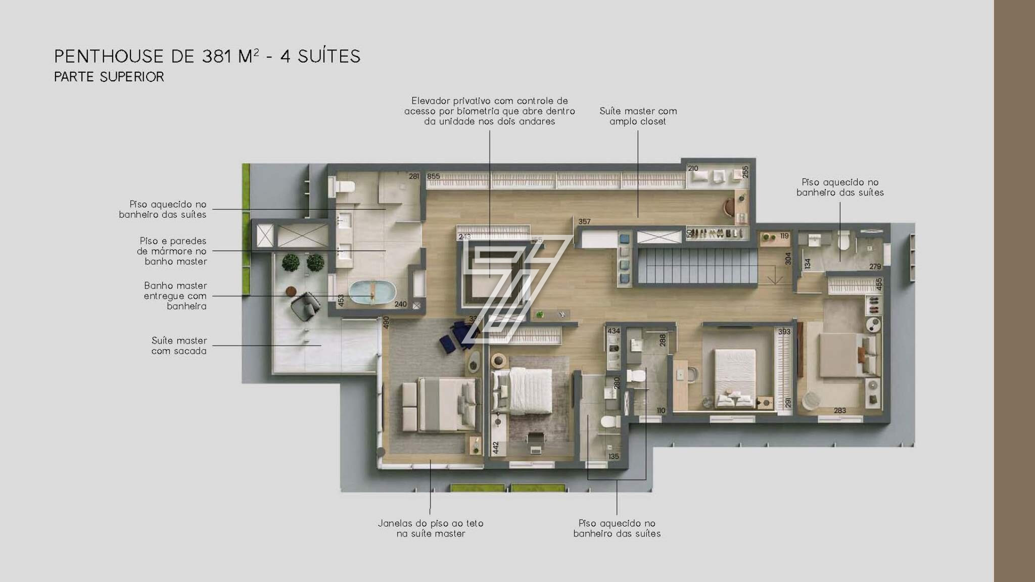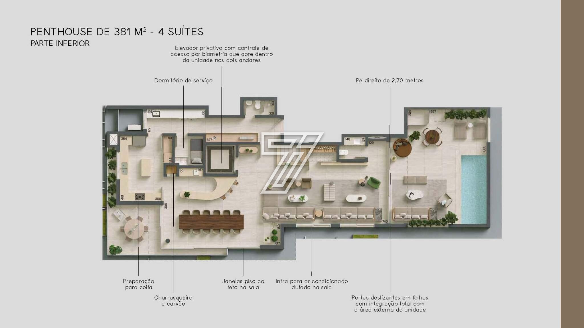 296,40m² de apartamento + 79,41m² de terraço = 378,81m² de área privativa