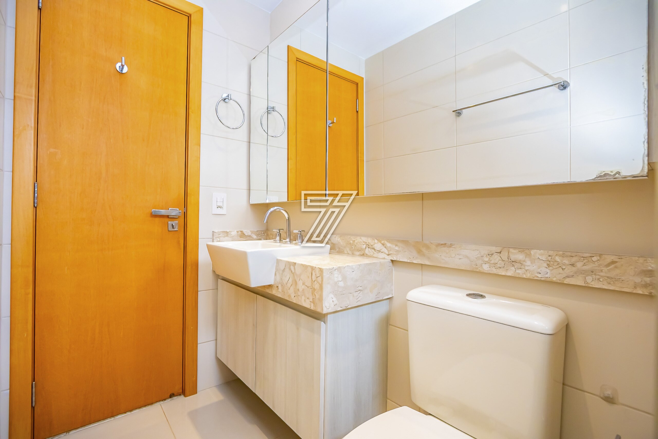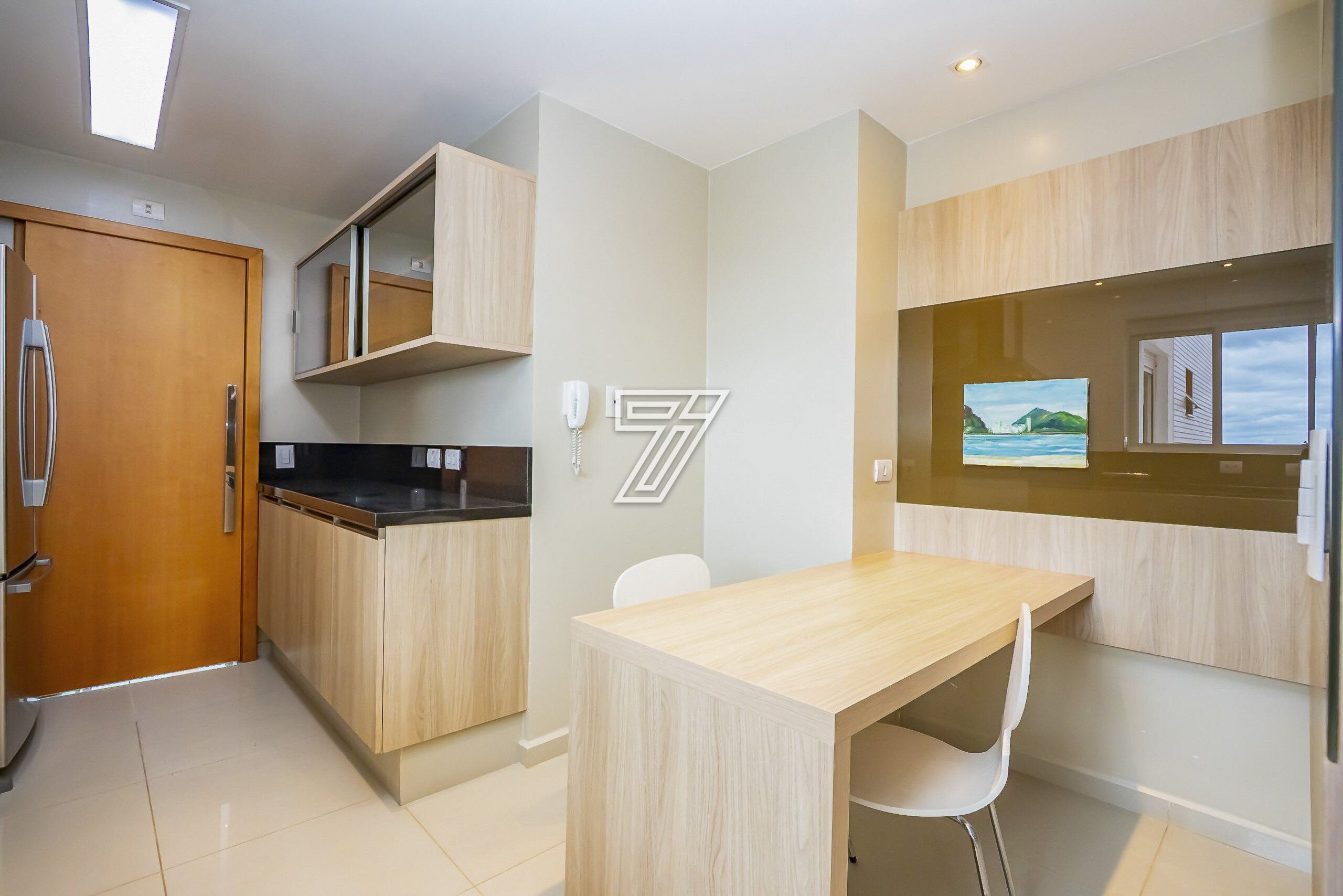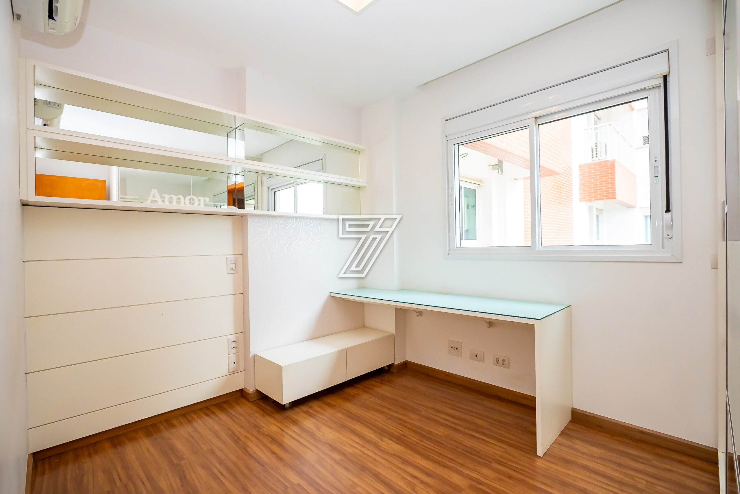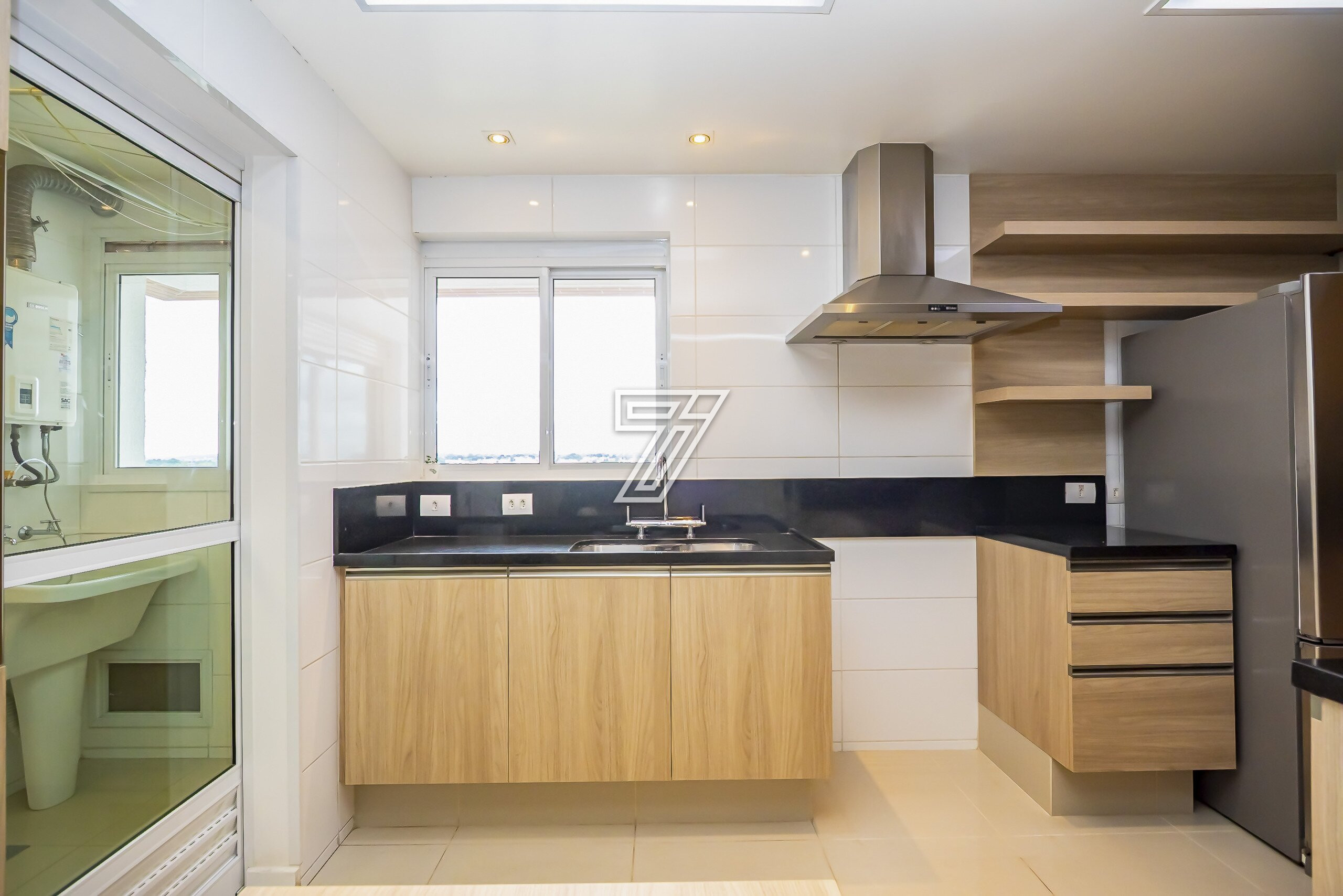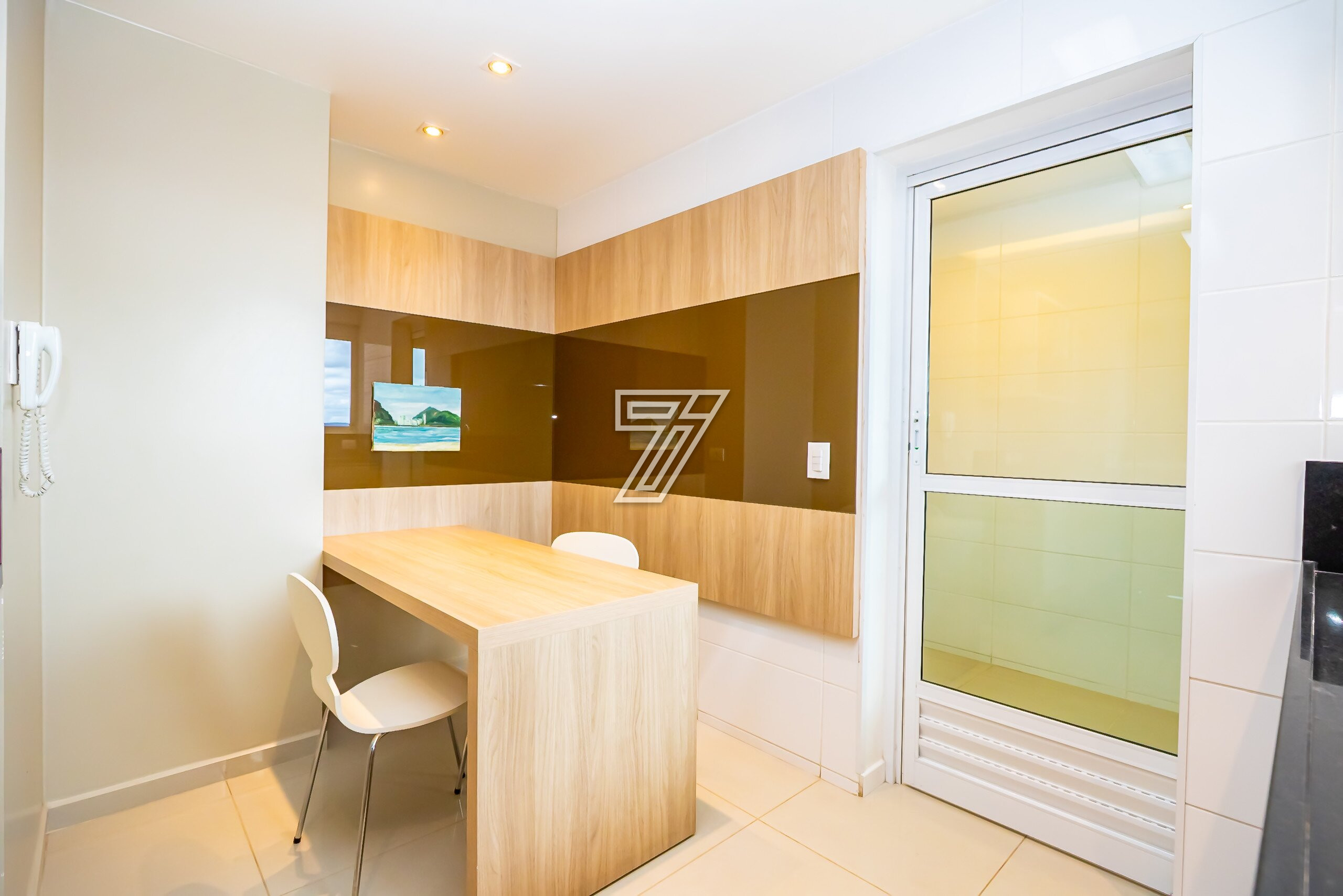 Apartamento 128m² com 3 quartos e três banheiros, sendo 1 suíte, 1 lavabo e com armários fixos em todos os cômodos e ar condicionados. Possui despensa.