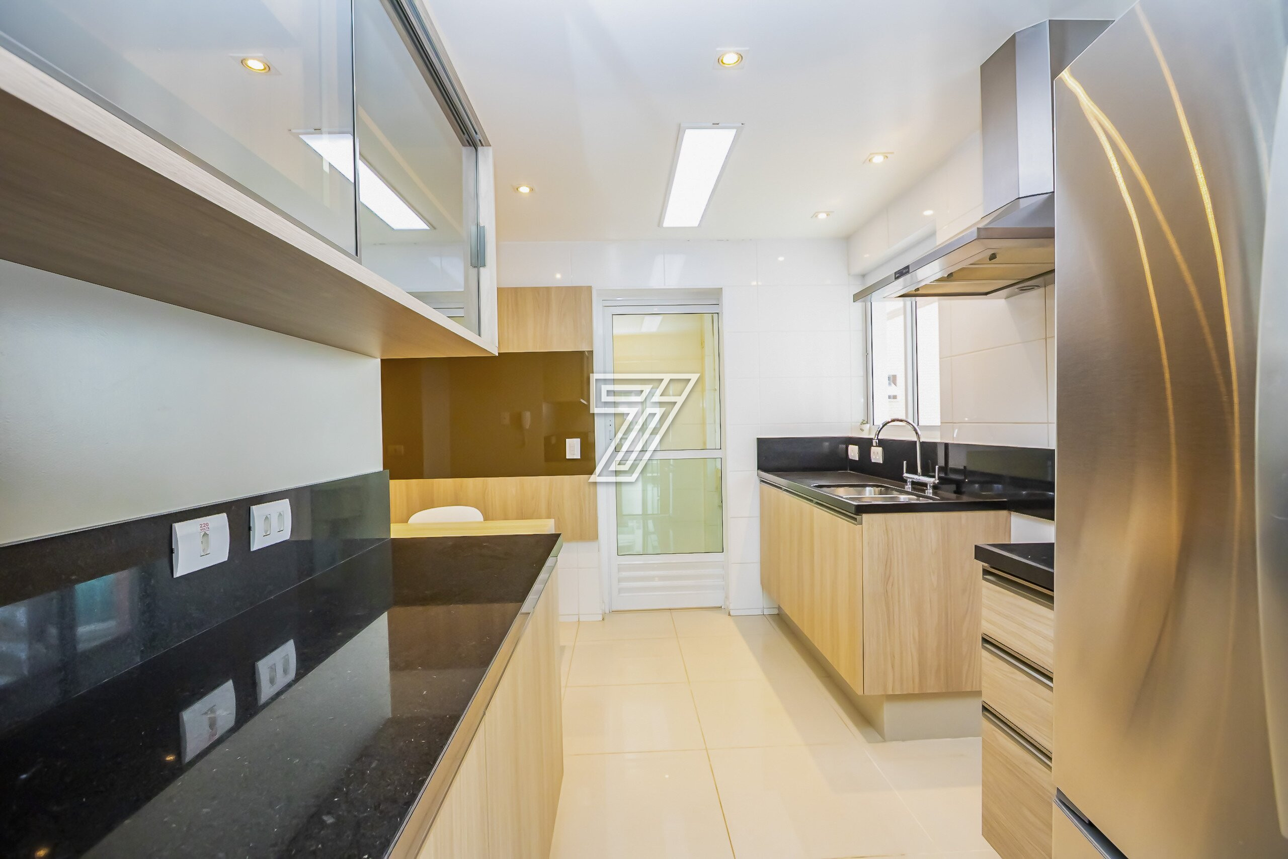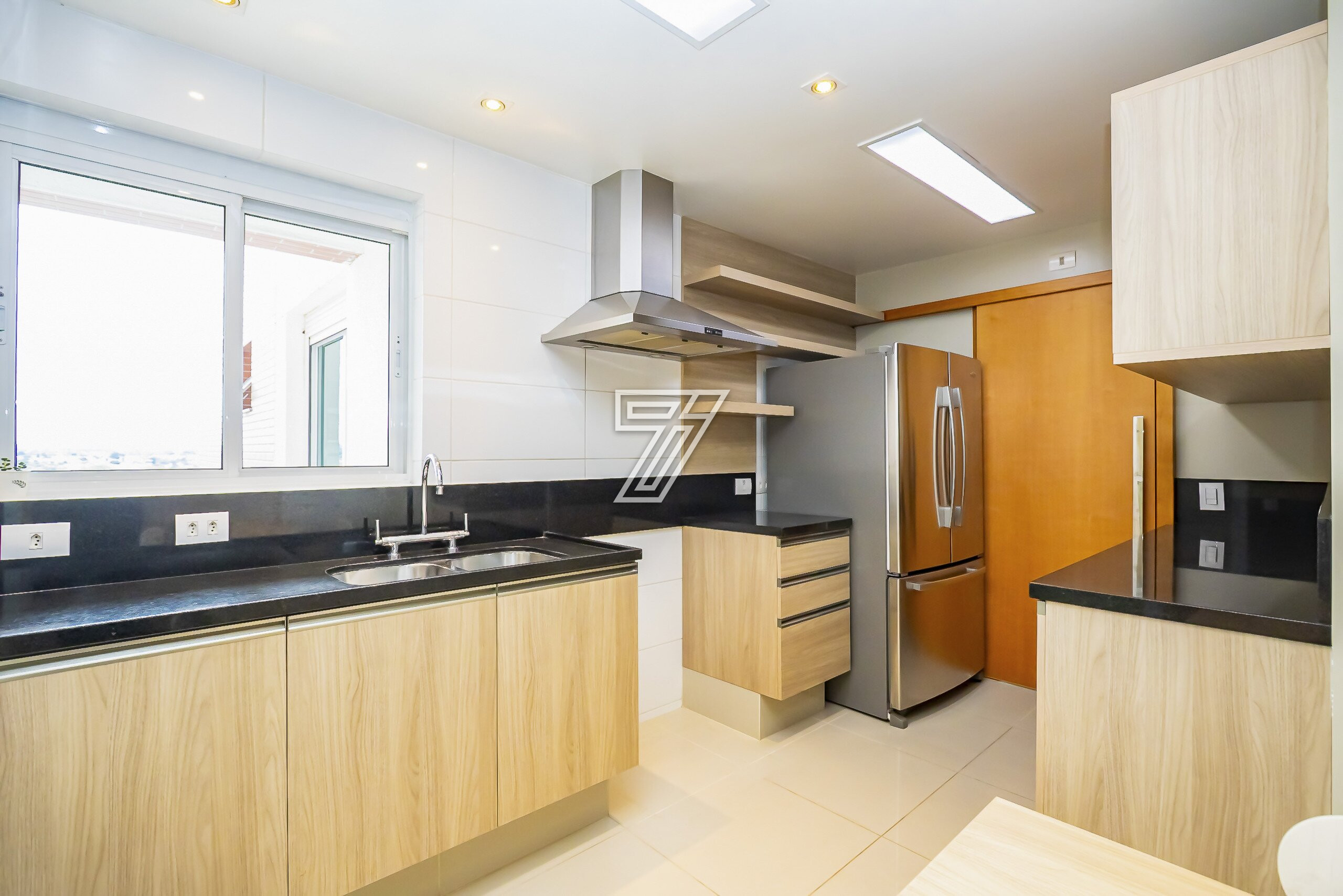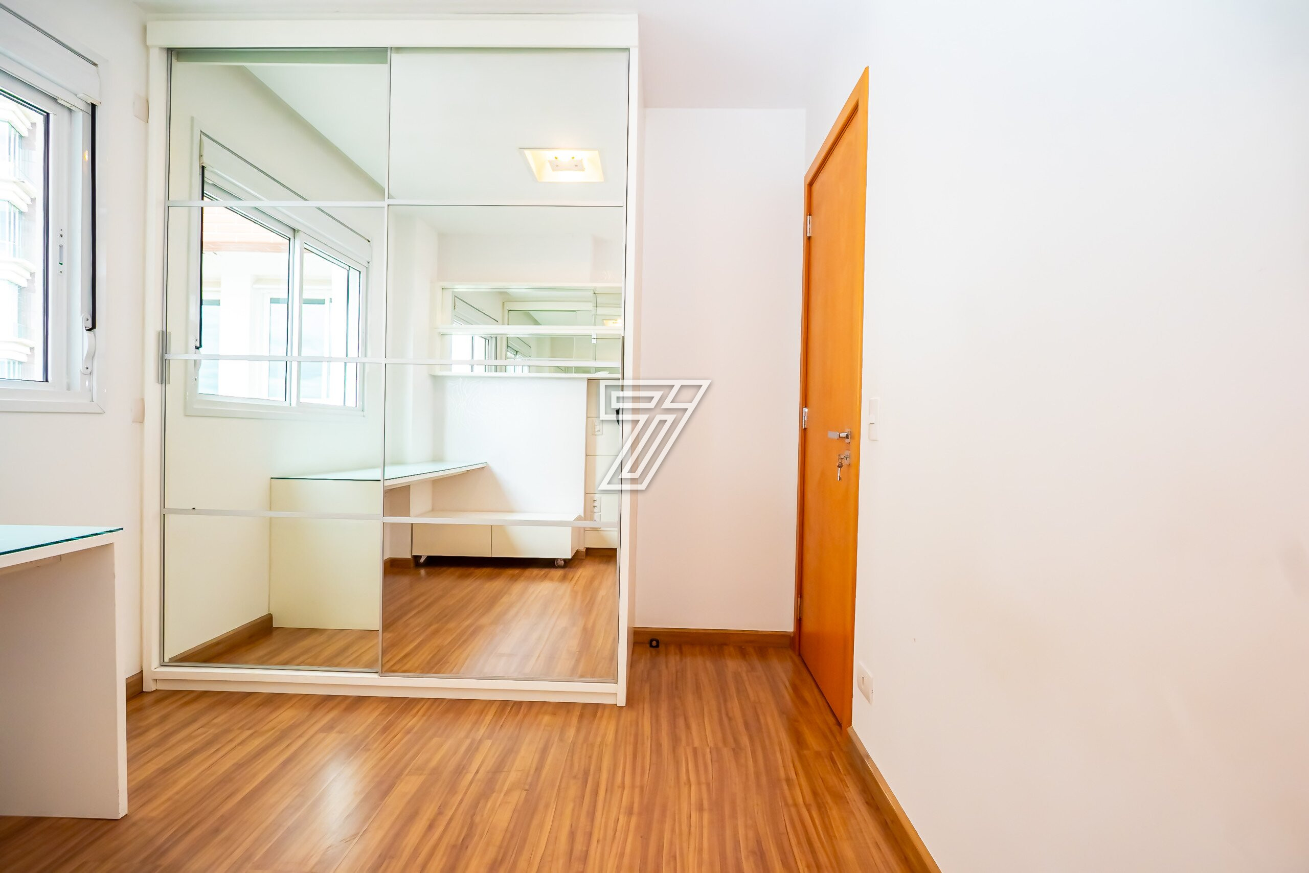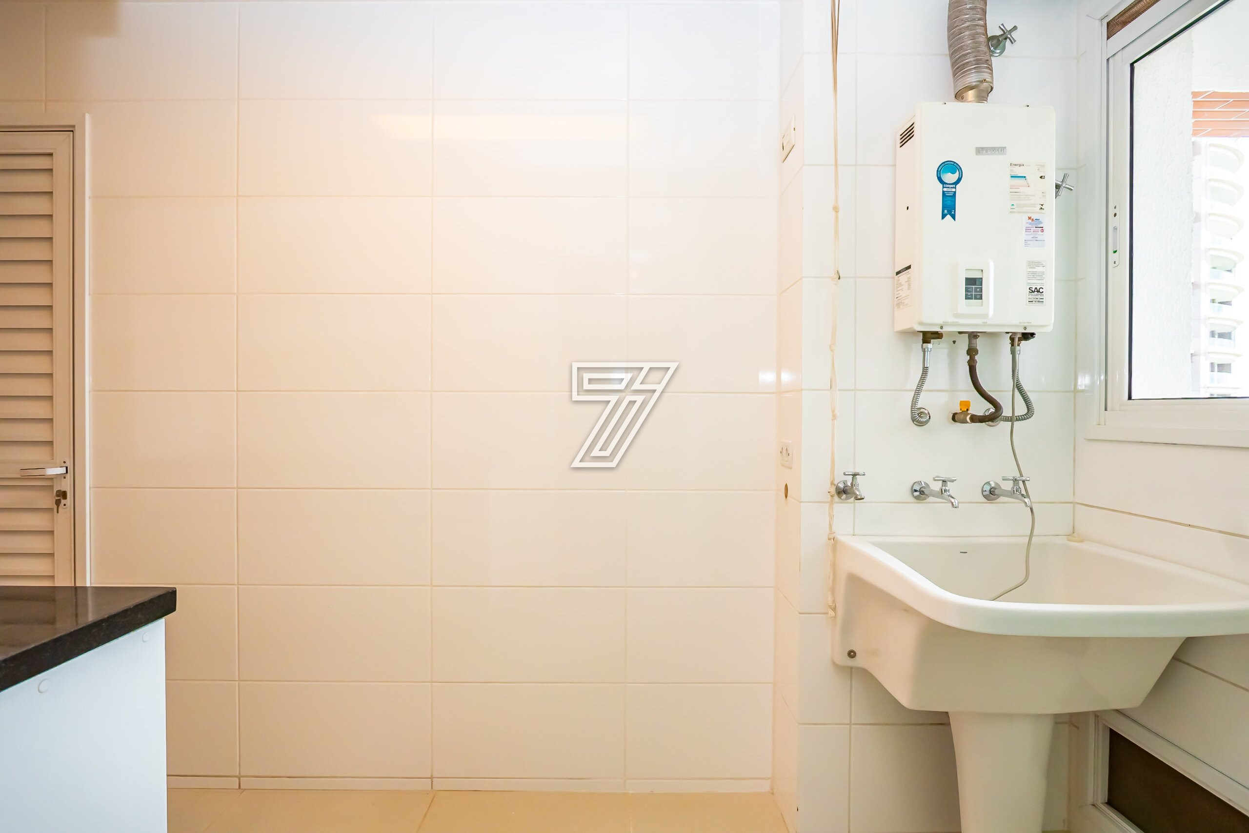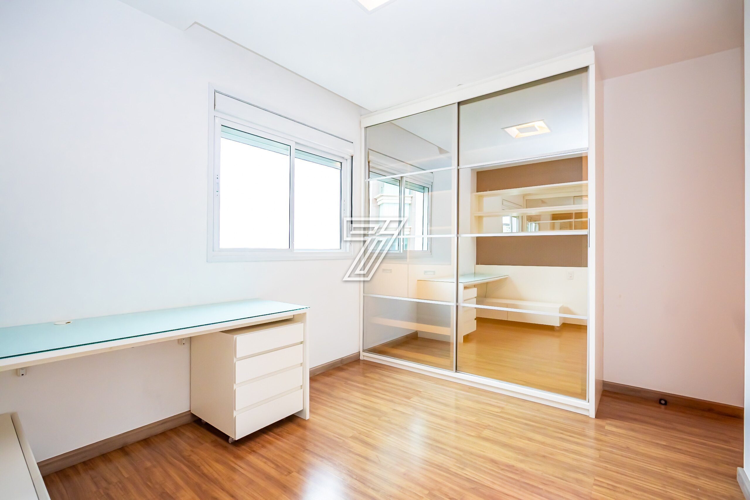 Apartamento 128m² com 3 quartos e três banheiros, sendo 1 suíte, 1 lavabo e com armários fixos em todos os cômodos e ar condicionados. Possui despensa.