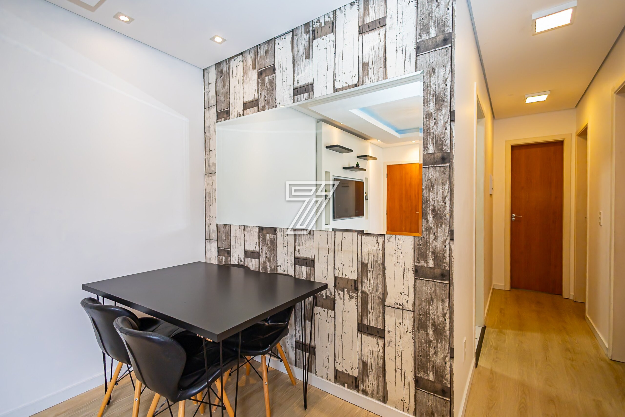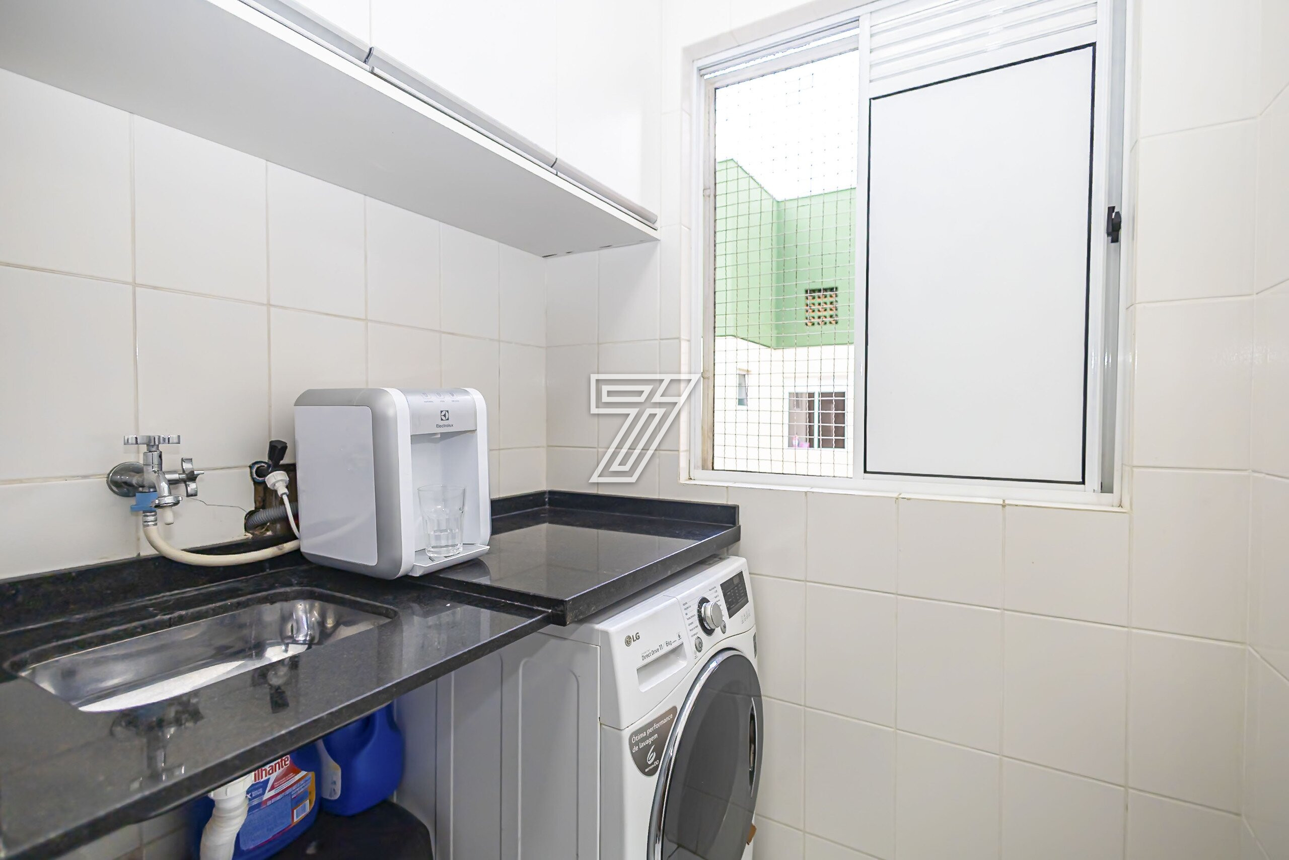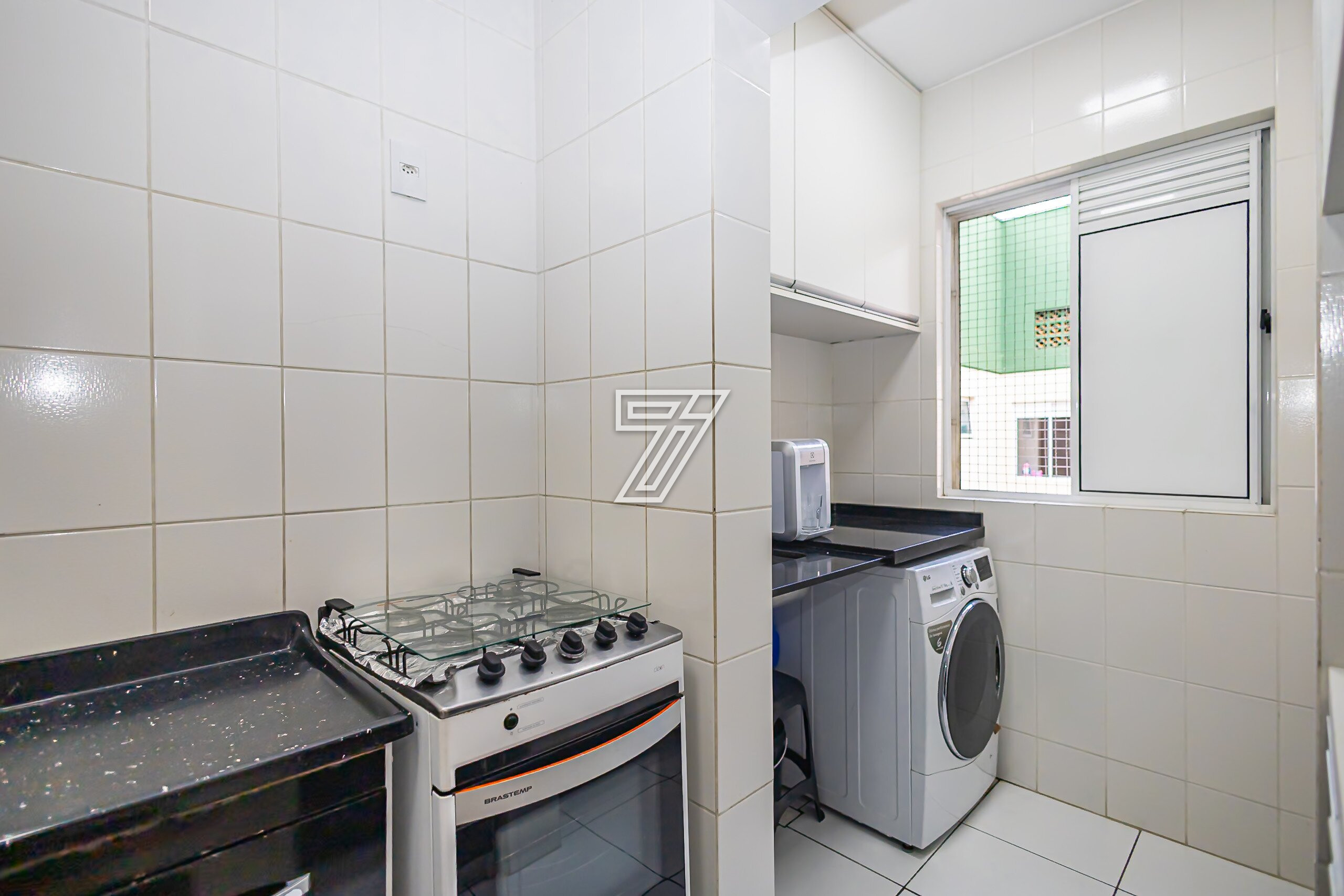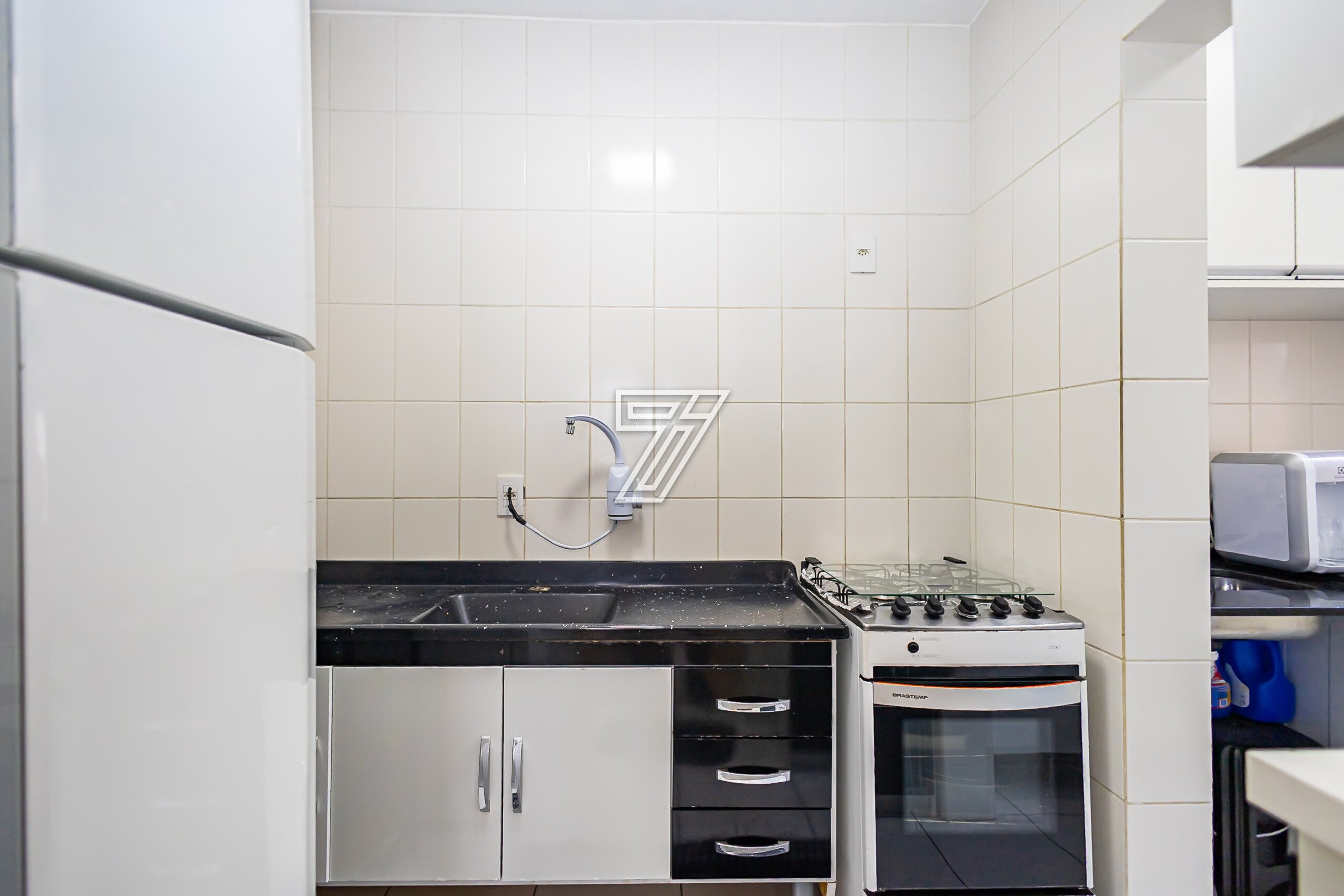Imóvel com excelente padrão de acabamento, sala com teto rebaixado em gesso, espelho, rack e papel de parede, 3 quartos (2 com móveis planejados e camas embutidas), piso vinílico impecável na área social e íntima, banheiro com box blindex e bancada em granito, cozinha e área de serviço com armários planejados.