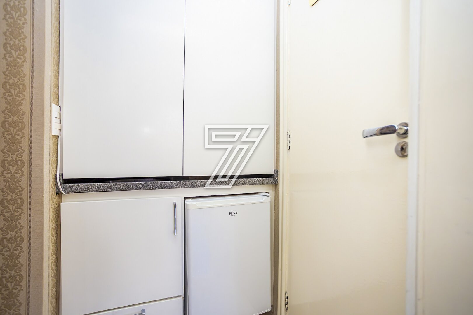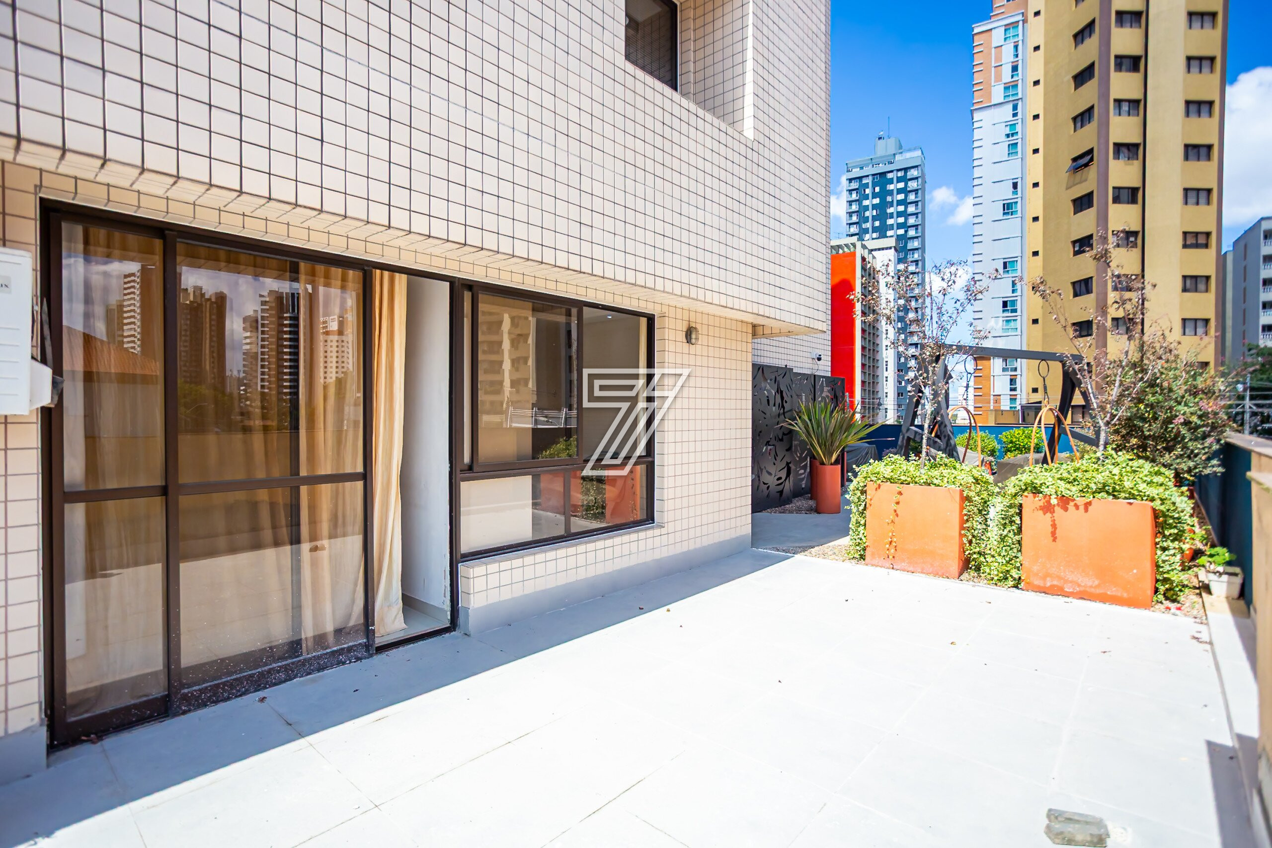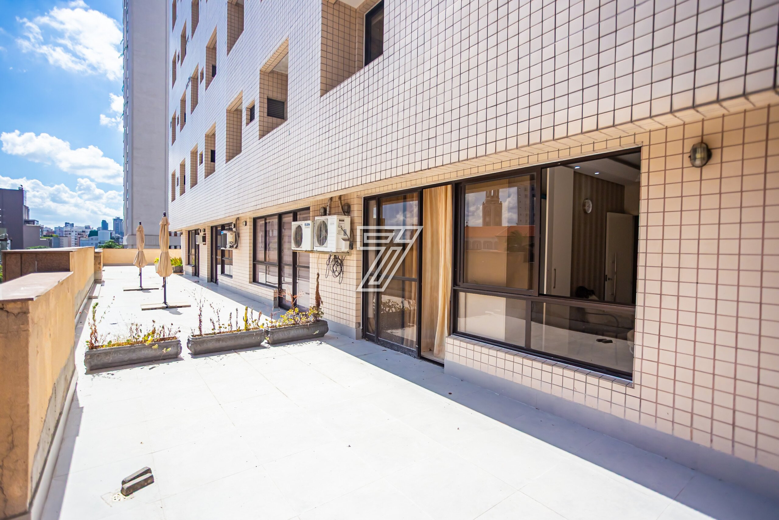 A área coberta de 30,89m² privativos está configurado hoje com recepção com frigobar, bebedouro e 2 cadeiras; copa com armário e microondas , bwc com chuveiro e box, 2 salas sendo uma delas com armários, e a outra com ar condicionado e acesso para uma área externa exclusiva de 22,32m². Sendo um total de 53,21m² privativos.