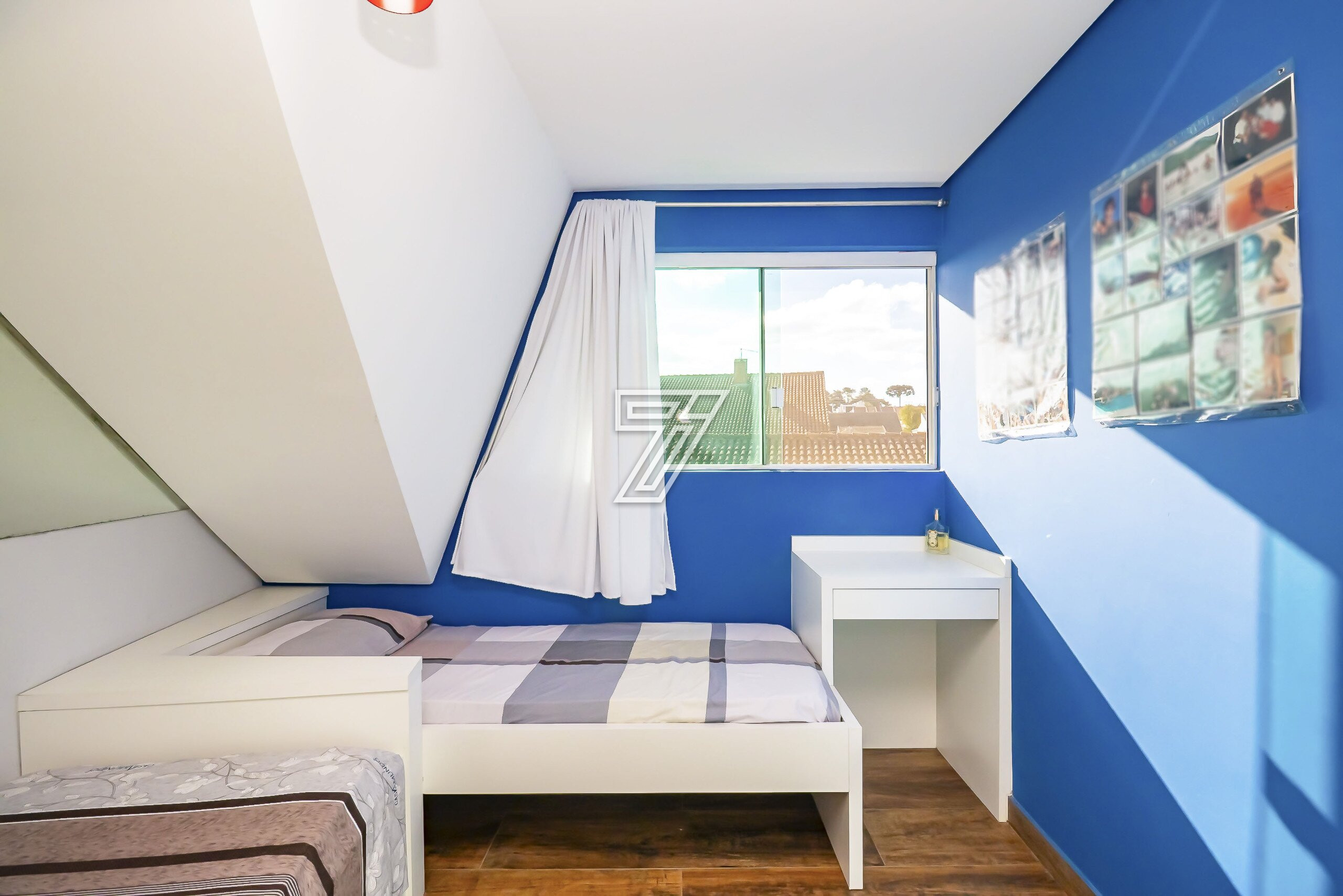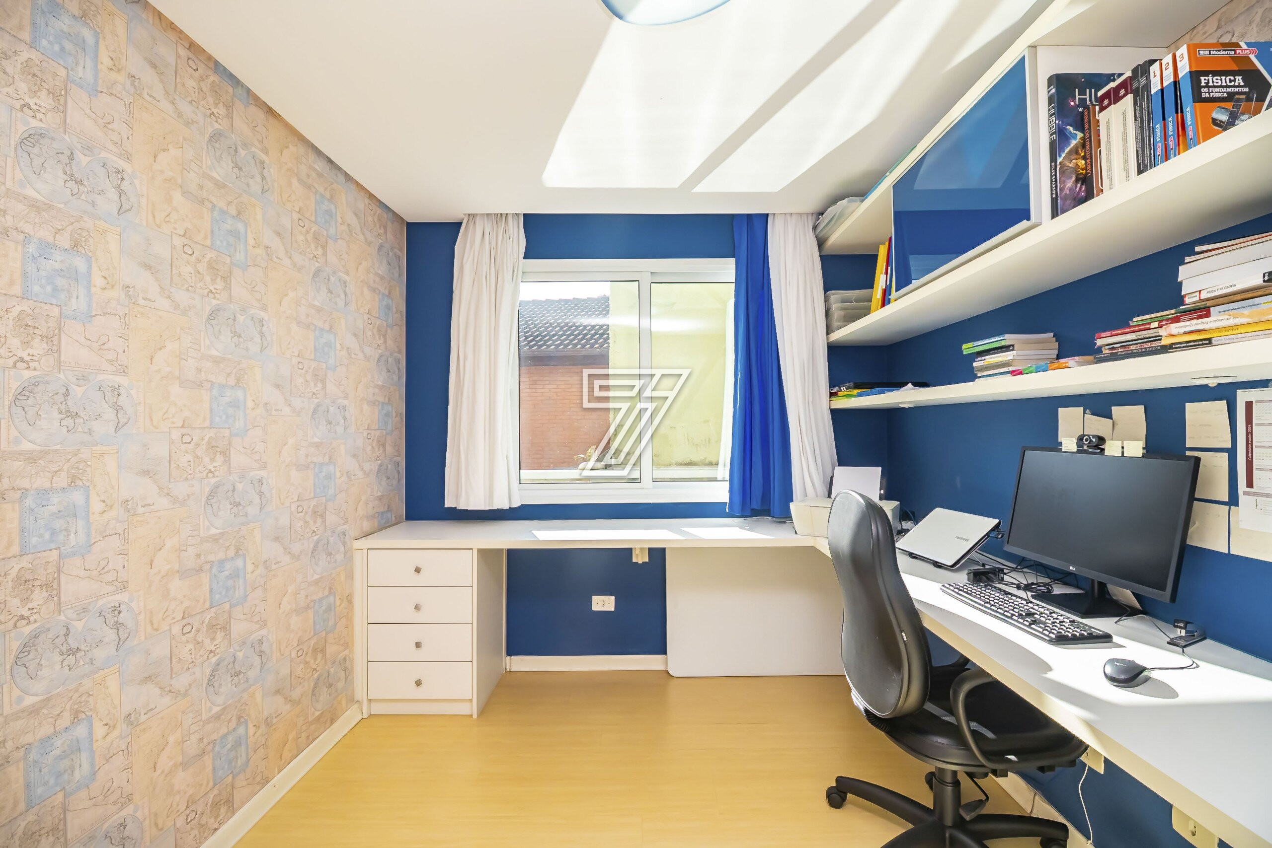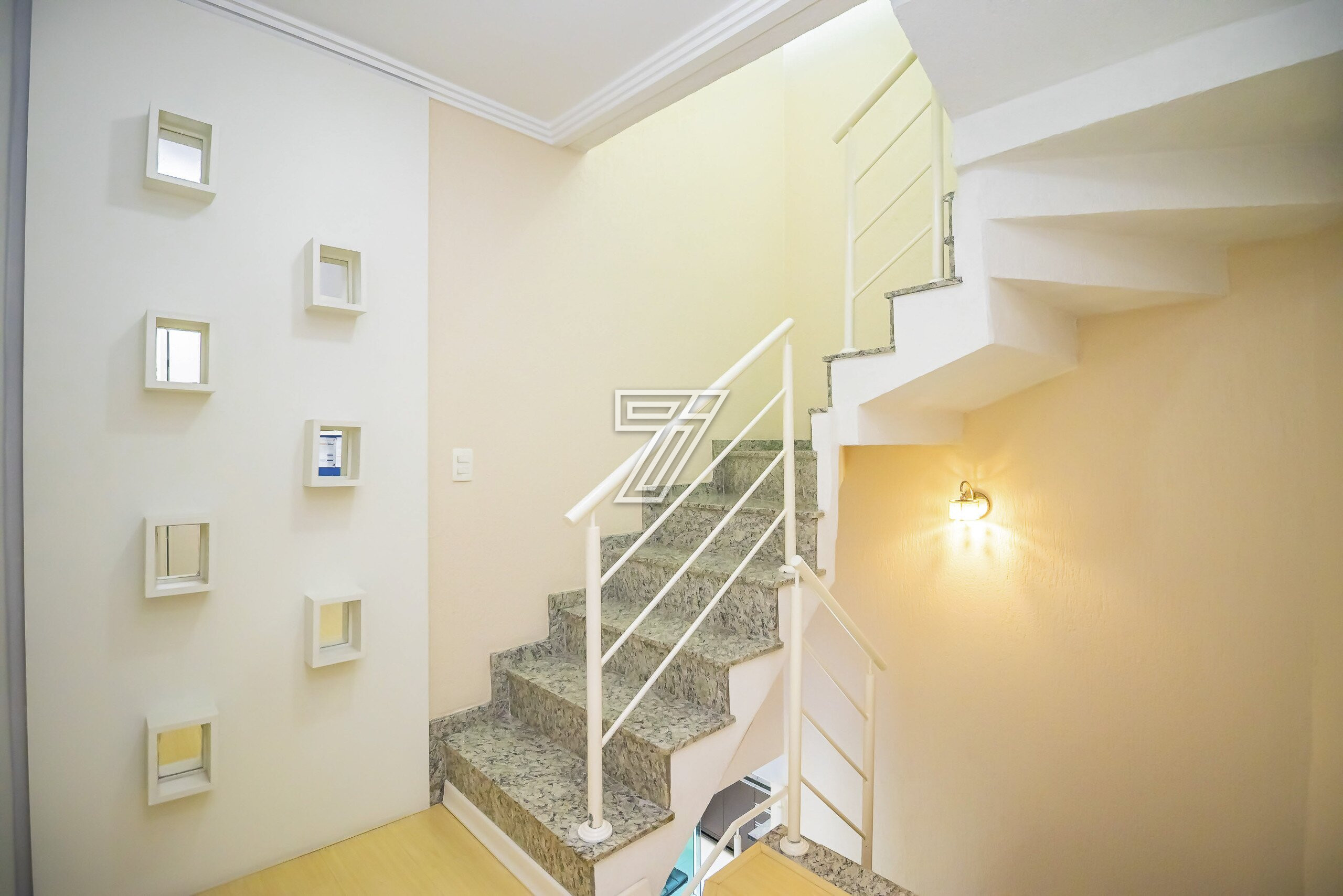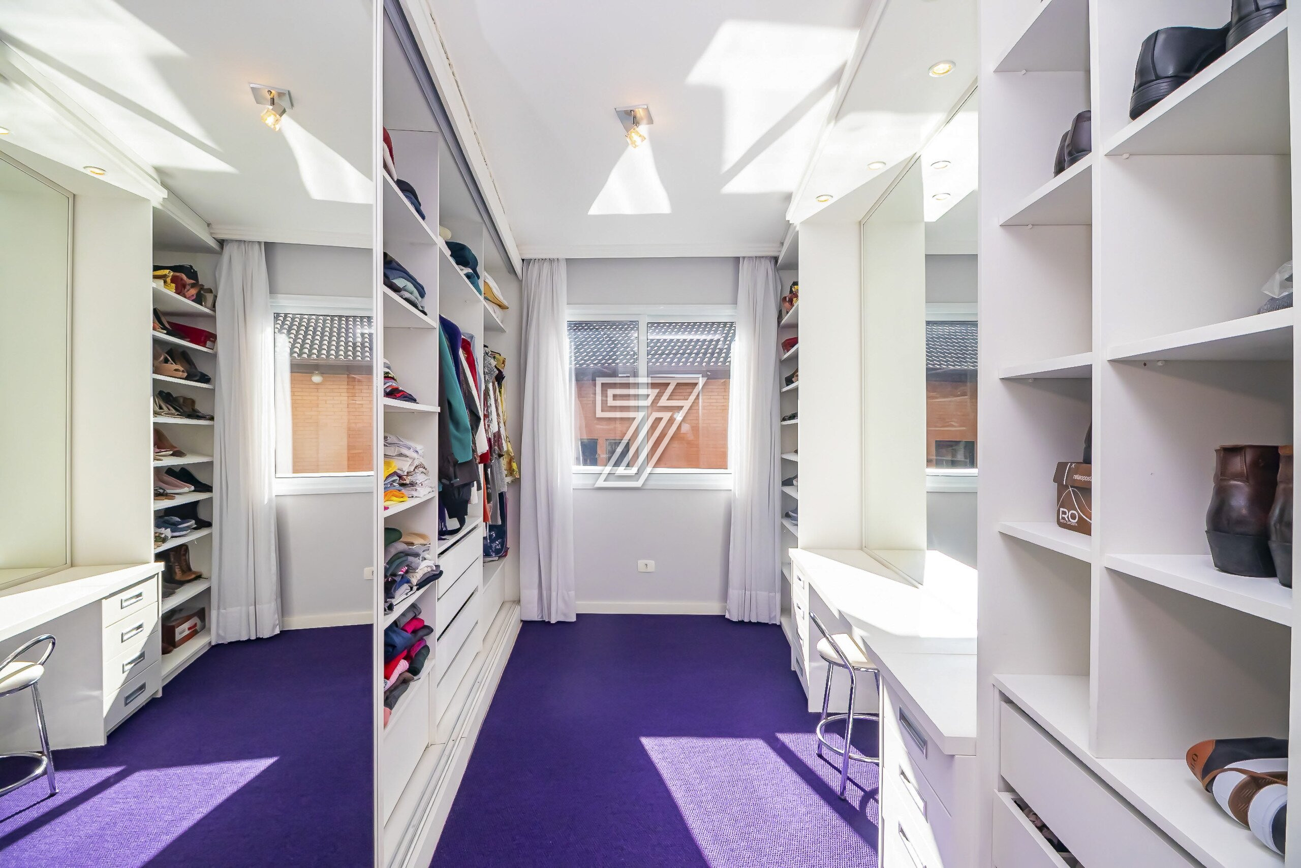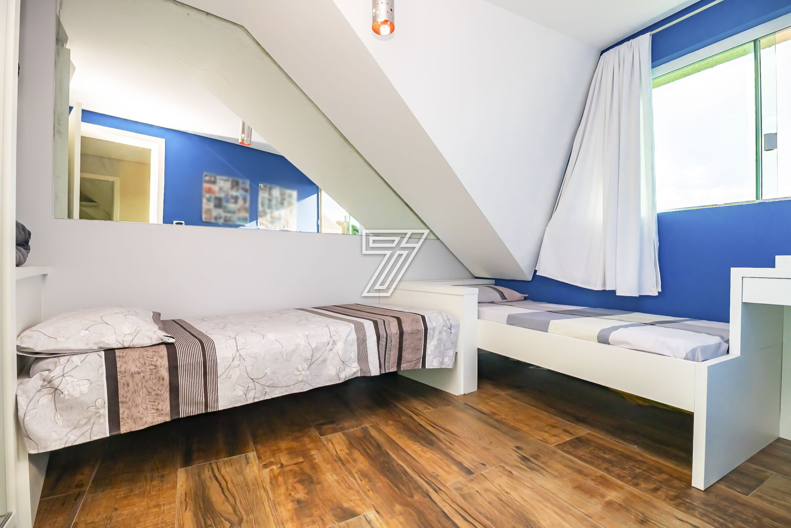 PISO SUPERIOR: hall, banheiro social, ampla suíte com armários (fica cama), bwc com hidromassagem, magnífico closet (dormitório foi transformado em closet/ reversível), porta janela da suíte e demais janelas desse pavimento são de Vidros Duplos propiciando um ótimo conforto de isolamento térmico e acústico, dormitório de solteiro com armários planejados.