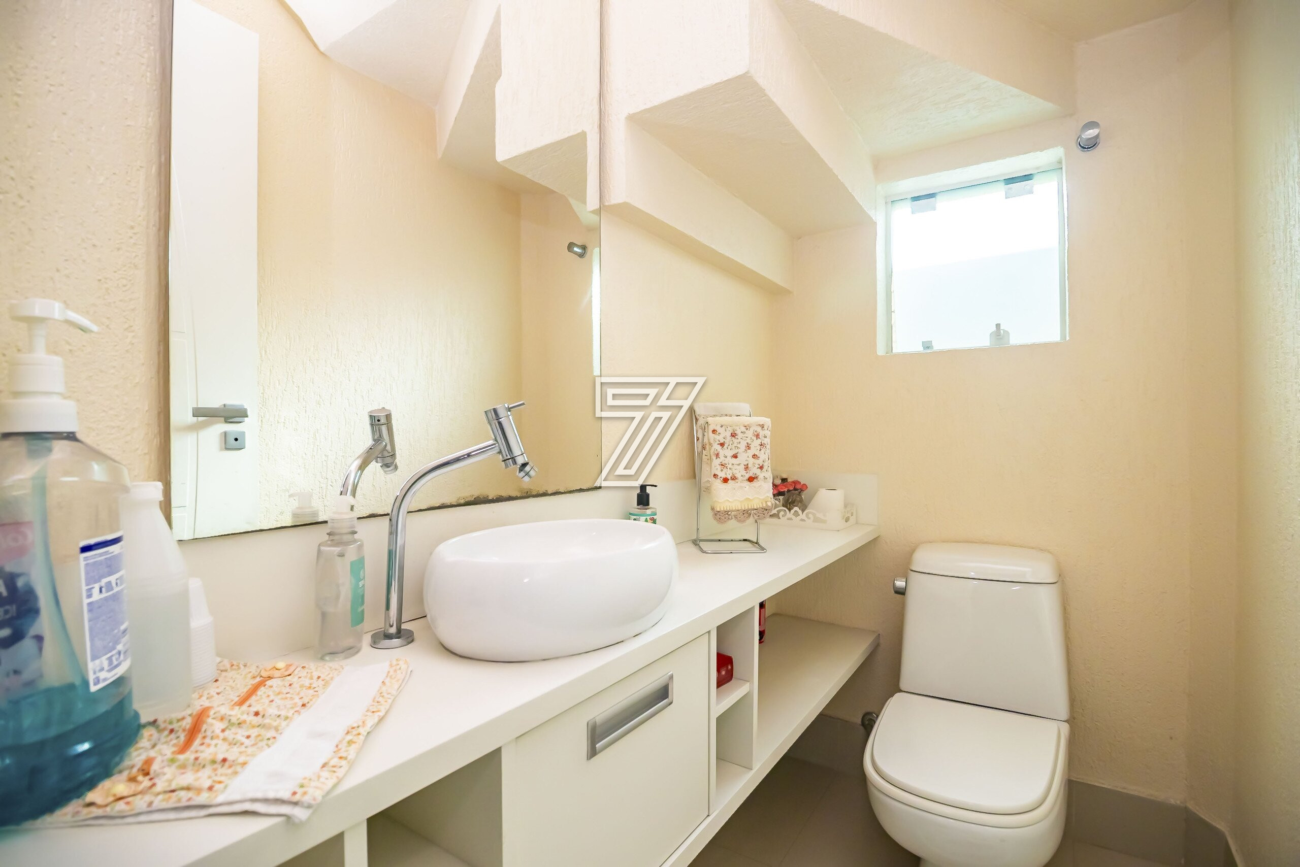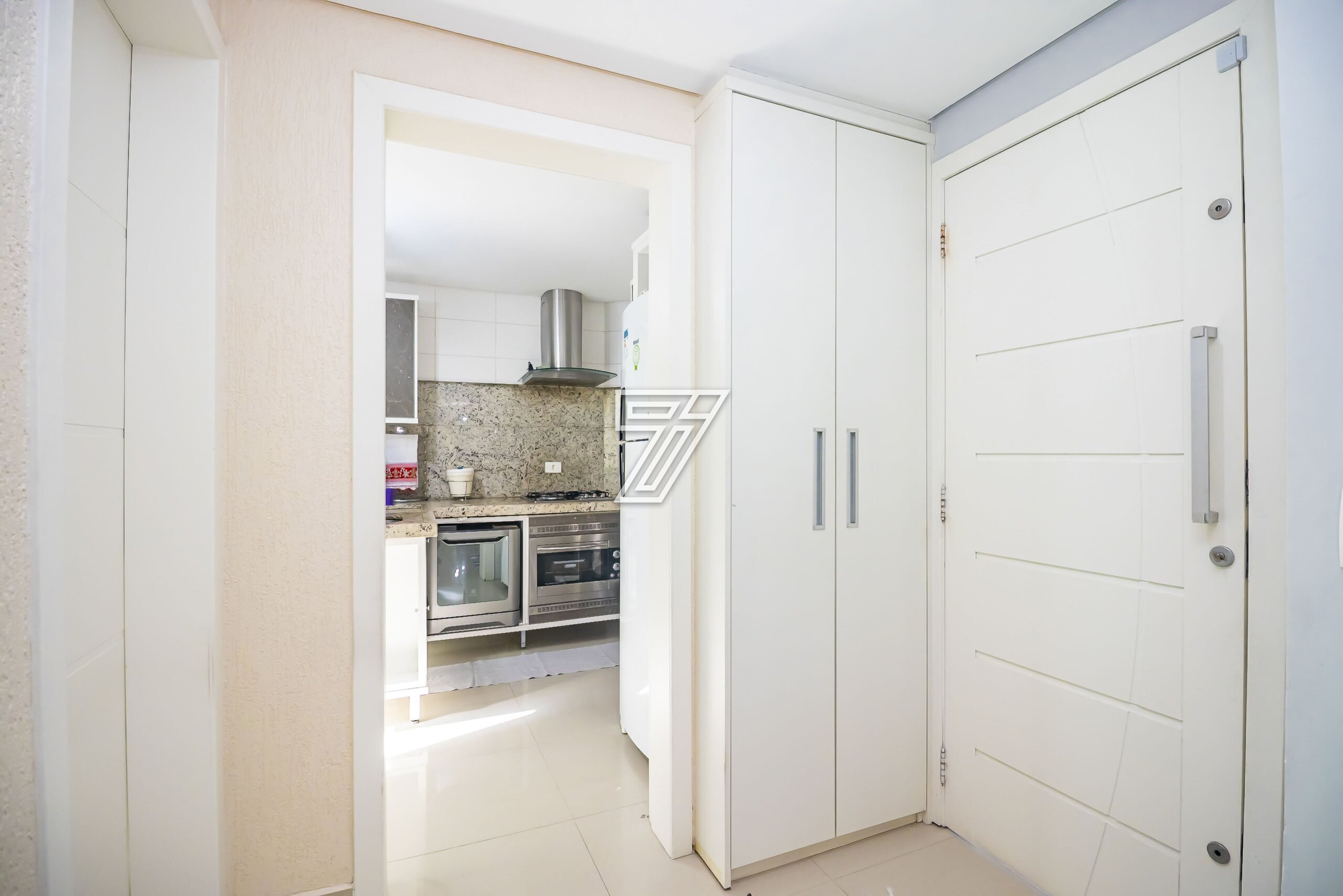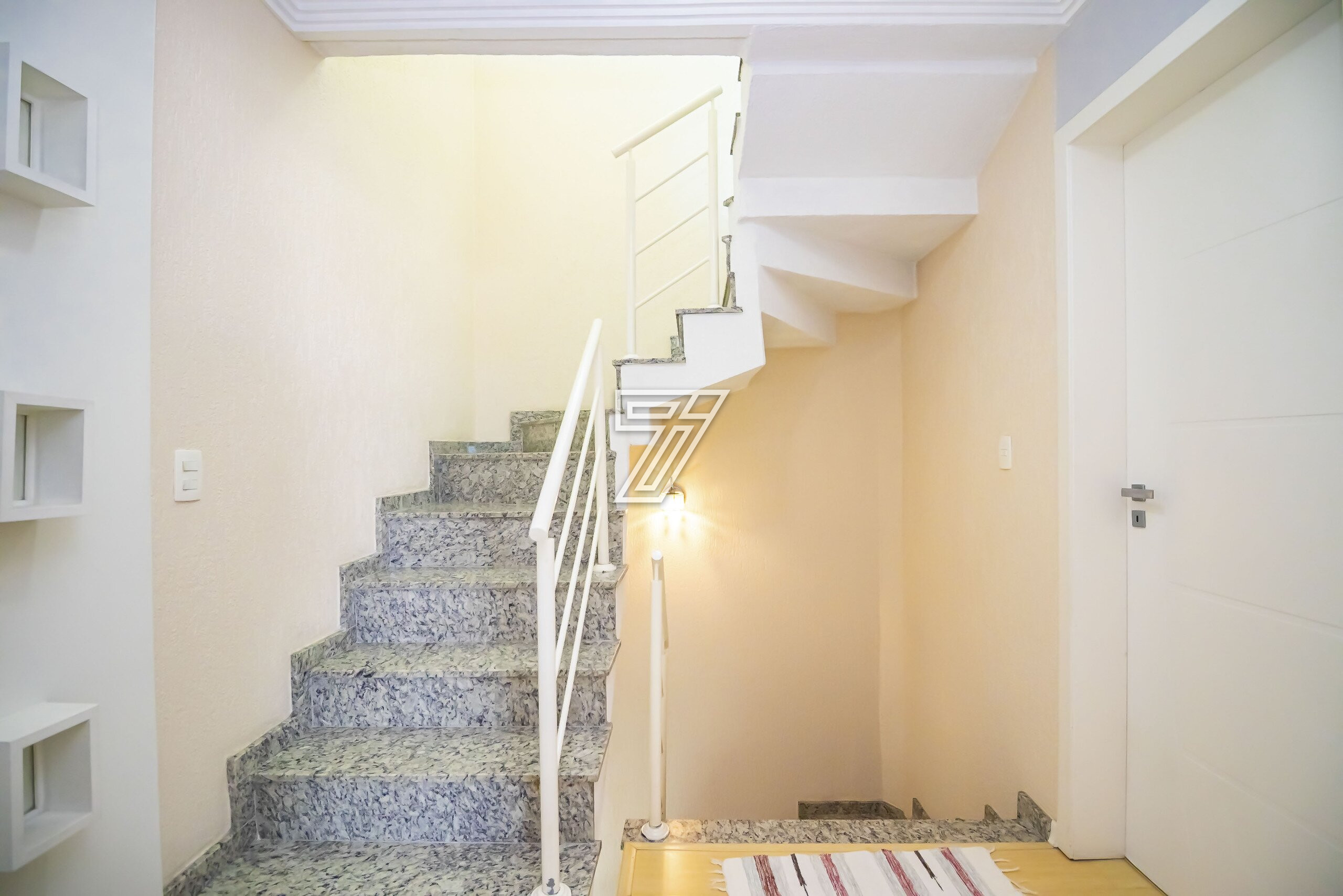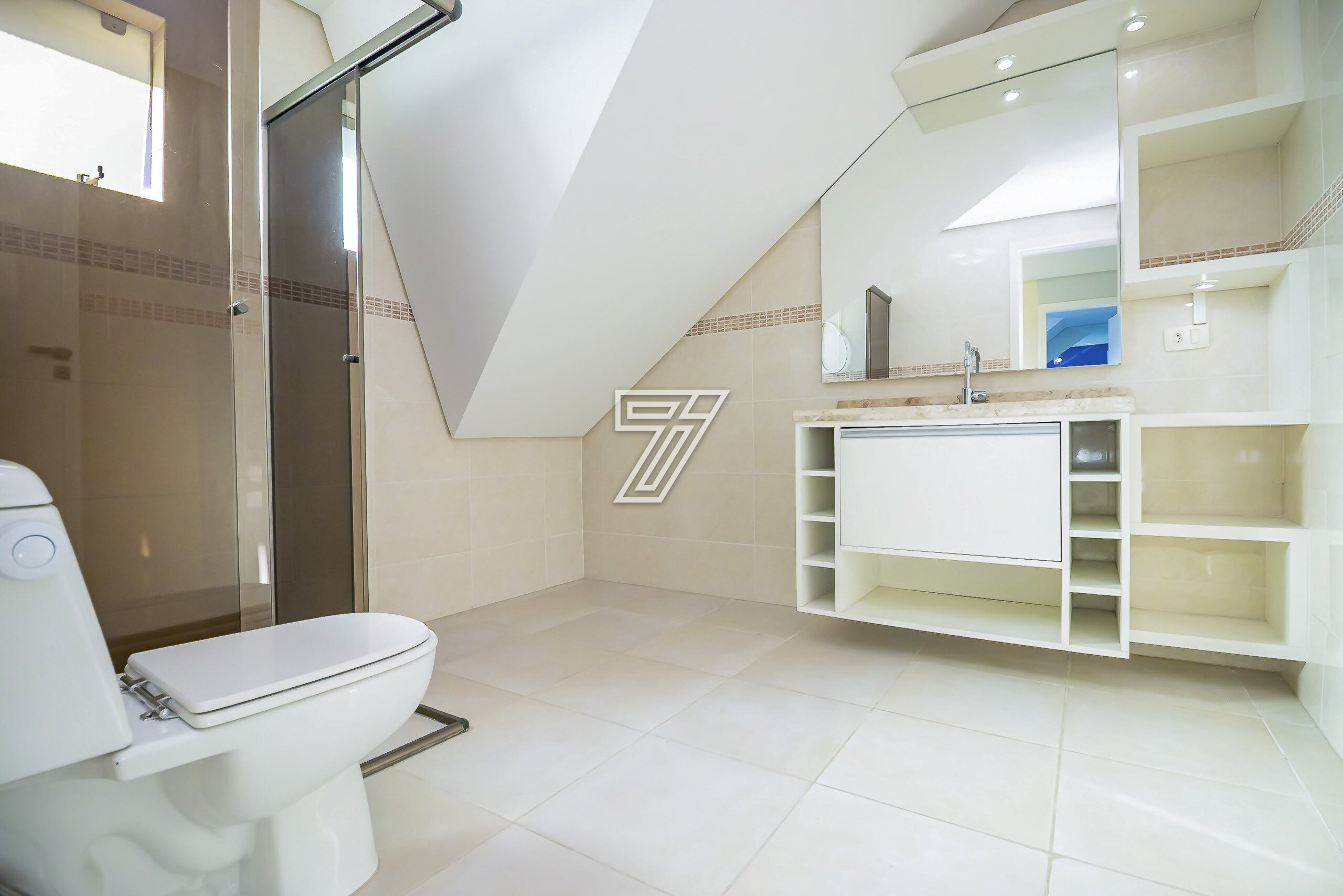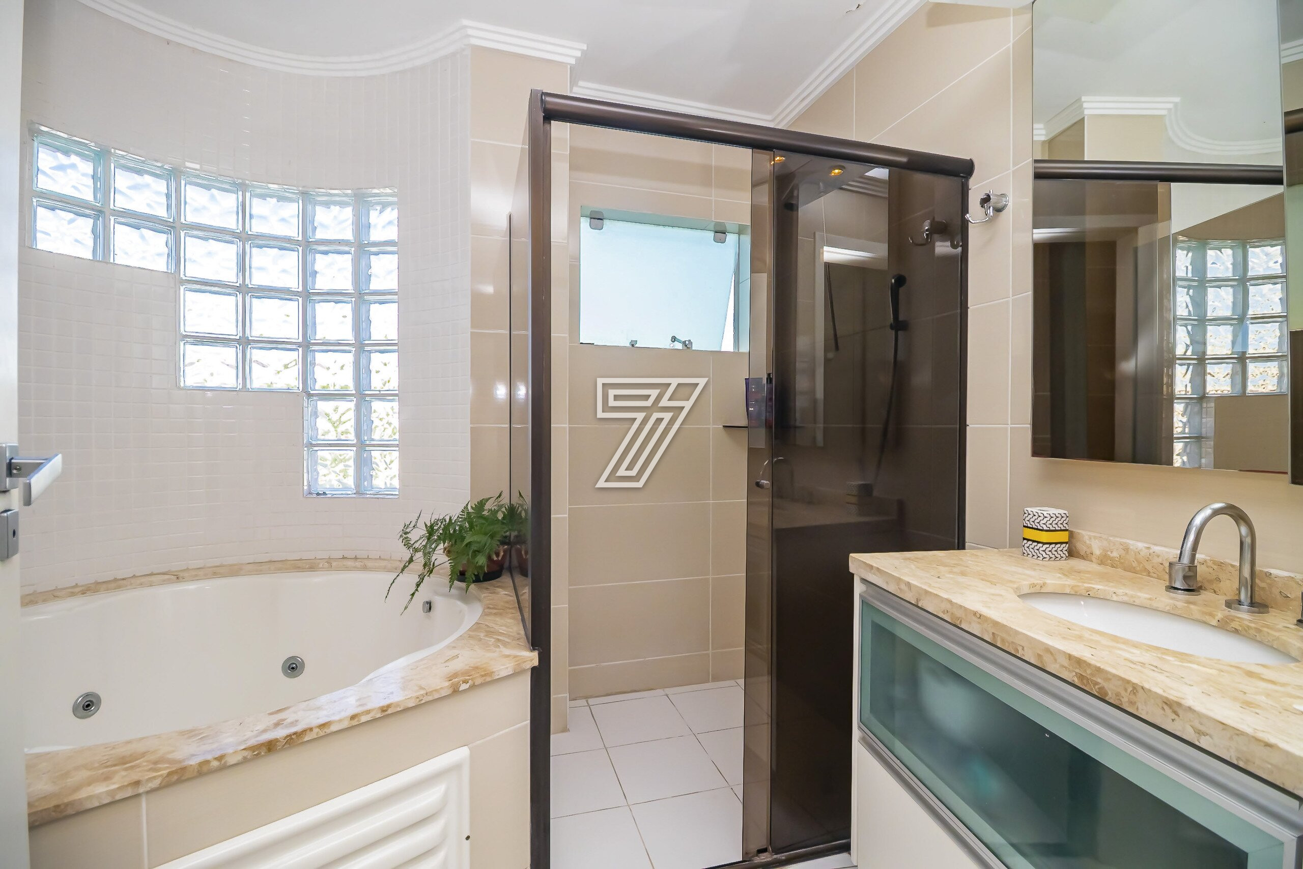 PISO SUPERIOR: hall, banheiro social, ampla suíte com armários (fica cama), bwc com hidromassagem, magnífico closet (dormitório foi transformado em closet/ reversível), porta janela da suíte e demais janelas desse pavimento são de Vidros Duplos propiciando um ótimo conforto de isolamento térmico e acústico, dormitório de solteiro com armários planejados.
