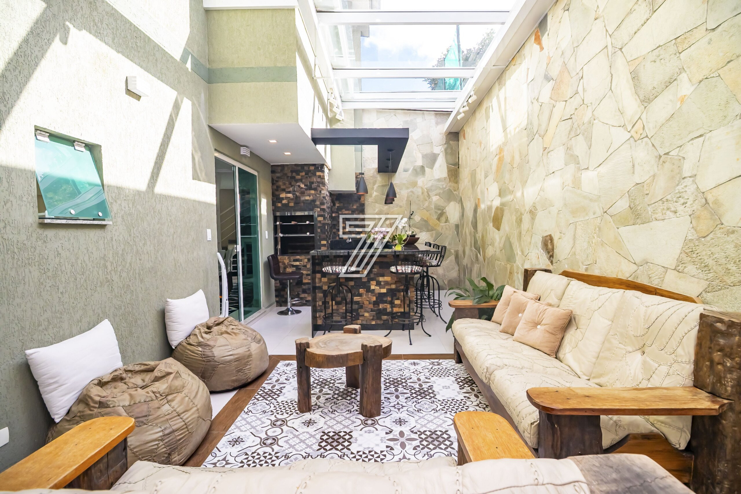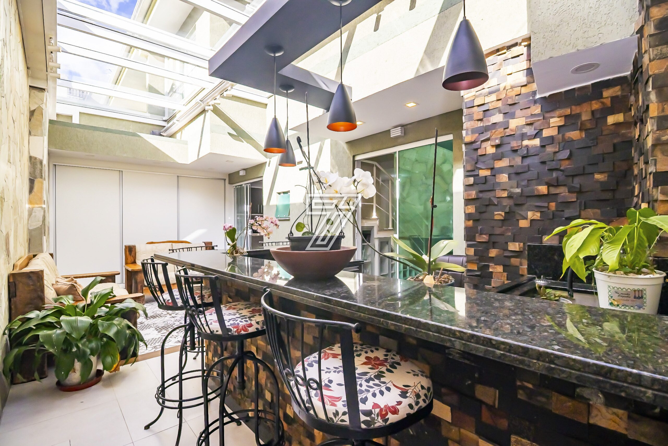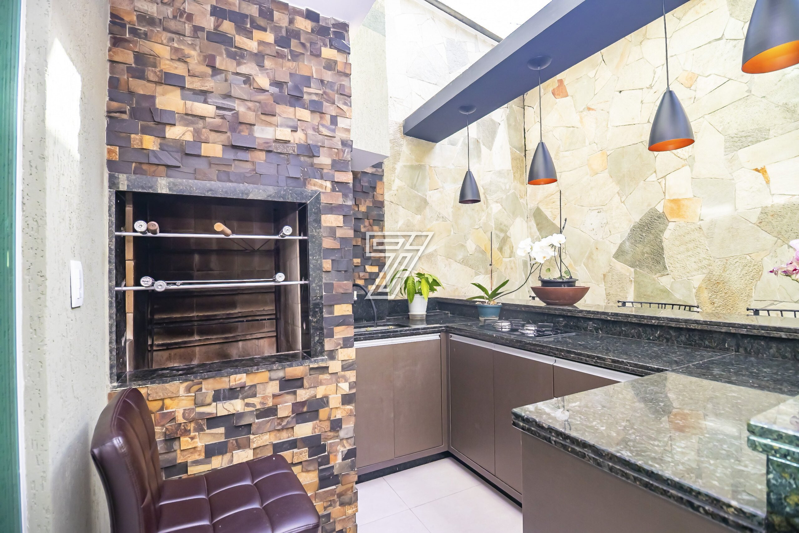 Sua composição no PISO TÉRREO: hall, lavabo, salas estar/ jantar (ficam mesa, estante planejada e tapetes), cozinha com móveis planejados (ficam fogão, coifa e forno elétrico) e espaço gourmet (fundos), com churrasqueira, teto retrátil e projeto luminotécnico (ficam sofá 3-2 lugares + mesa madeira), lavanderia.