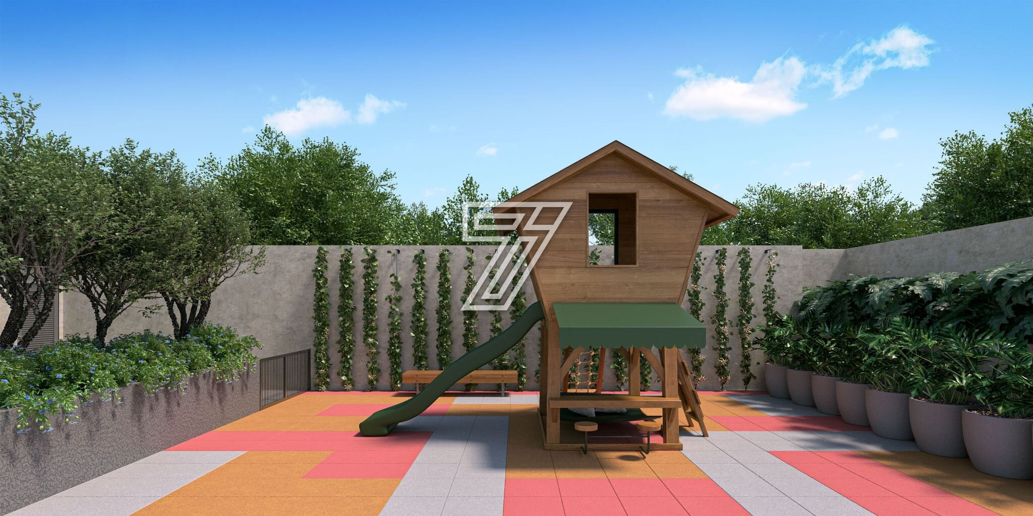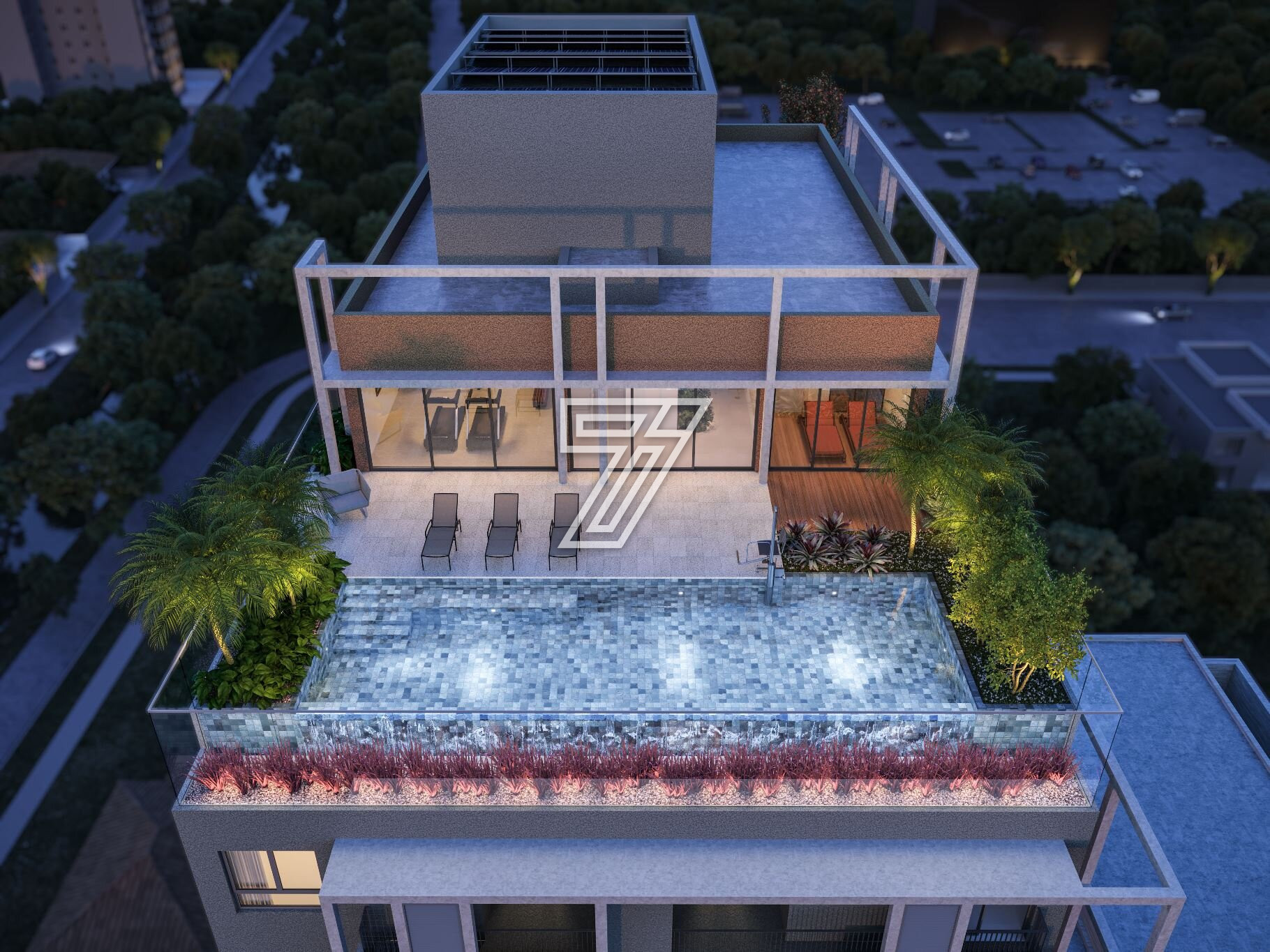 Concebida em bloco único e com volume compacto bem plantado no terreno, a torre apresenta a simetria dos gradis como princípio compositivo, que se alternam entre floreiras do térreo ao rooftop. Essas inserções de verde dão respiro a fachada.